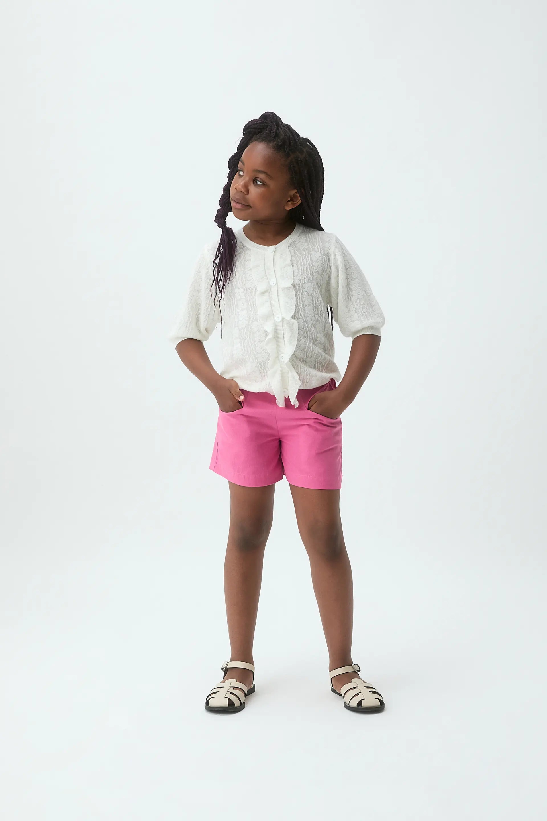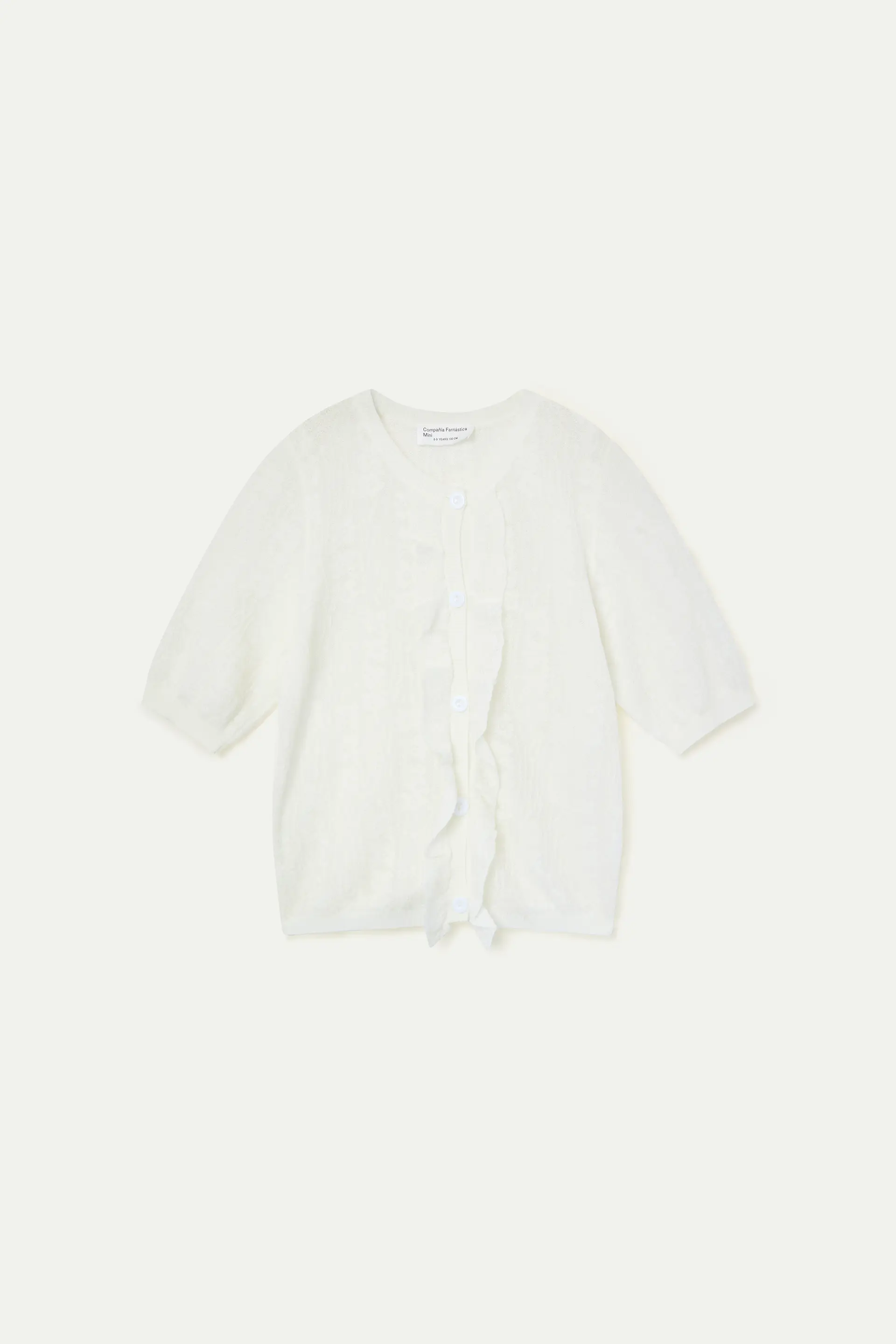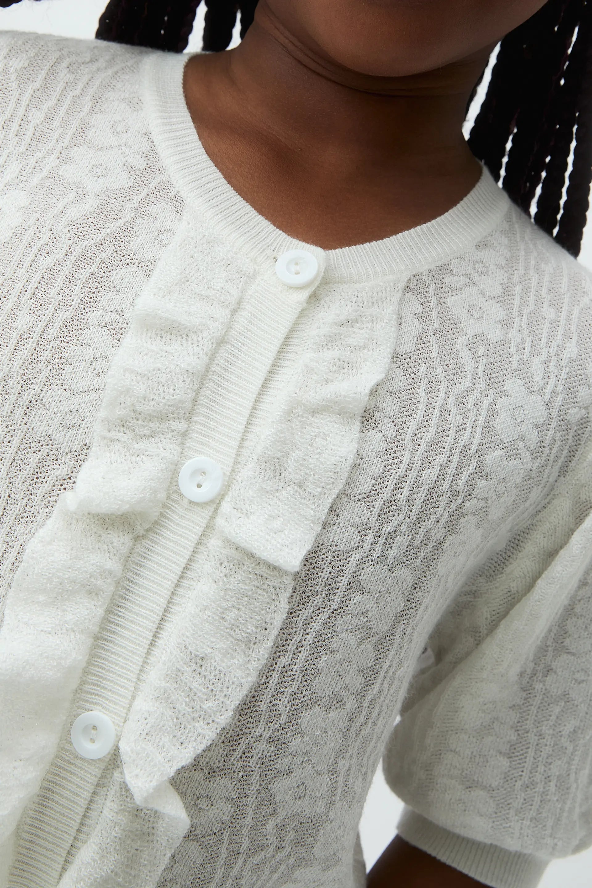 Cárdigan de niña con tejido de punto de color blanco. Cuello redondo y manga 3/4. Cierre frontal con botones blancos. Detalles en flecos. La modelo mide 133 cm y lleva la talla 8-9 años.