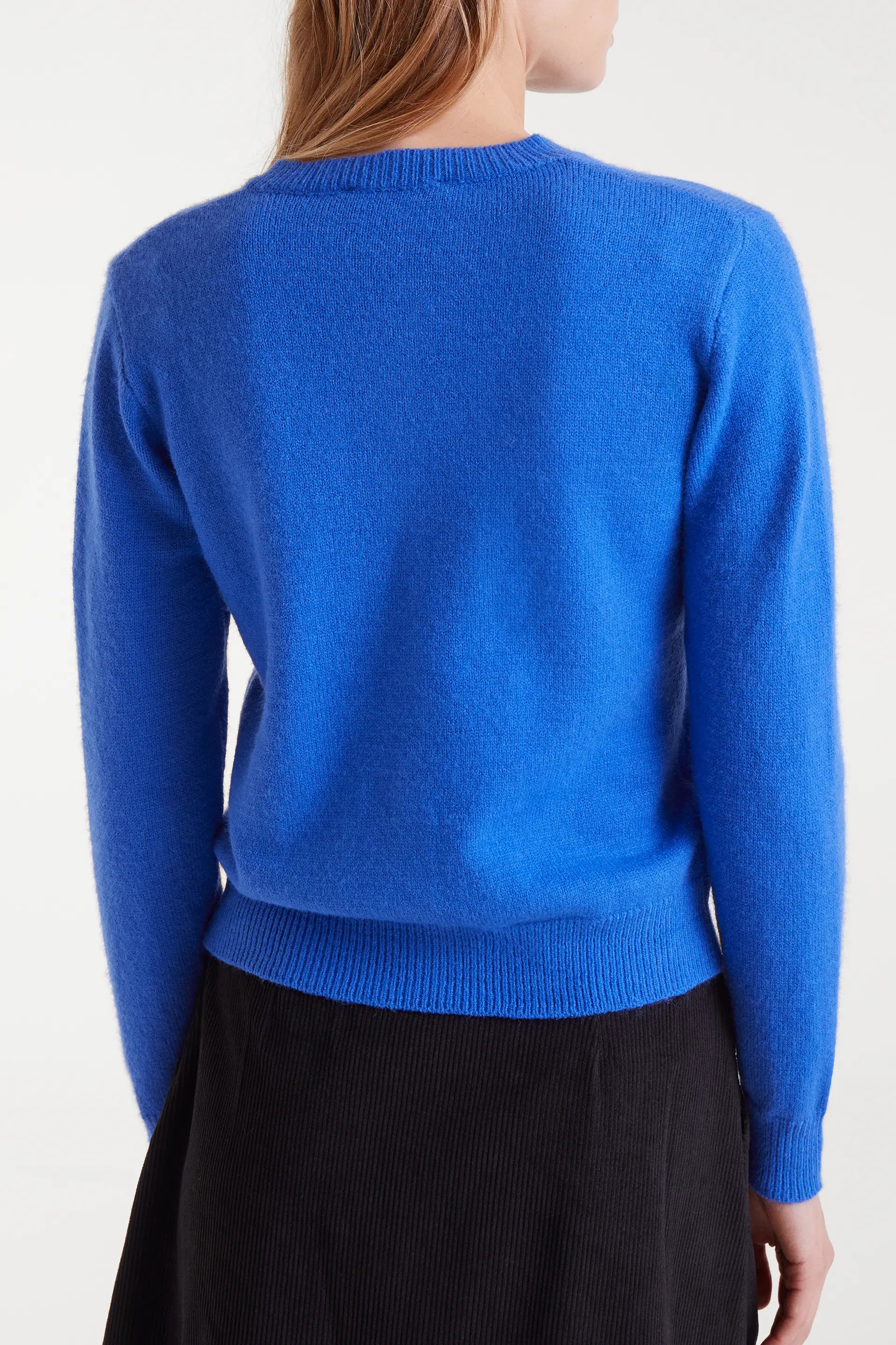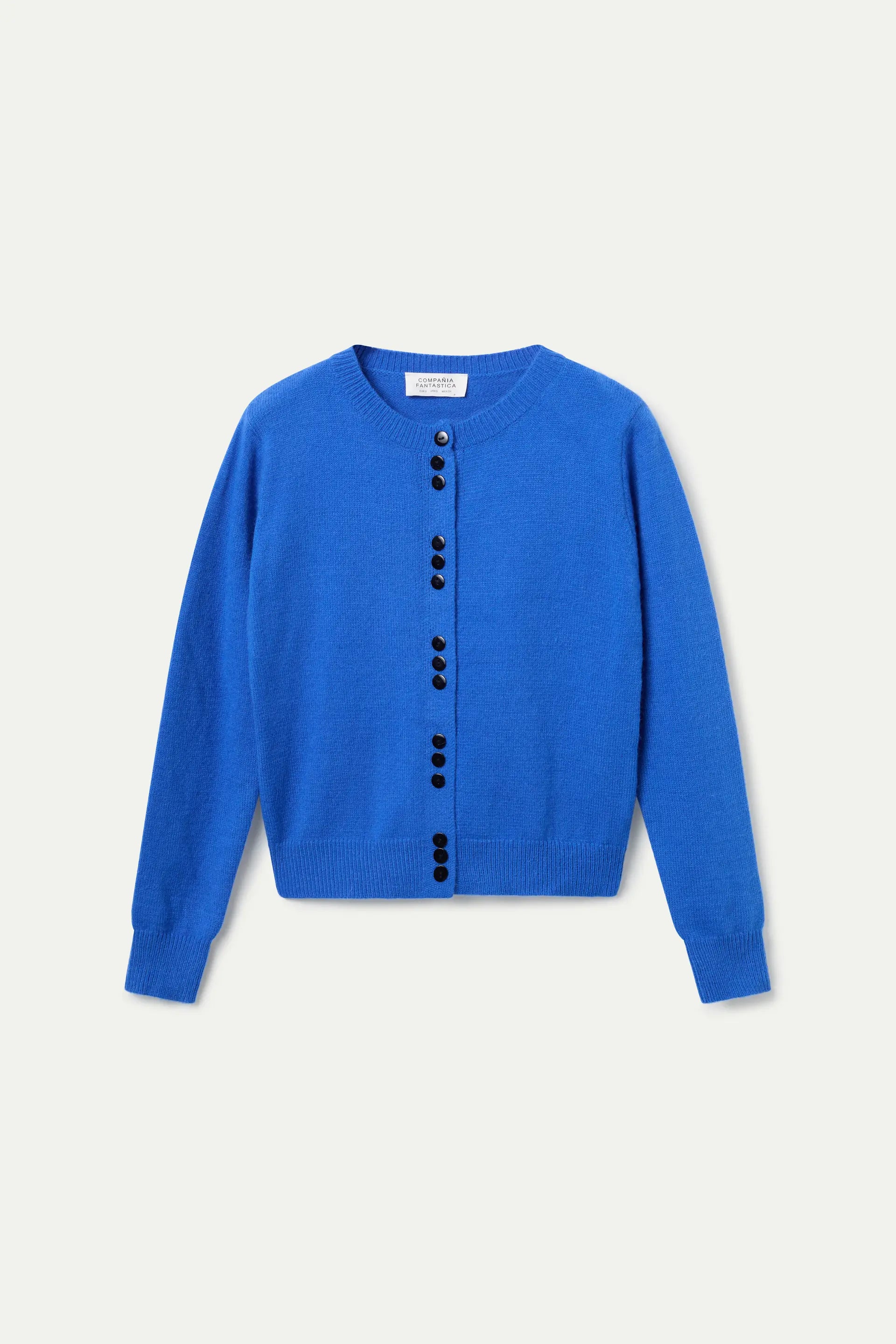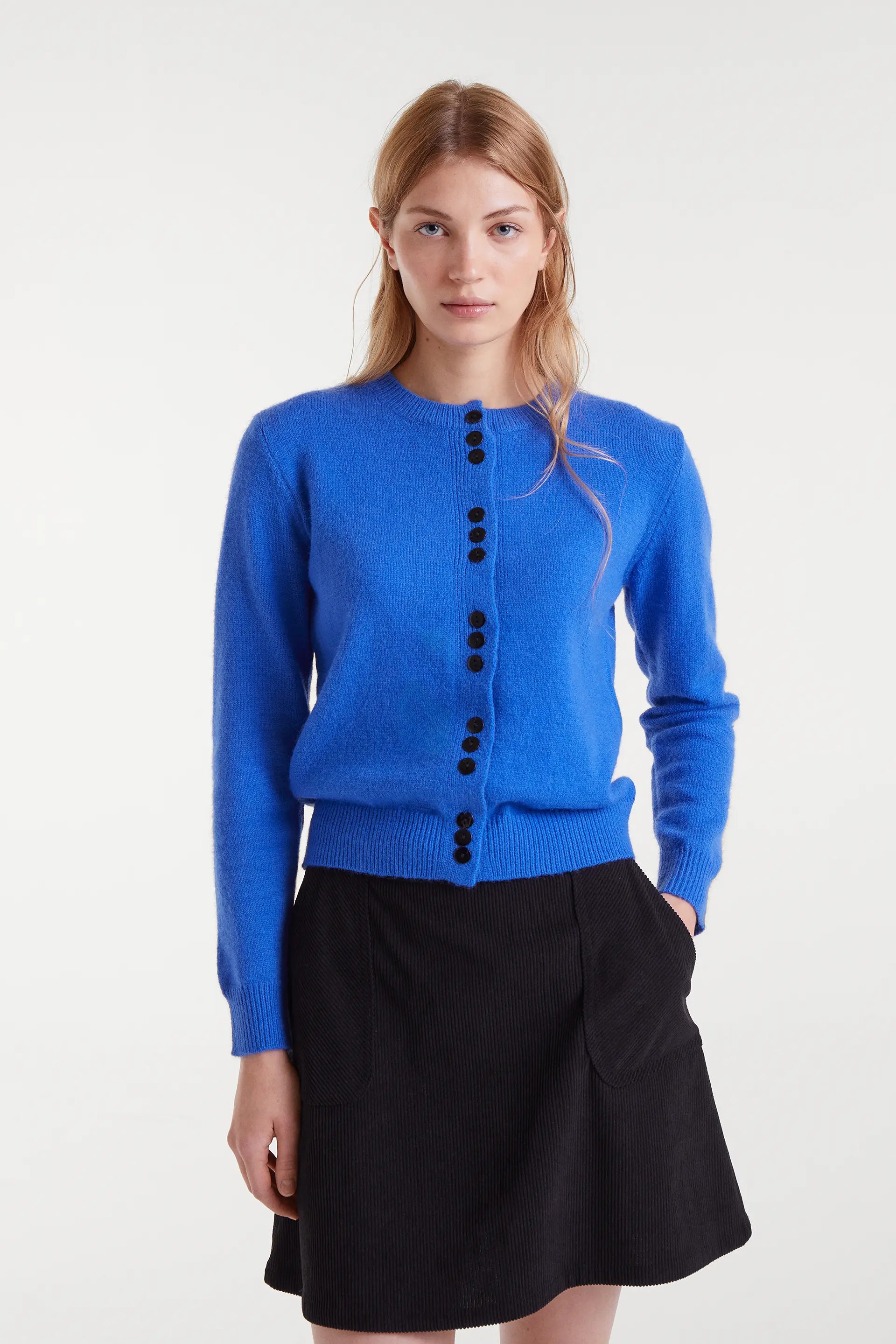 Cárdigan de punto de color azul. Con cuello redondo y manga larga con hombro ligeramente caído. Cierre frontal con botones a contraste en color negro. La modelo mide 179 cm y lleva talla S.