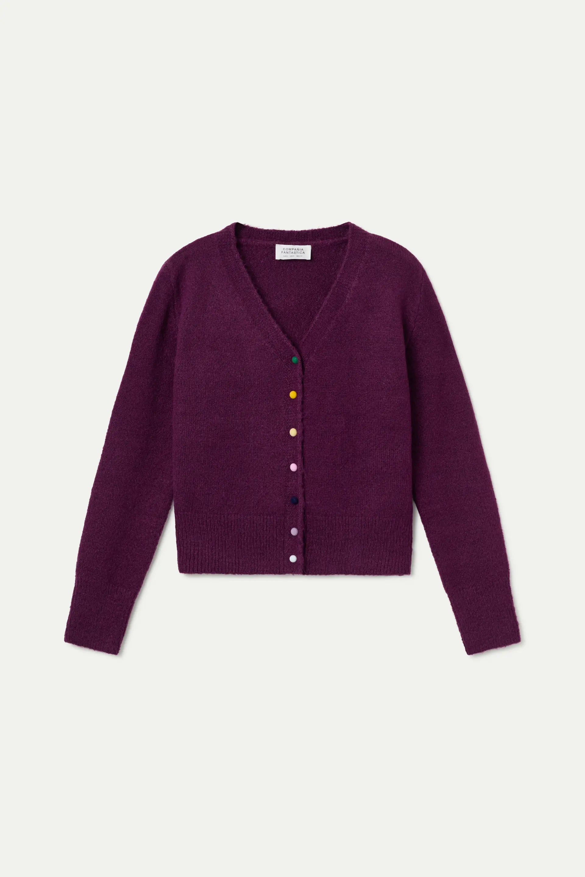 Cárdigan de punto color burdeos. Con cuello pico y manga larga con hombro ligeramente caído. Cierre frontal con botones multicolor. Detalles acabados en rib. La modelo mide 177 cm y lleva talla S.