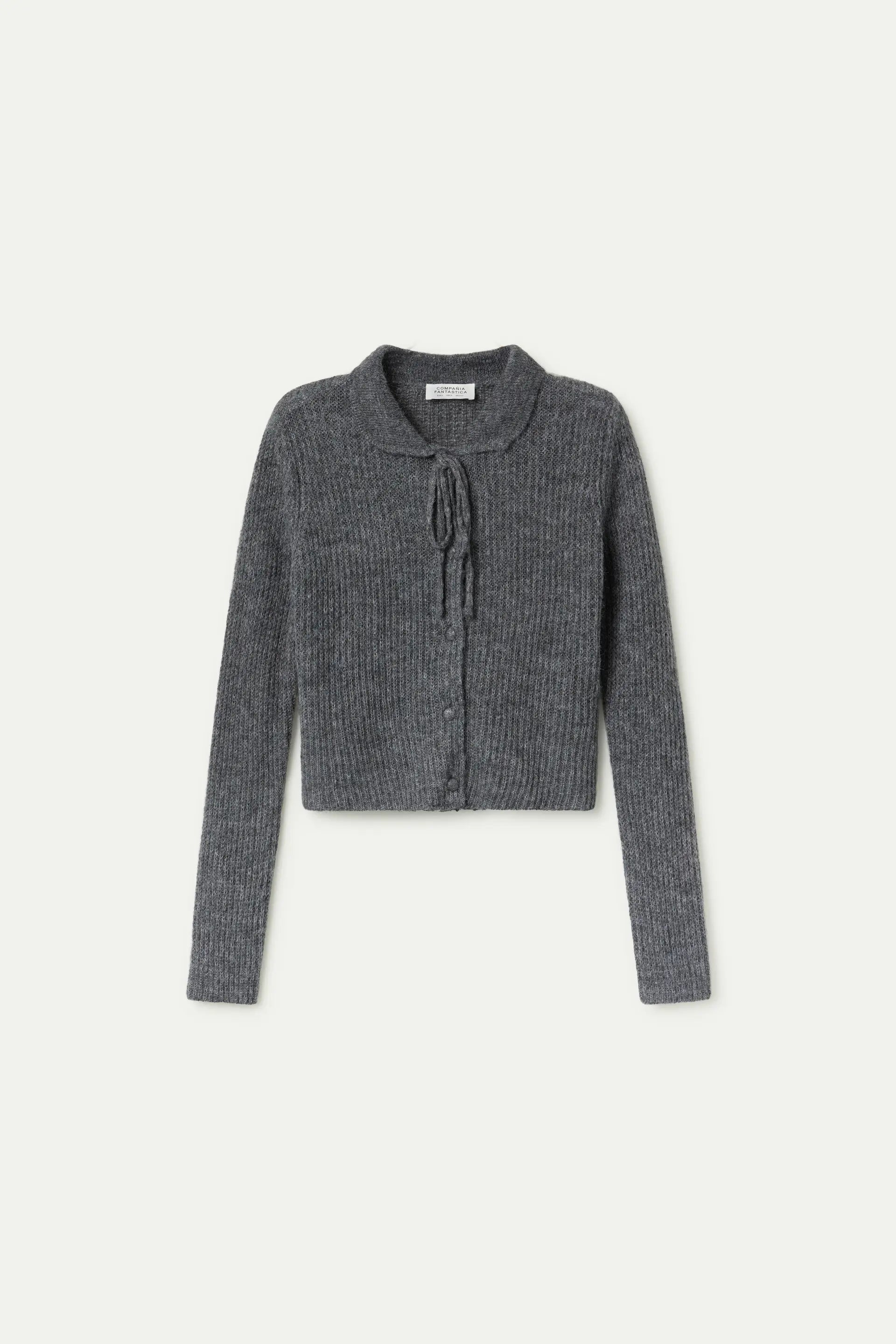 Cárdigan de punto de color gris. Cuello redondo con corte babero y detalle en lazada. Con manga larga y cierre frontal con botones. La modelo mide 174 cm y lleva la talla S.