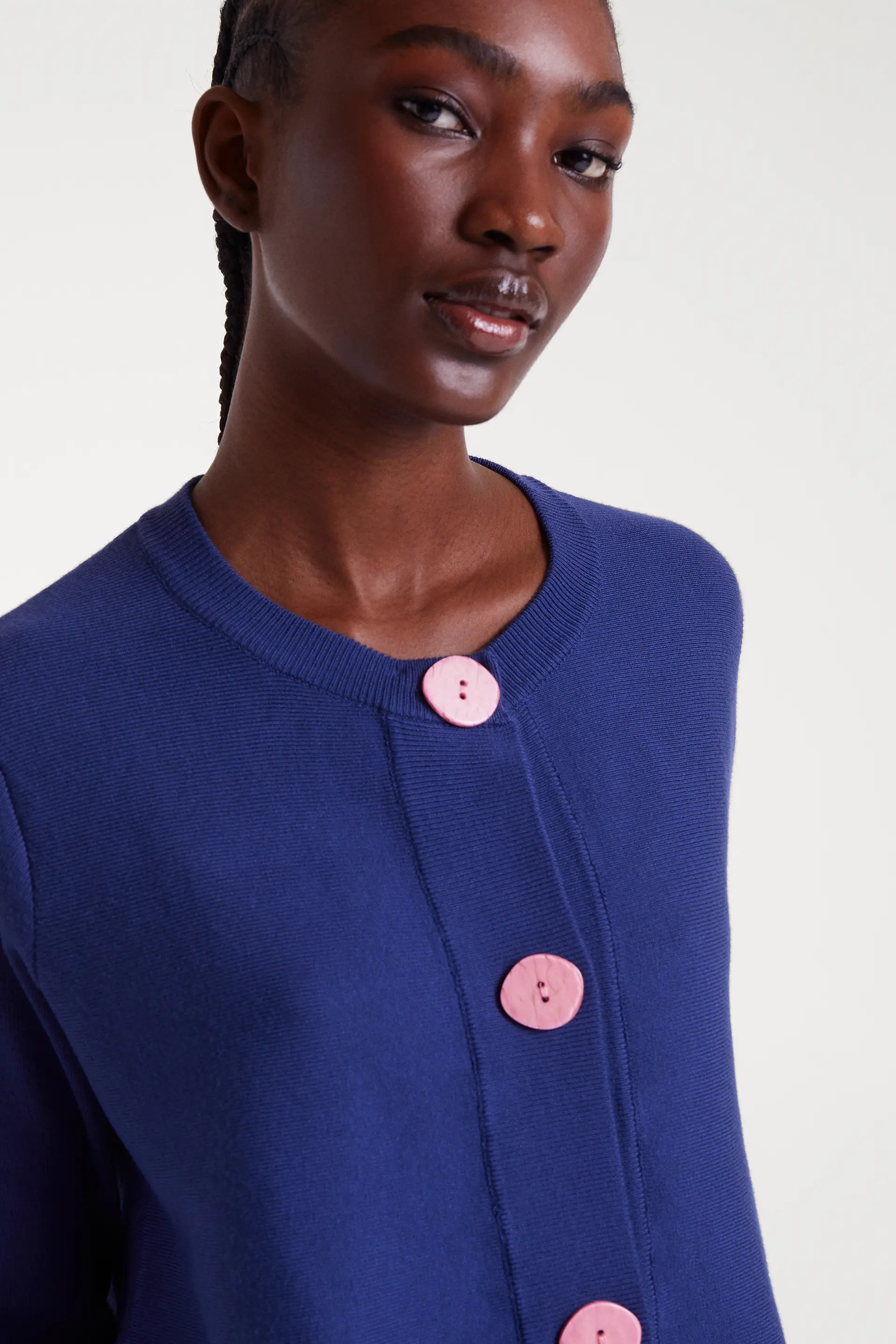 Cárdigan de punto con corte evasé de color navy blue. Con cuello redondo y manga larga. Cierre frontal con botones grandes de color rosa. La modelo mide 178 cm y lleva talla S.