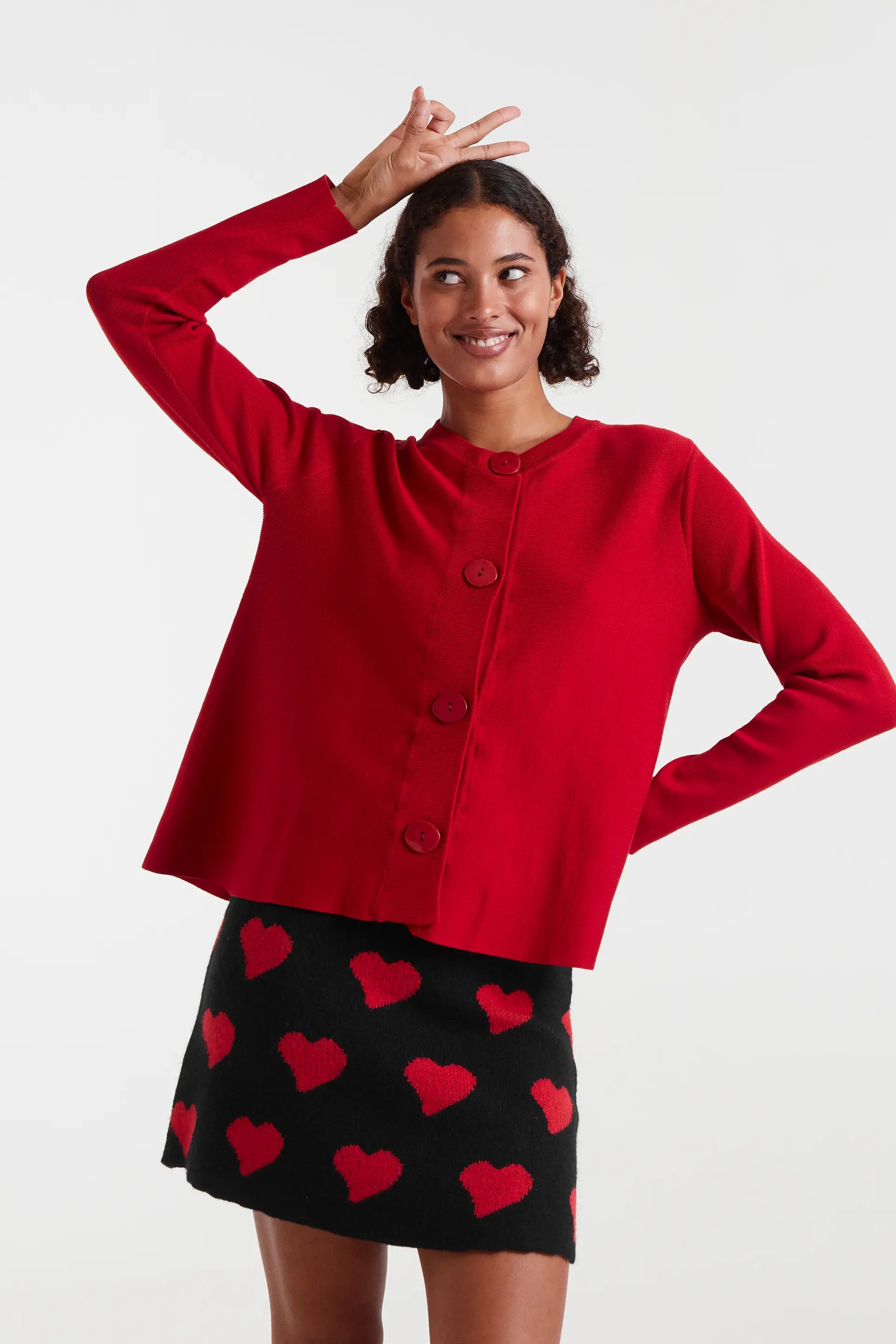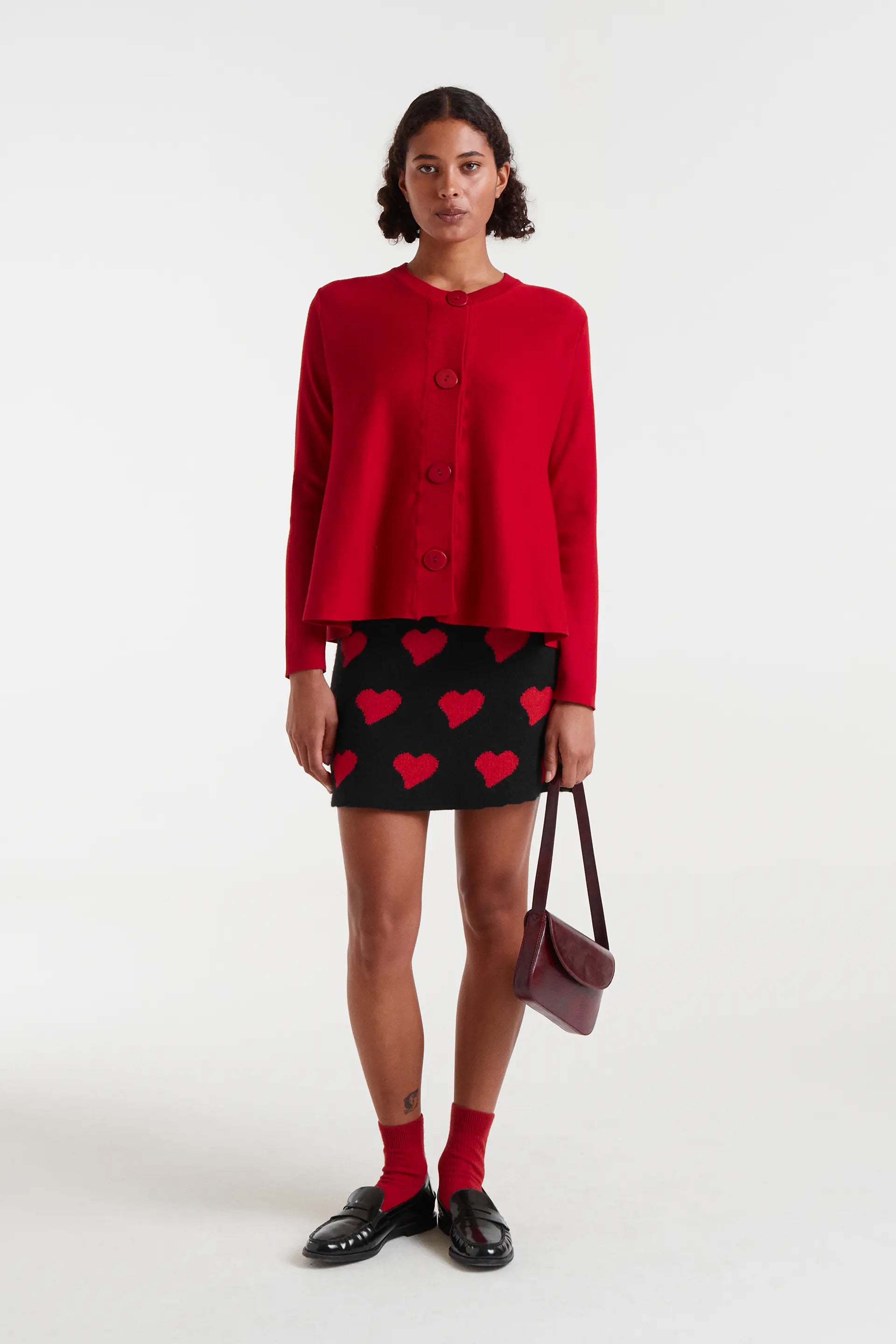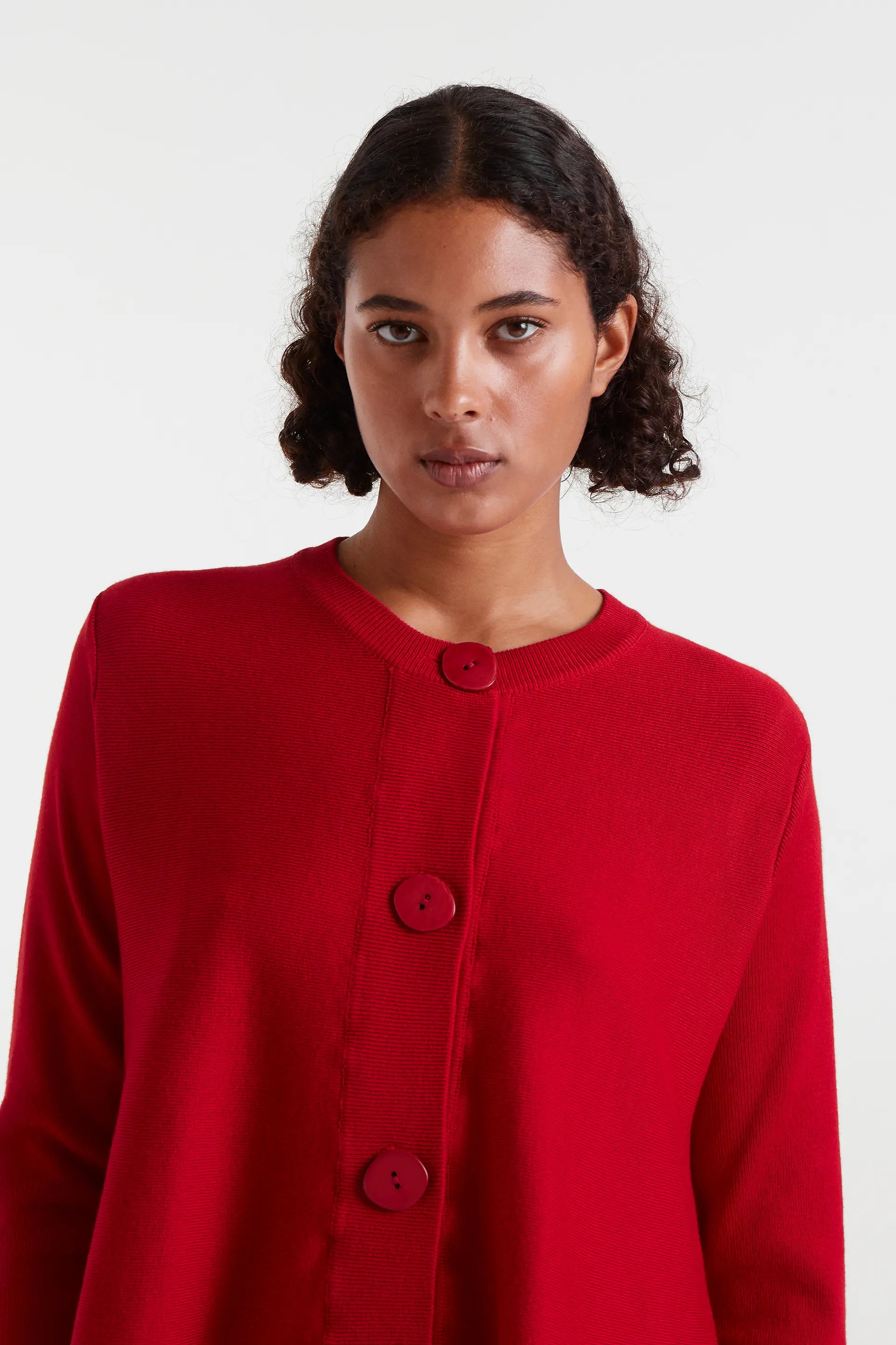 Cárdigan de punto con corte evasé de color rojo. Con cuello redondo y manga larga. Cierre frontal con botones. Detalles en rib. La modelo mide 175 cm y lleva la talla S.