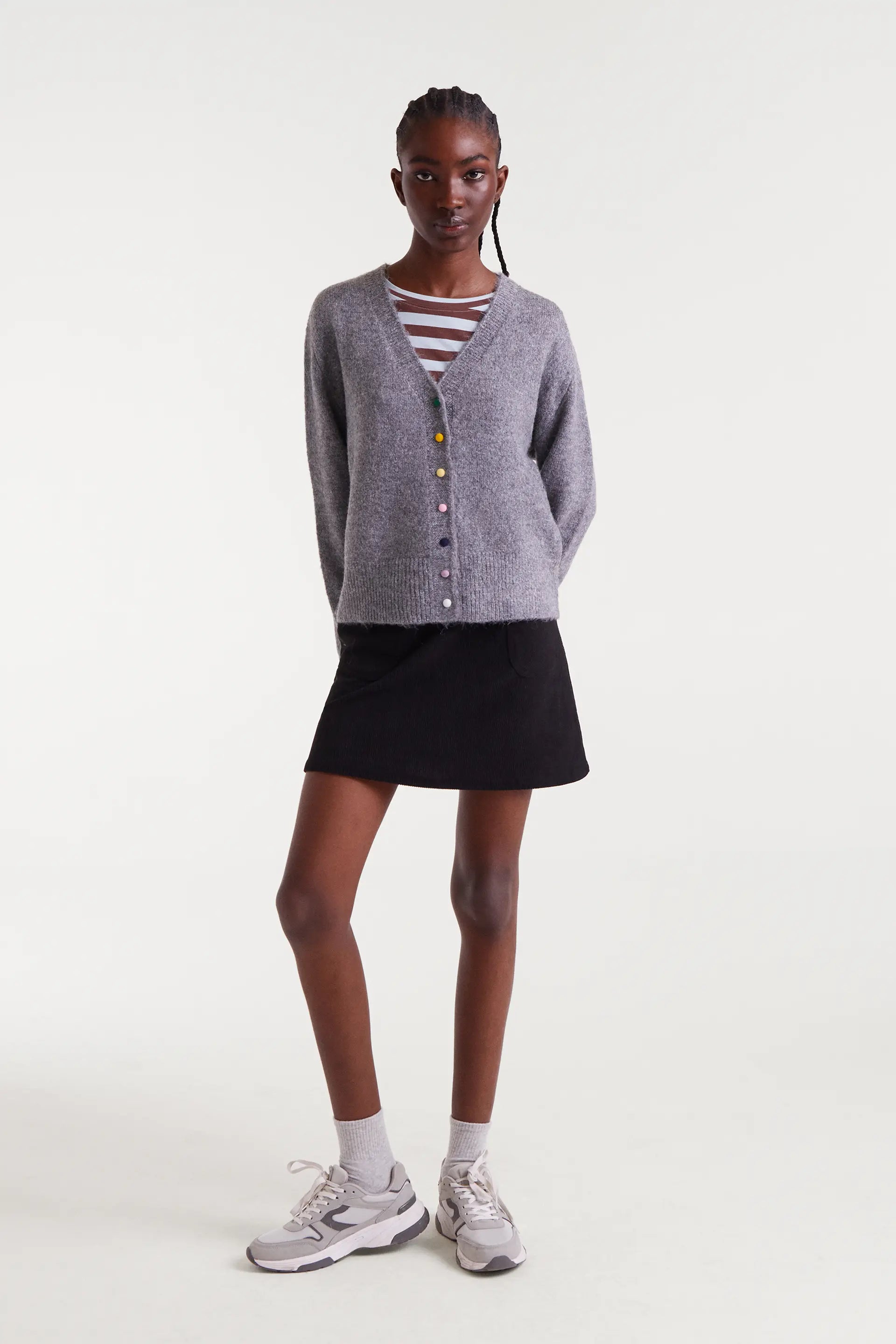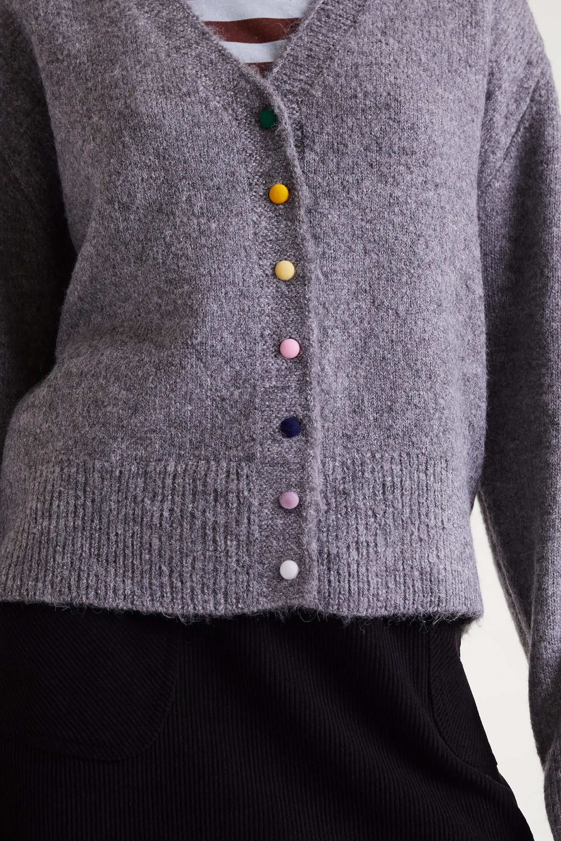 Cárdigan de punto color gris. Con cuello pico y manga larga con hombro ligeramente caído. Cierre frontal con botones multicolor. Detalles acabados en rib. La modelo mide 178 cm y lleva talla S.