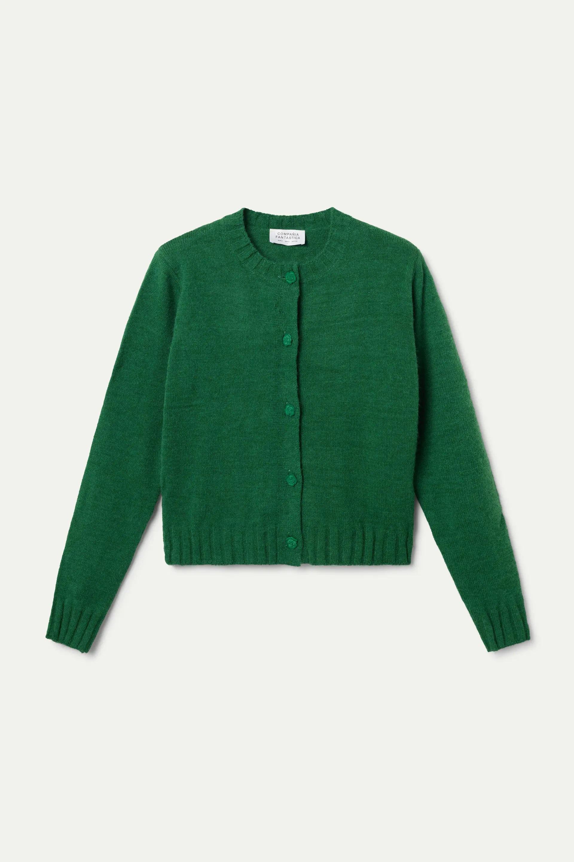 Cárdigan de punto color verde. Con cuello redondo y manga larga. Hombro ligeramente caído. Cierre frontal con botones en forma de rosa. La modelo mide 175 cm y lleva la talla S.