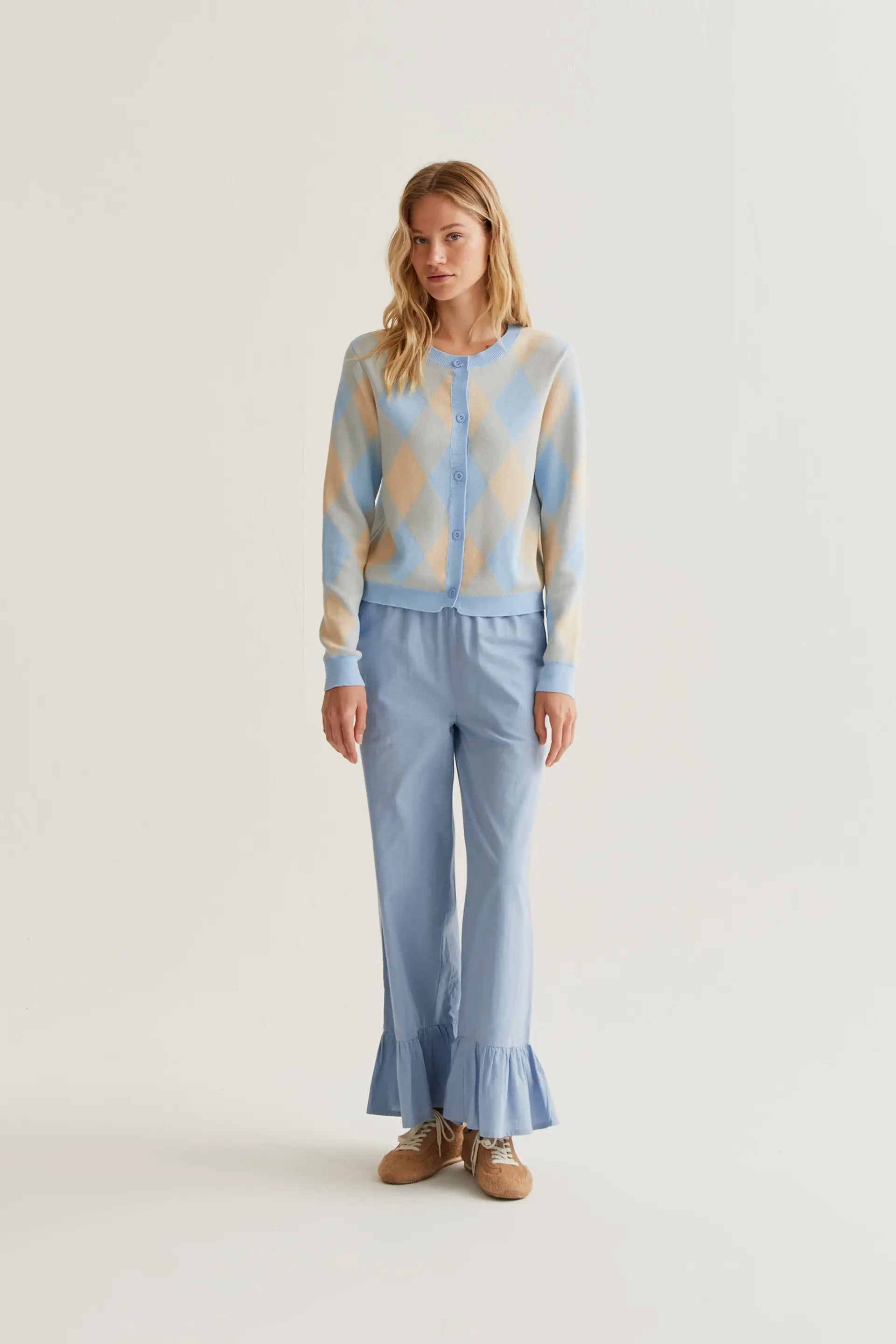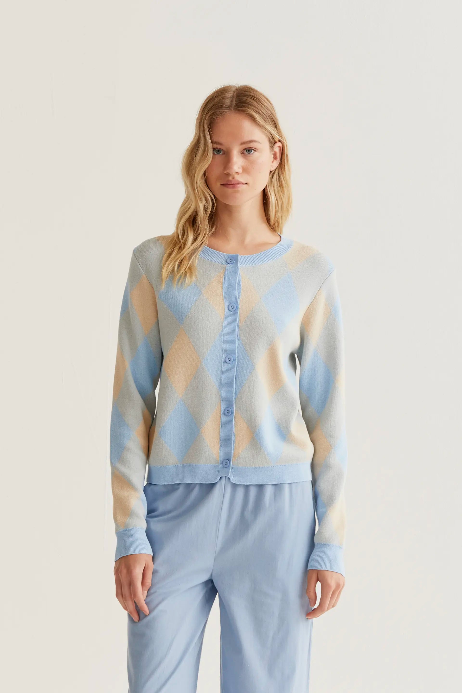 Cárdigan de tejido punto jacquard con estampado de rombos de color azul. Cuello redondo y manga larga. Cierre frontal con botones redondos de color azul. Detalles acabados en rib.La modelo mide 177 cm y lleva la talla S.
