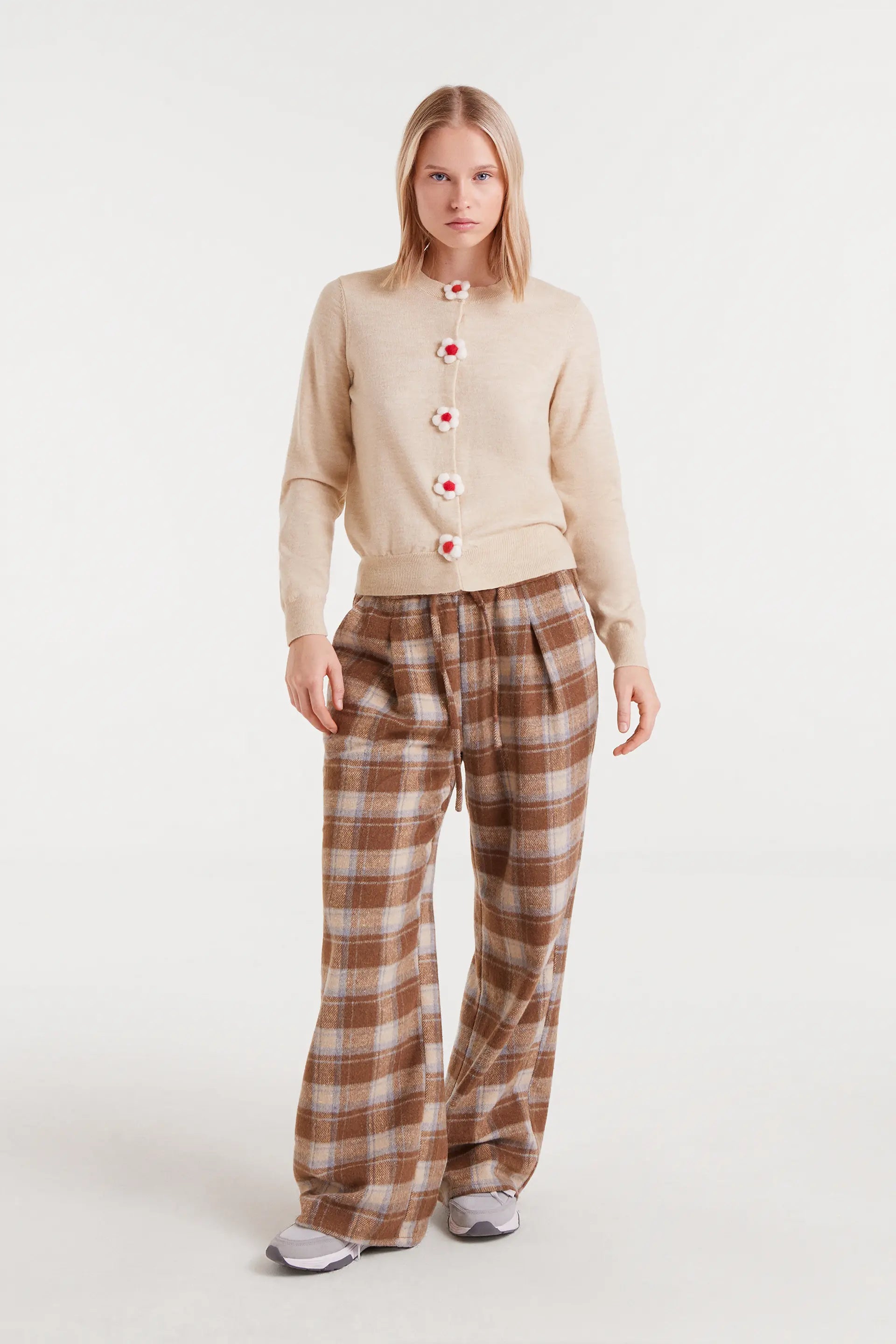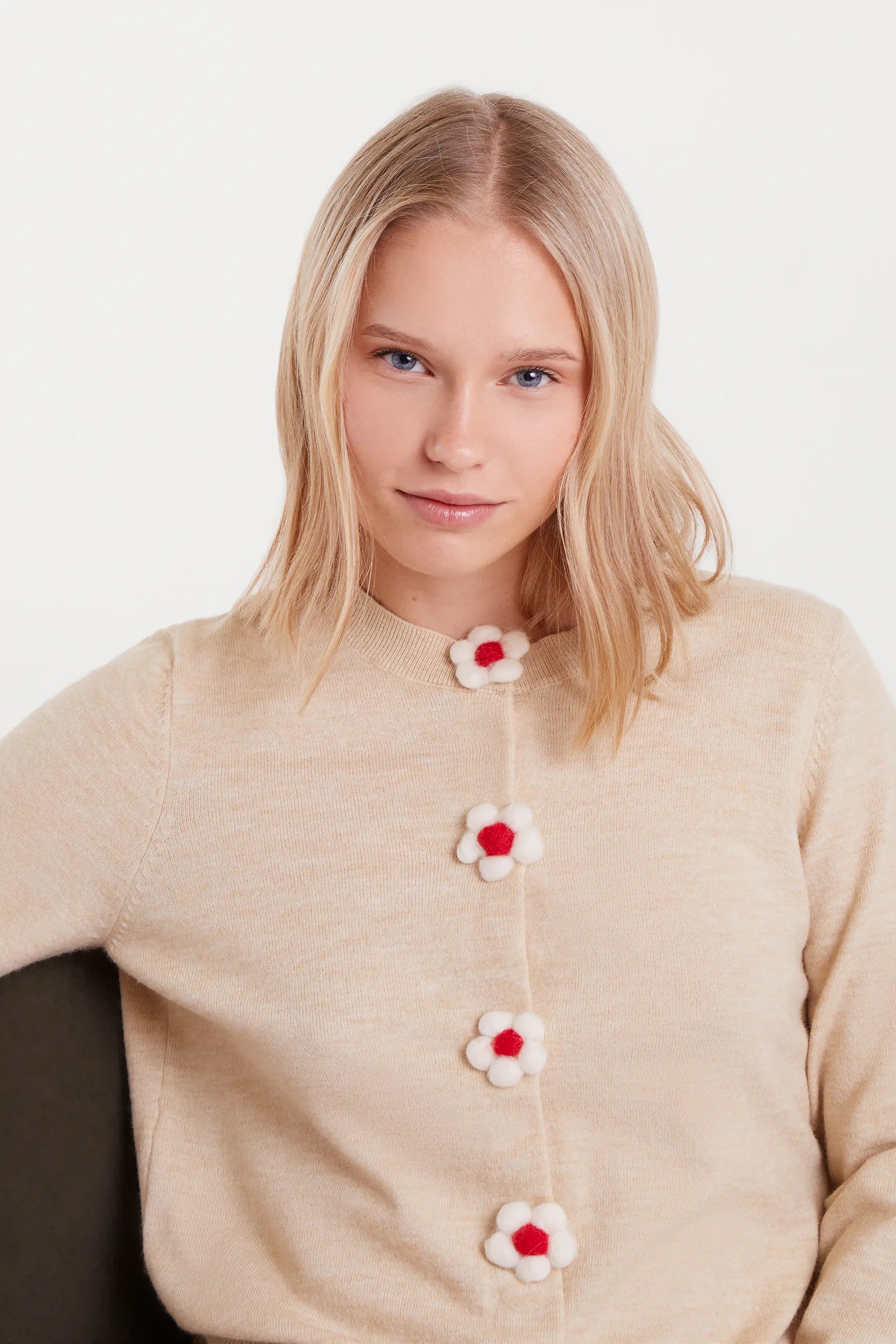 Cárdigan con tejido punto fino de color beige. Cuello redondo y manga larga. Cierre frontal con botones ocultos y aplicación en forma de flor. Detalles acabados en rib. La modelo mide 174 cm y lleva la talla S.