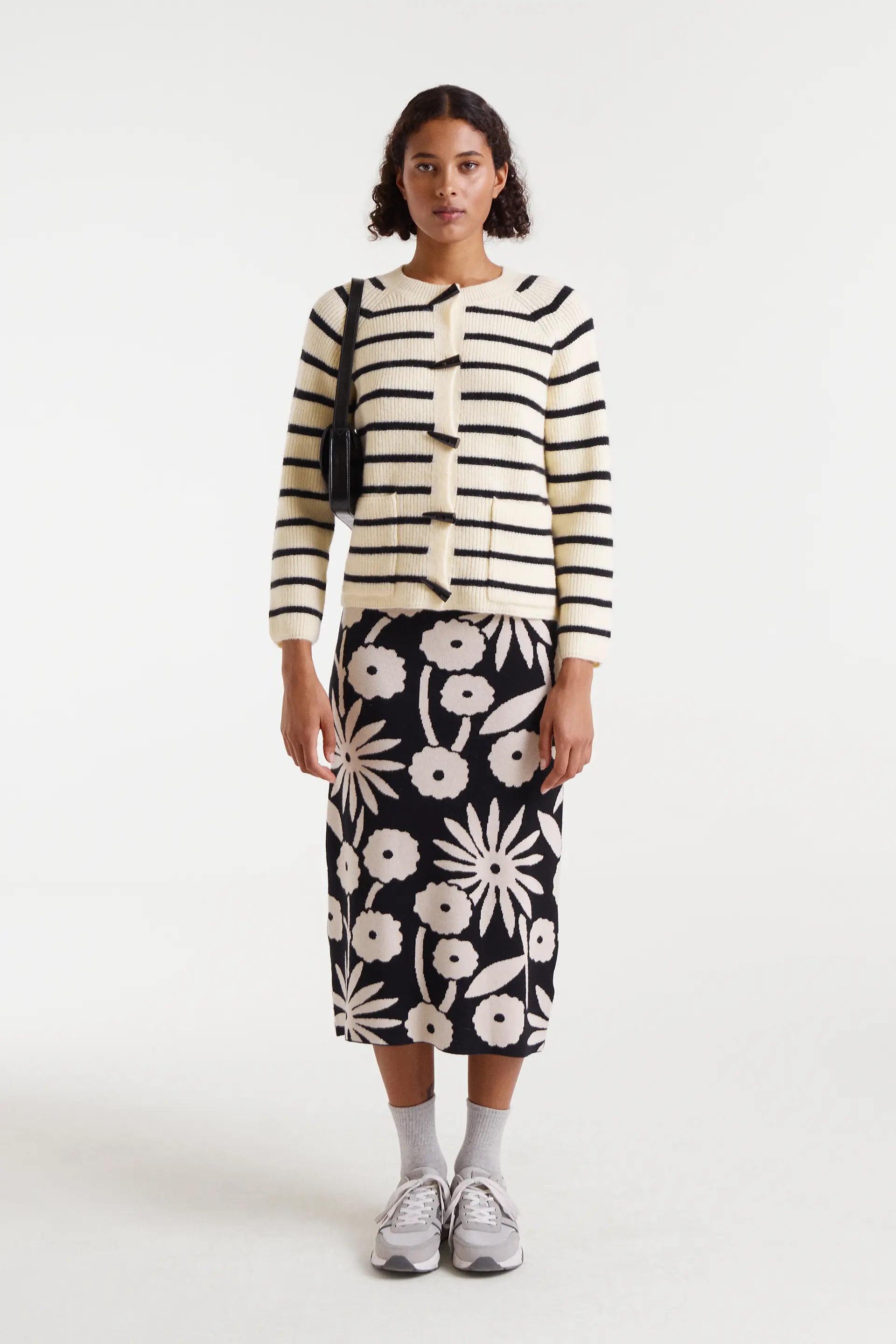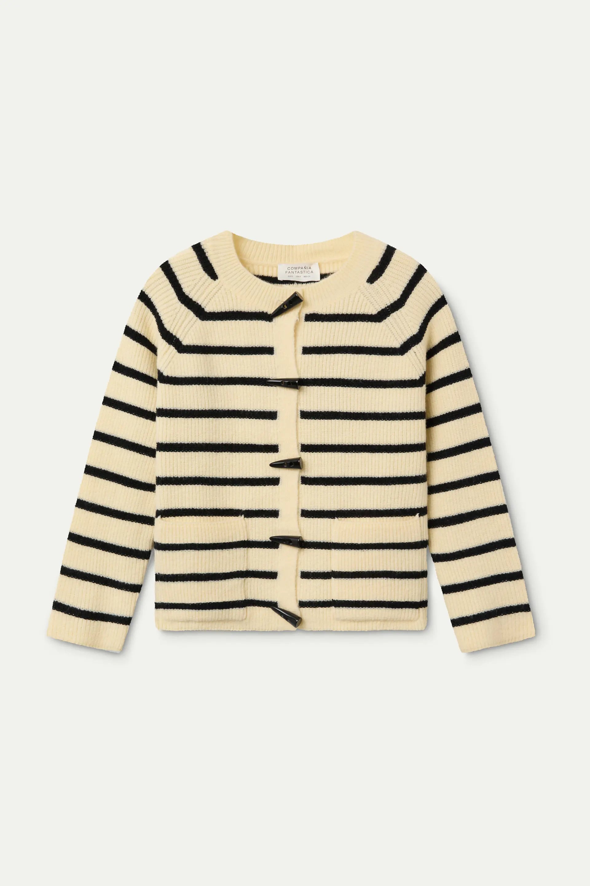 Cárdigan con tejido punto y estampado de rayas de color blanco y negro. Cuello redondo y manga larga. Cierre frontal tipo trenca. Bolsillos frontales. La modelo mide 175 cm y lleva la talla S.