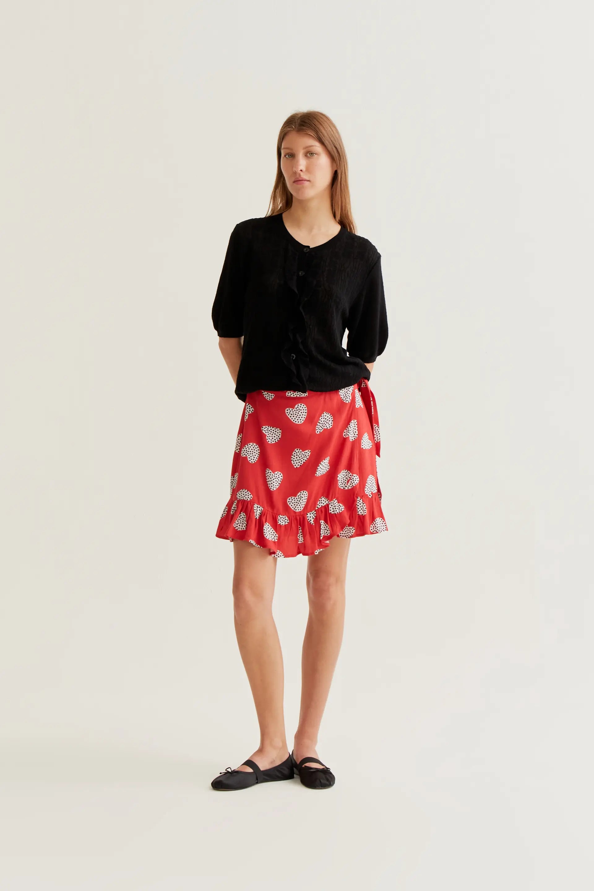 Falda corta con estampado harmony red. Cintura fija de tiro alto. Cintura lazada. Detalles en volantes.La modelo mide 177 cm y lleva la talla S.