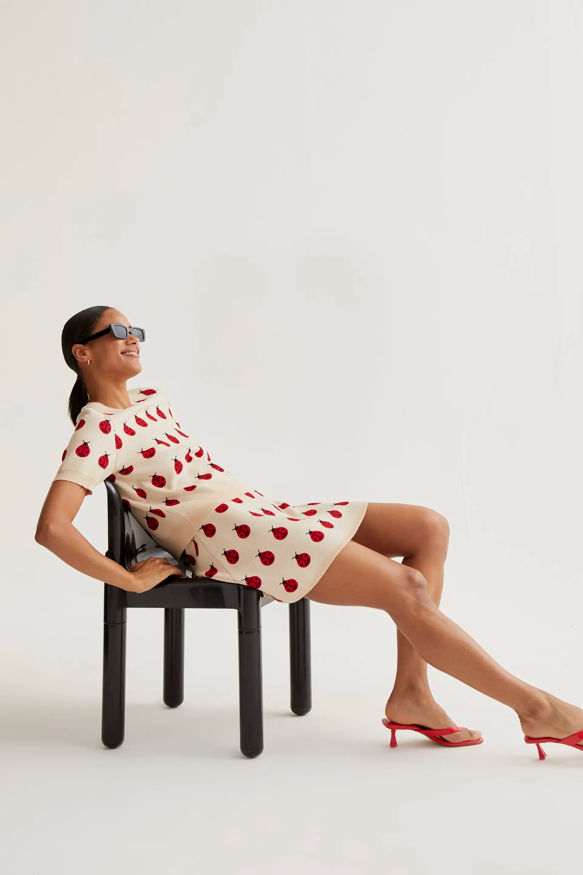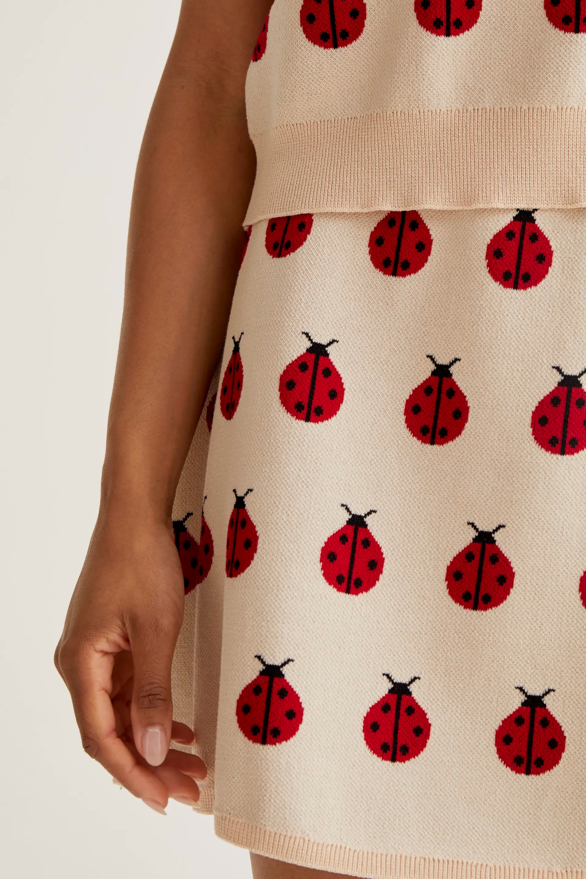 Falda corta de tejido punto con estampado red coccinella. Cintura elástica de tiro alto. Detalles acabados en rib. La modelo mide 173 cm y lleva la talla S.