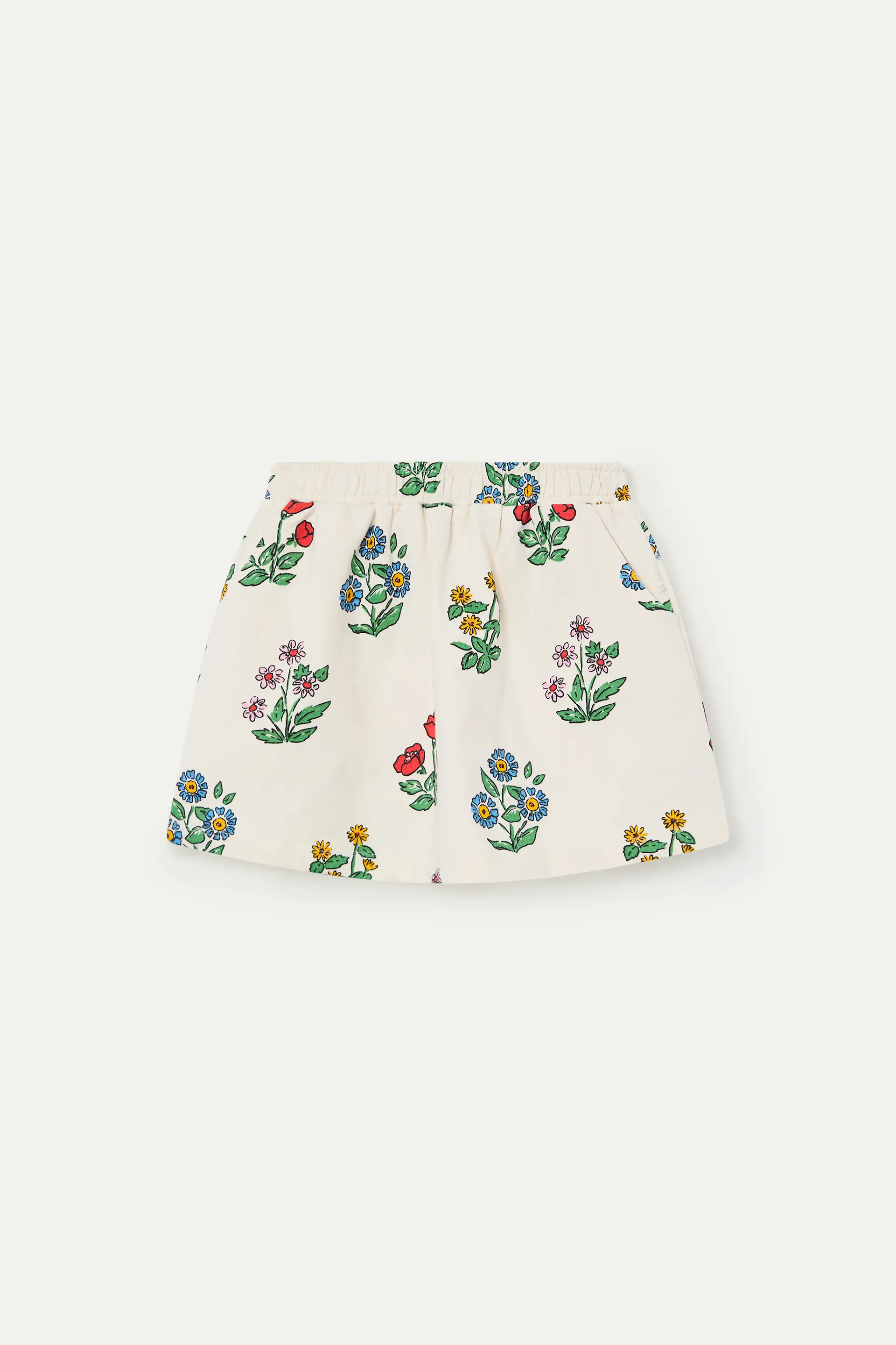 Falda corta de niña de tejido 100% algodón con estampado gardener. Cintura elástica de tiro alto. Bolsillos laterales. La modelo mide 133 cm y lleva la talla 8-9 años.