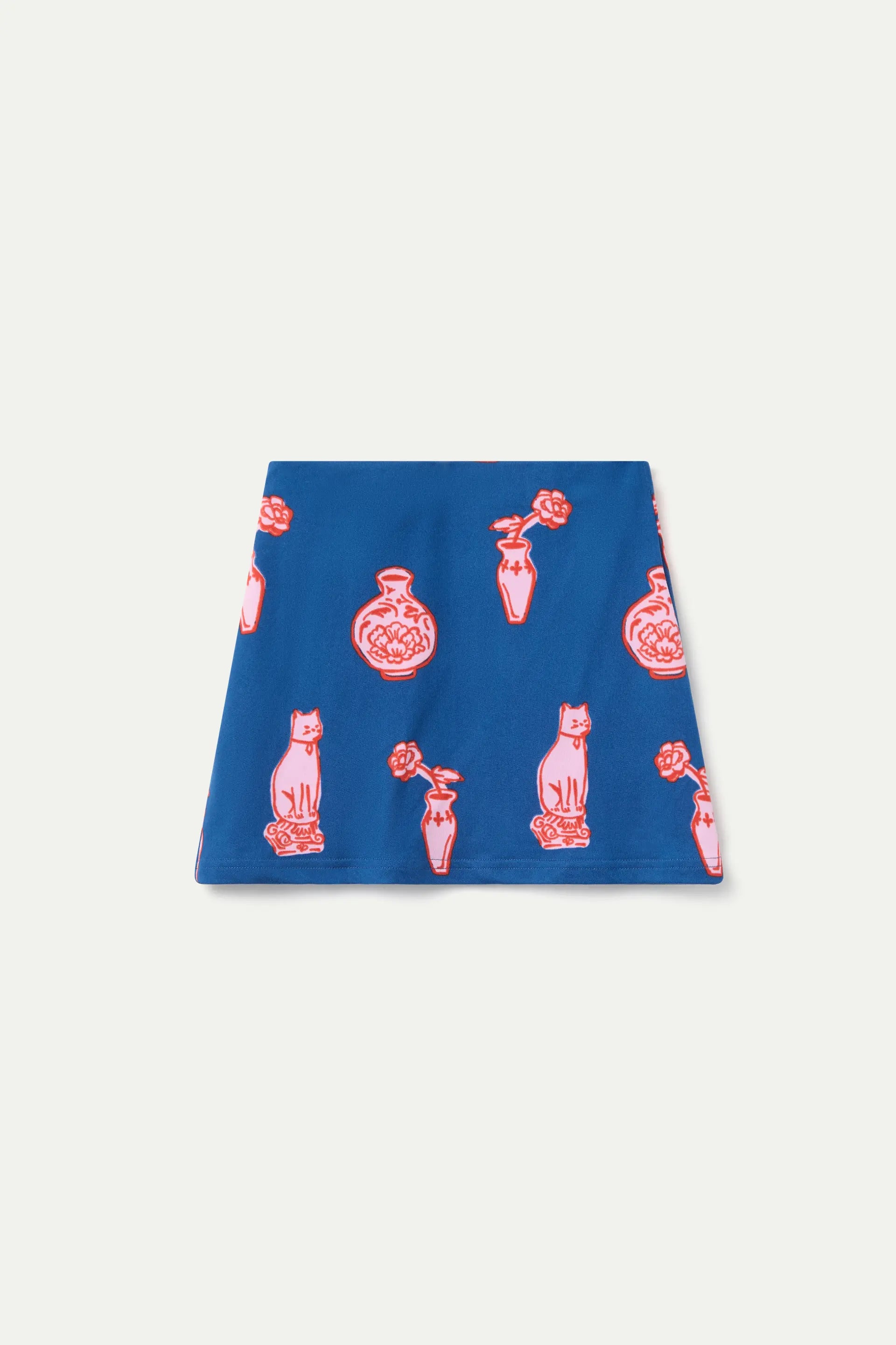 Falda corta de niña de punto suave y elástico y estampado Porcelain en color rosa sobre fondo azul.