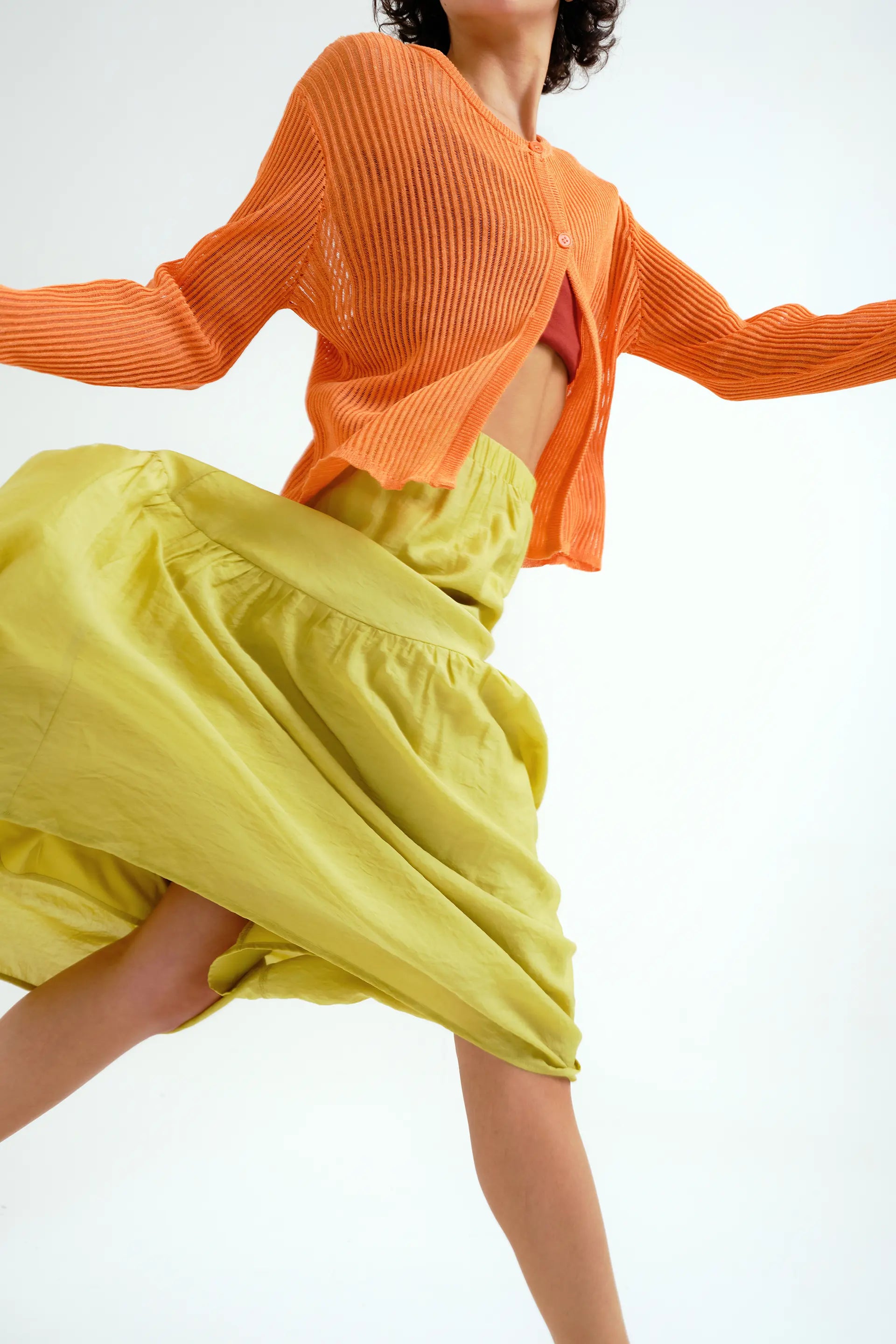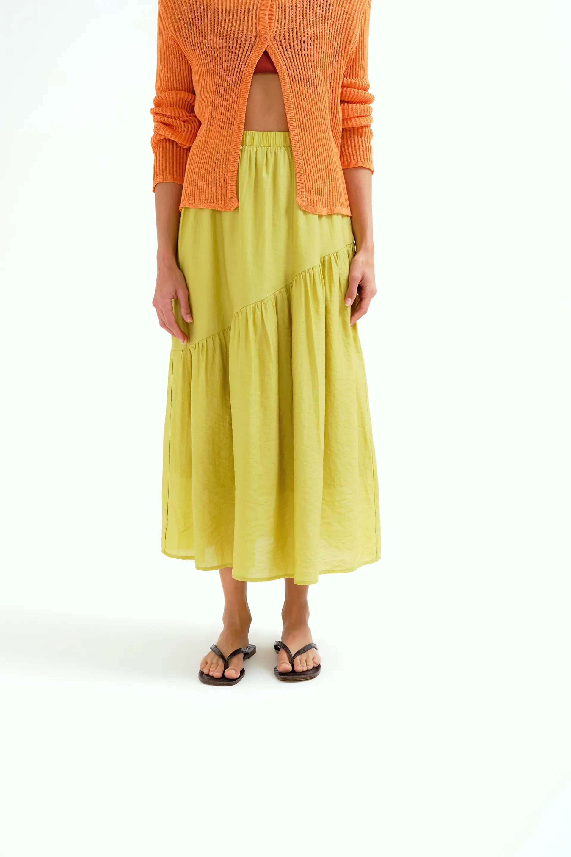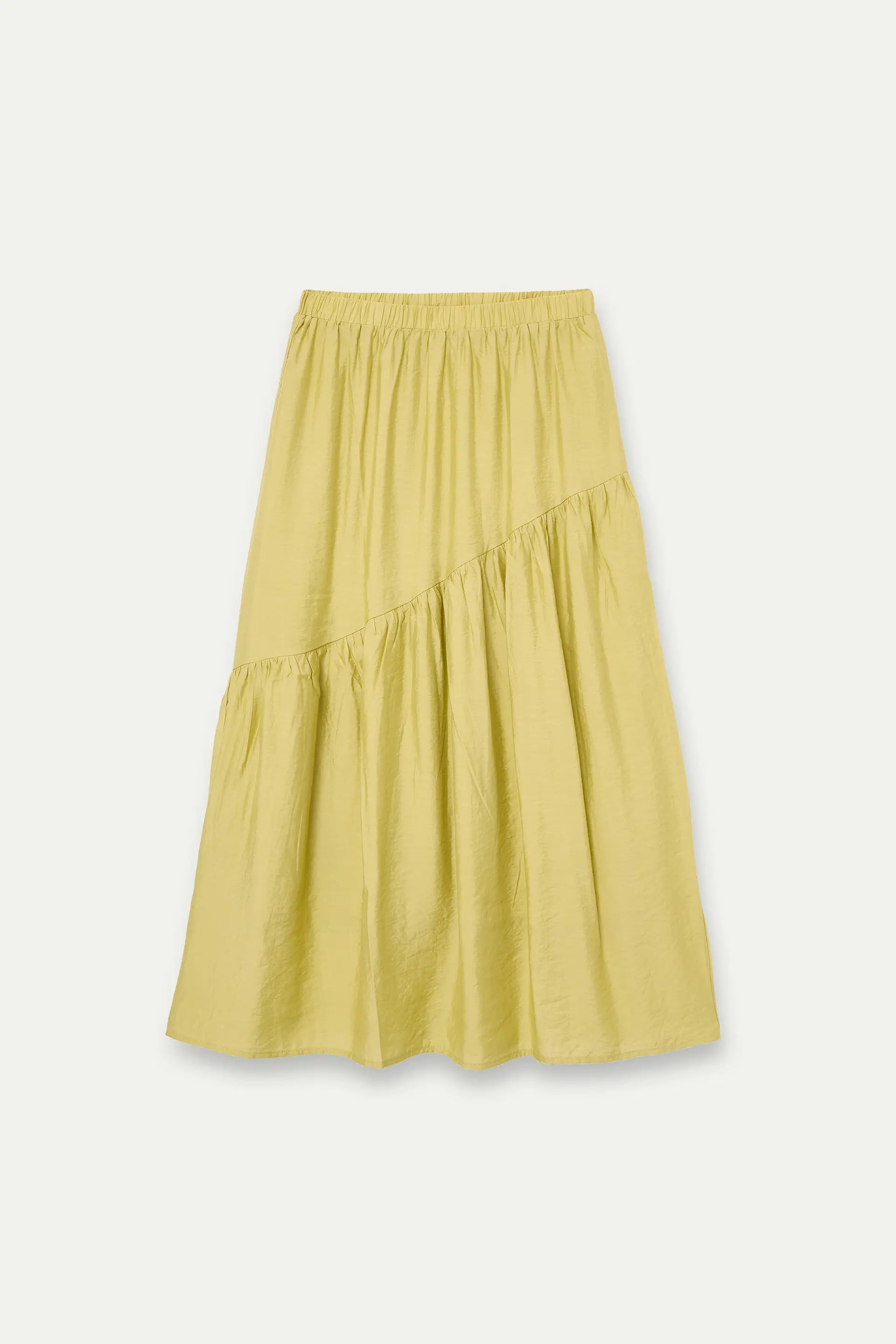 Falda larga de tejido crepé satinado de color verde pistacho. Cintura fija elástica de tiro alto. Detalle de corte asimétrico. Forro interior.La modelo mide 175 cm y lleva la talla S.