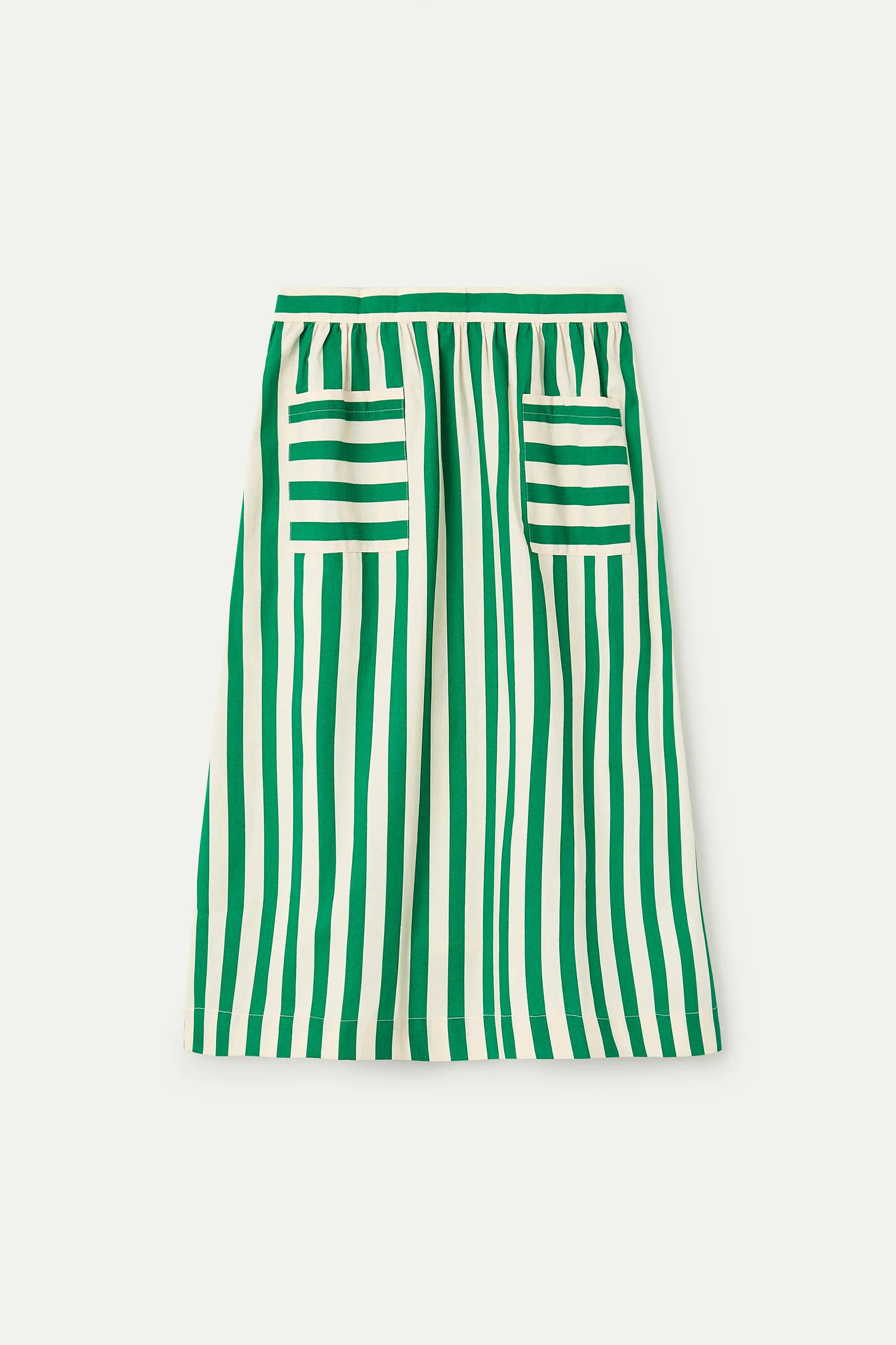 Falda midi de tejido 100% algodón con estampado bamboo green. Cintura fija elástica de tiro alto. Bolsillos frontales funcionales. Corte amplio. La modelo mide 173 cm y lleva la talla S.
