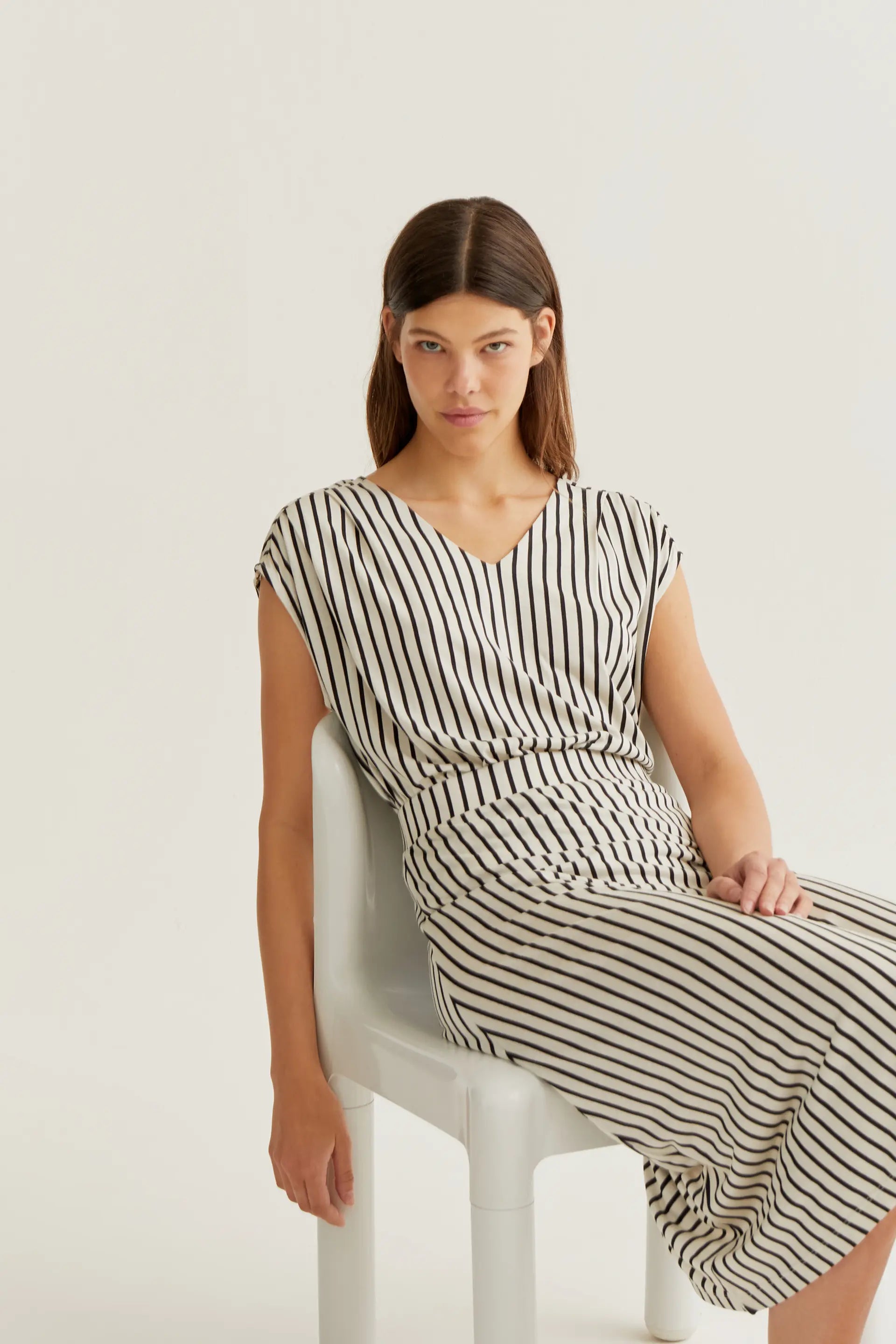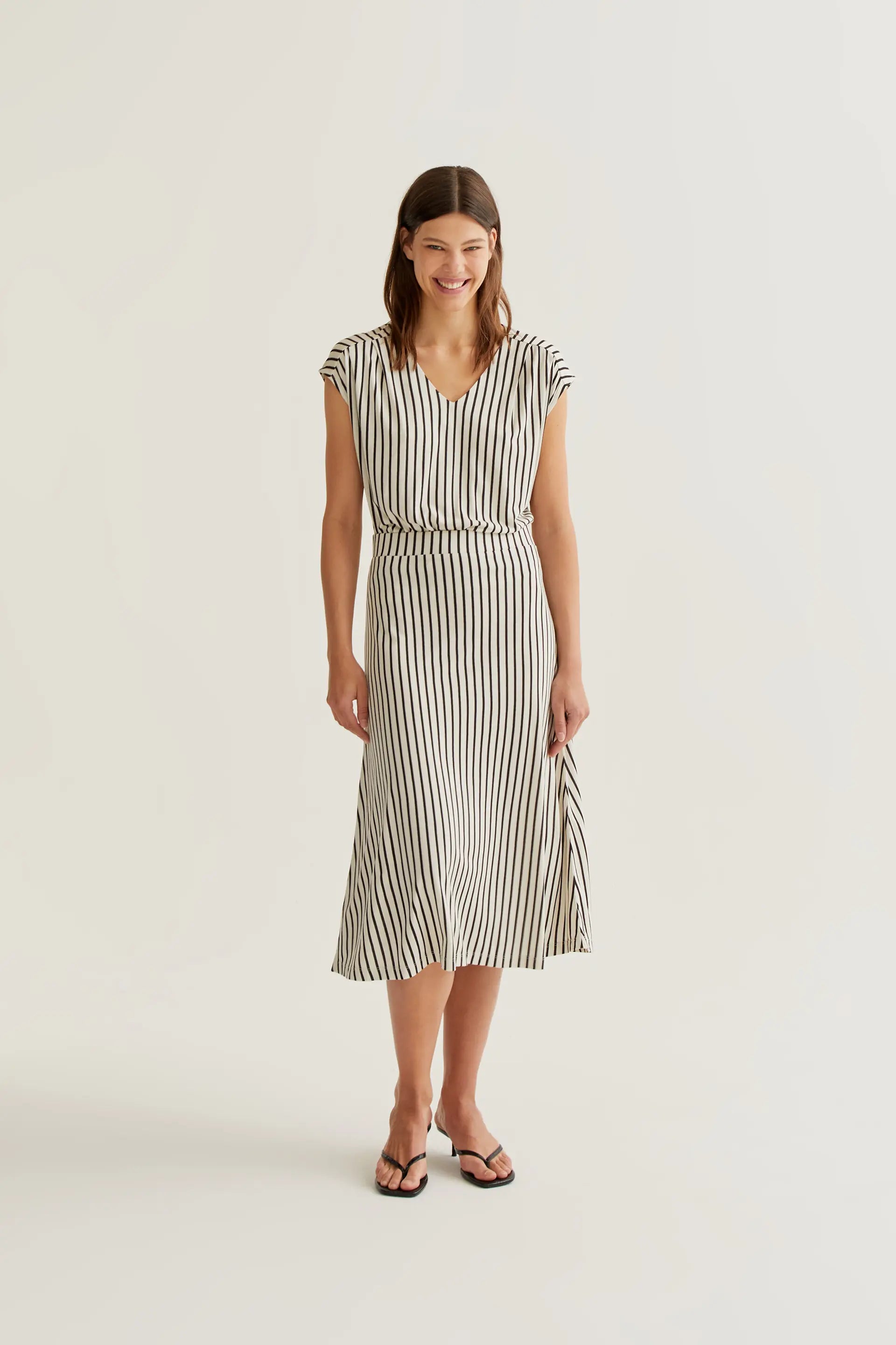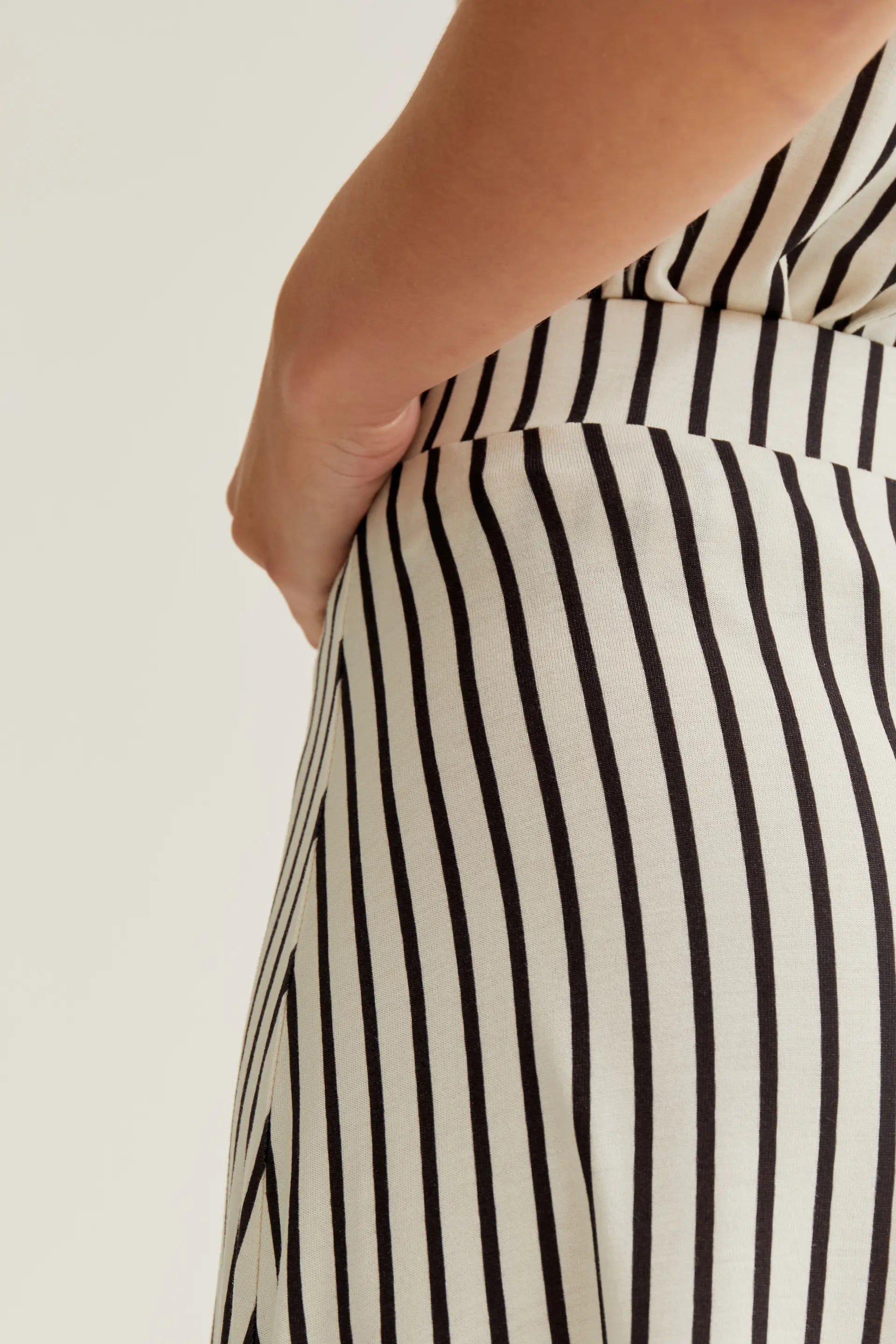 Falda midi de tejido jersey viscoso con estampado de rayas de color negro. Cintura fija elástica de tiro alto. Corte fluido. La modelo mide 177 cm y lleva la talla S.
