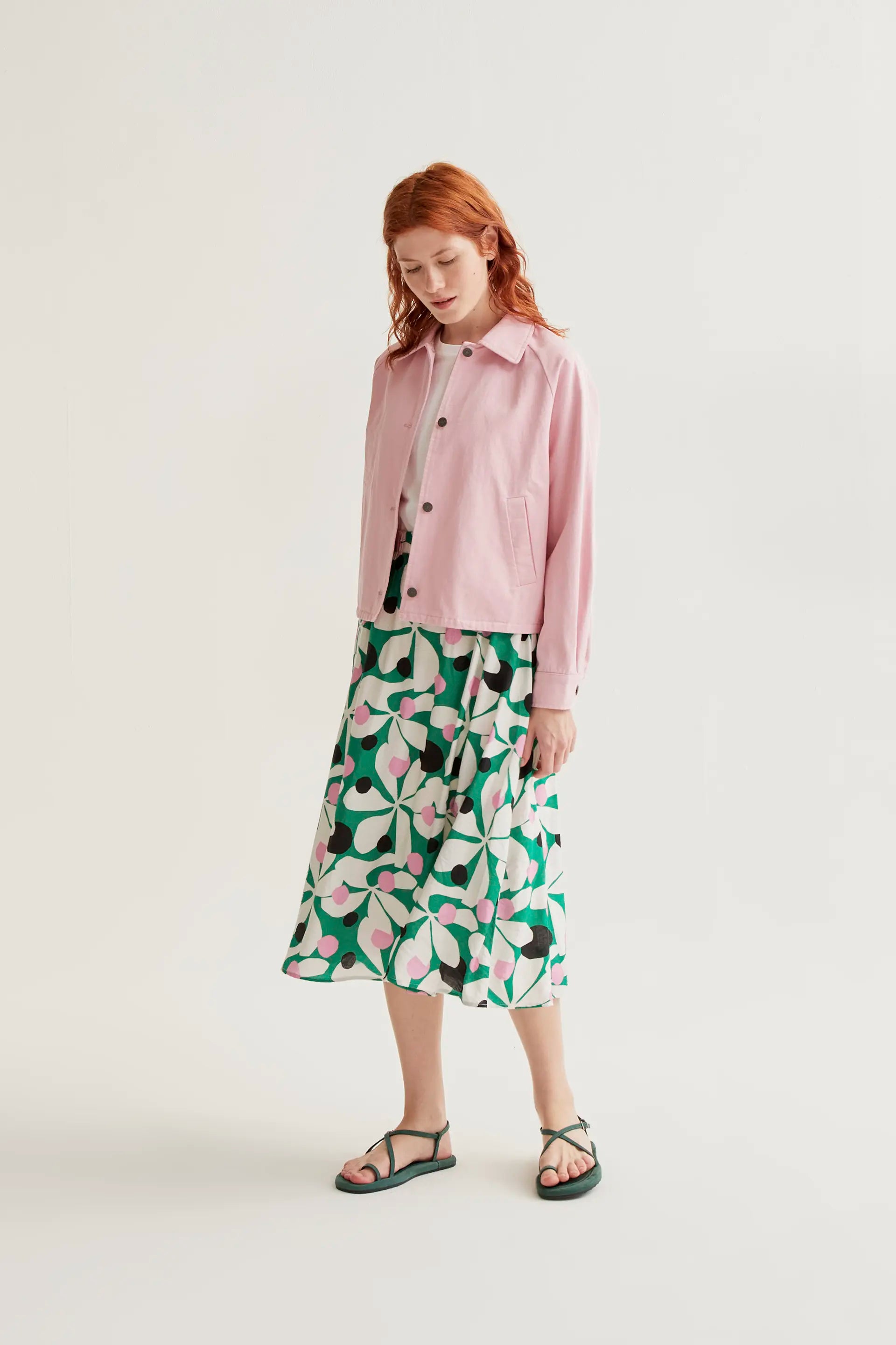 Falda midi de tejido crepé ligero con estampado hosta. Cintura fija elástica de tiro alto. Forro interior. Corte fluído. La modelo mide 175 cm y lleva la talla S.