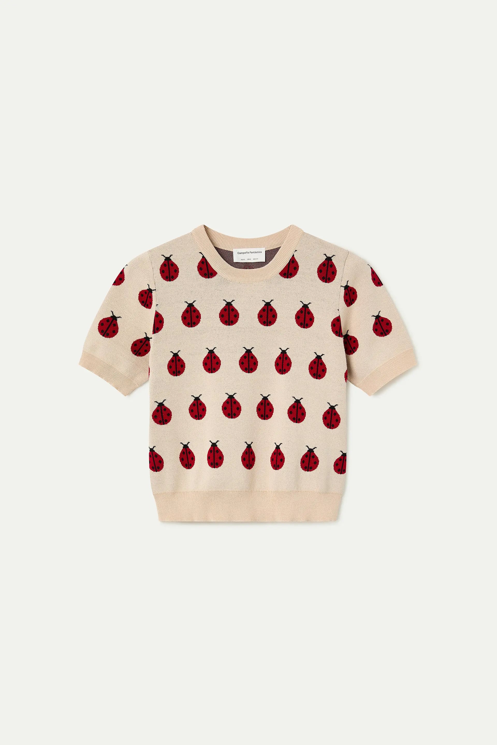 Jersey de tejido punto con estampado red coccinella. Cuello redondo y manga corta ligeramente abullonada. Detalles acabados en rib. La modelo mide 175 cm y lleva la talla S.