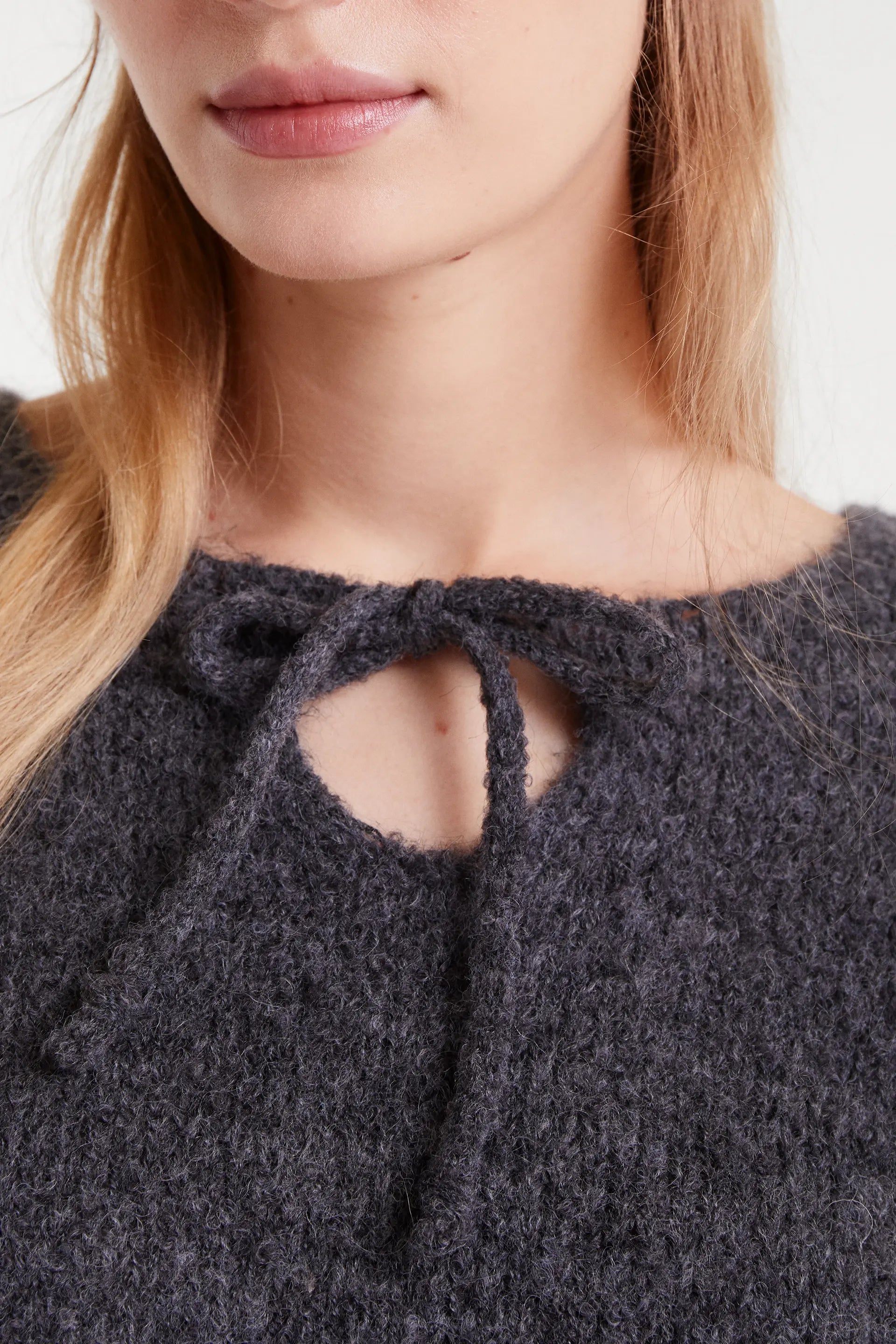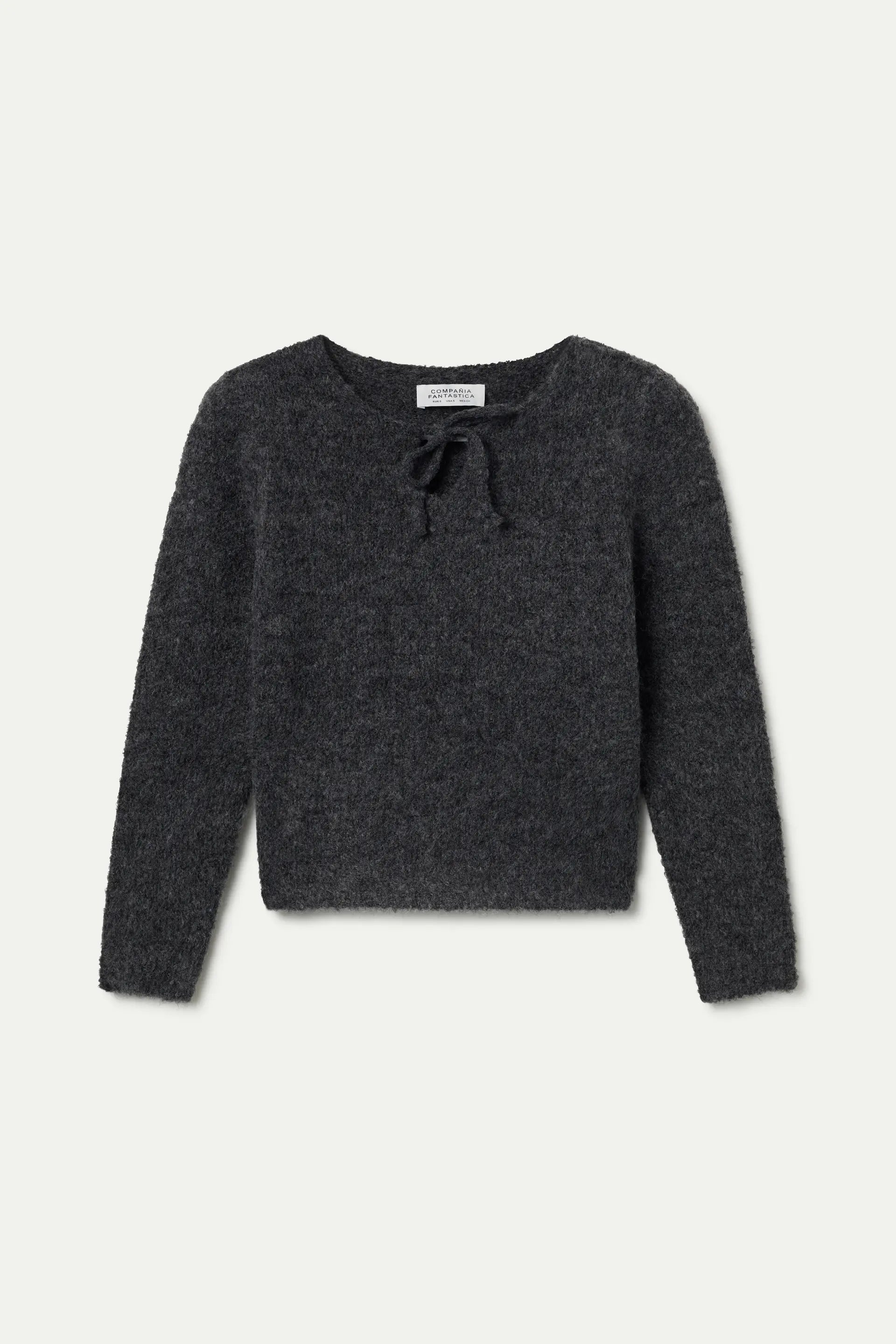 Jersey punto con textura de color gris. Cuello redondo con escote nudado en forma de lazo. Manga larga. La modelo mide 179 cm y lleva la talla S.