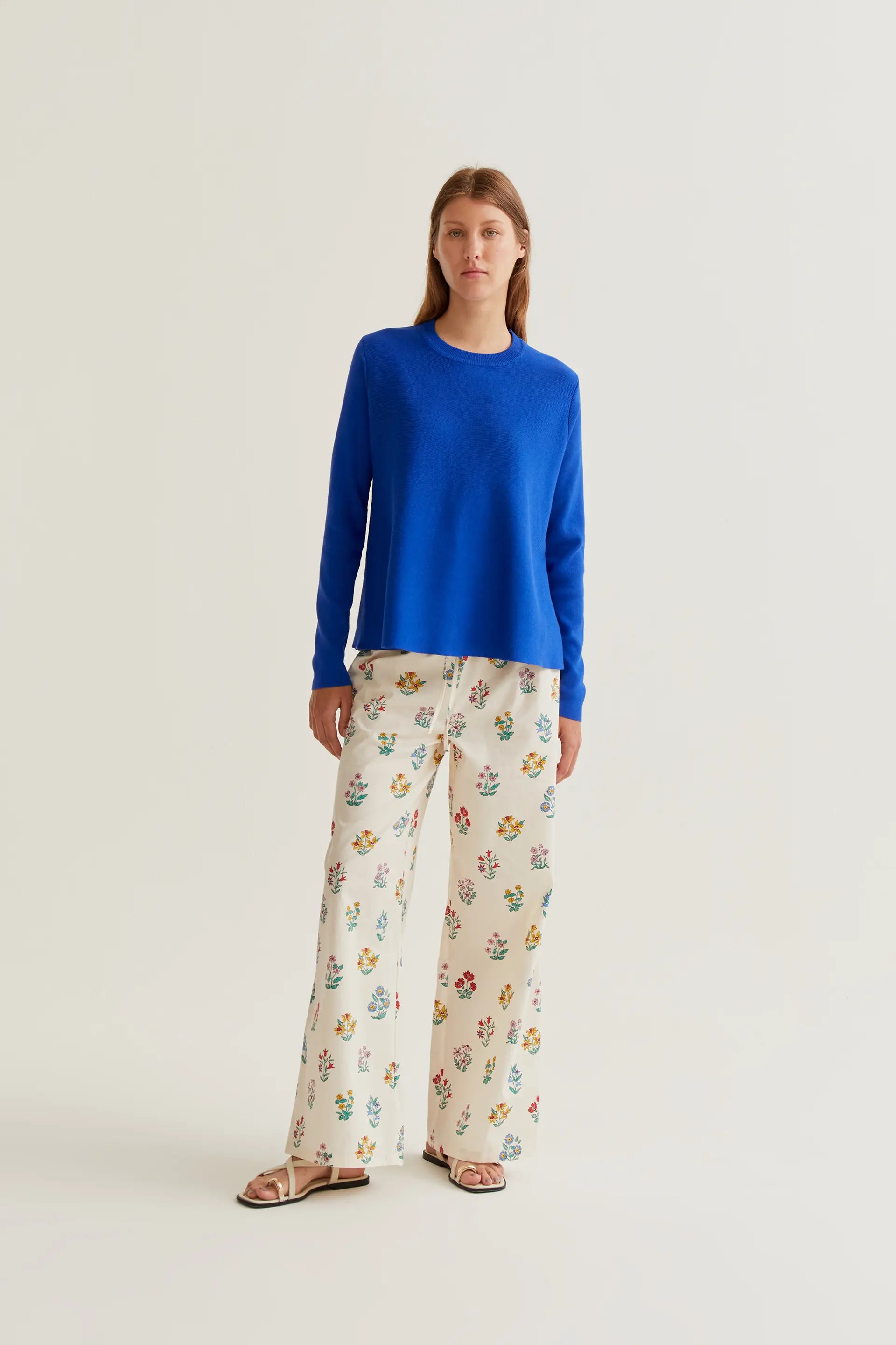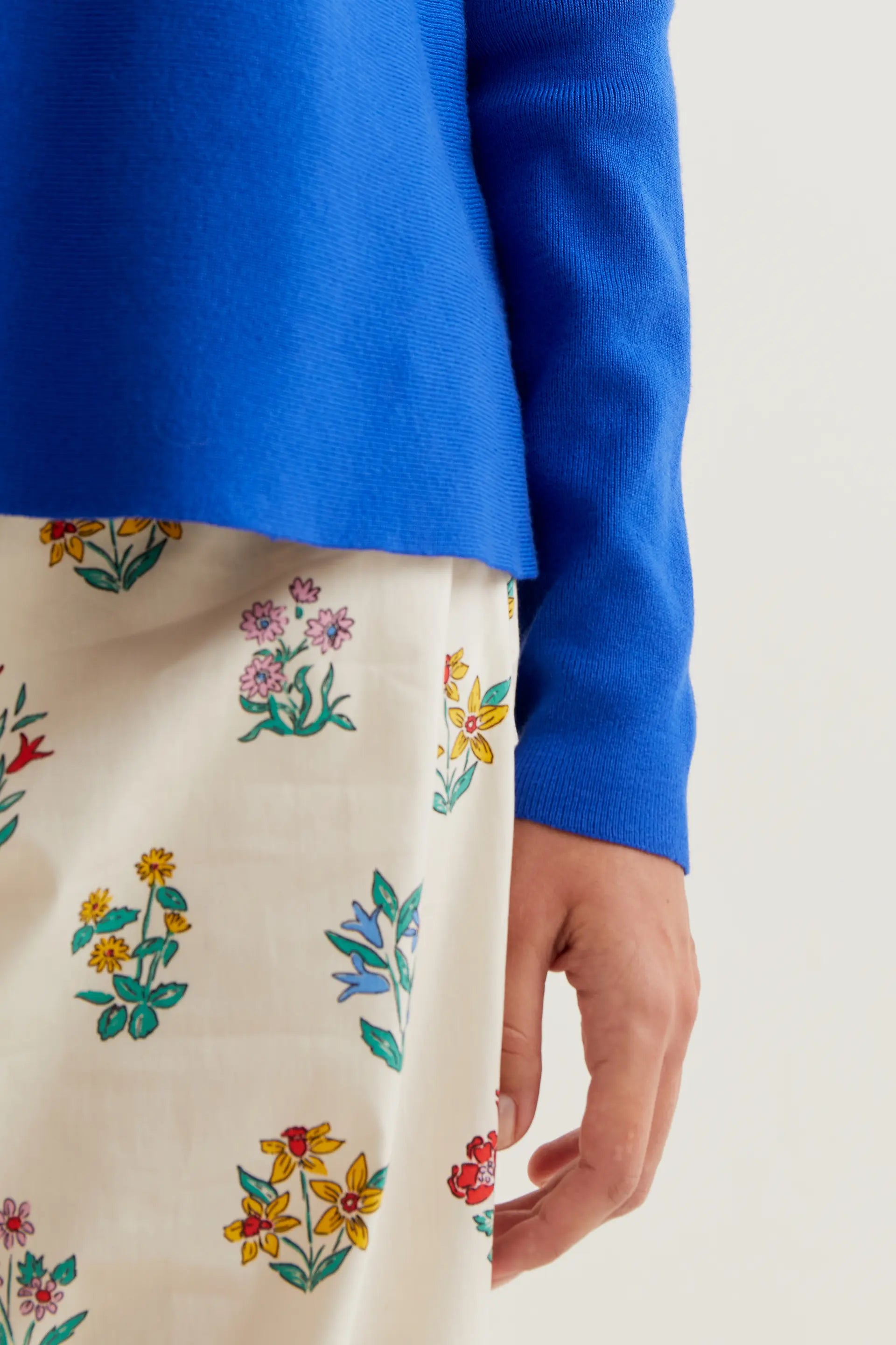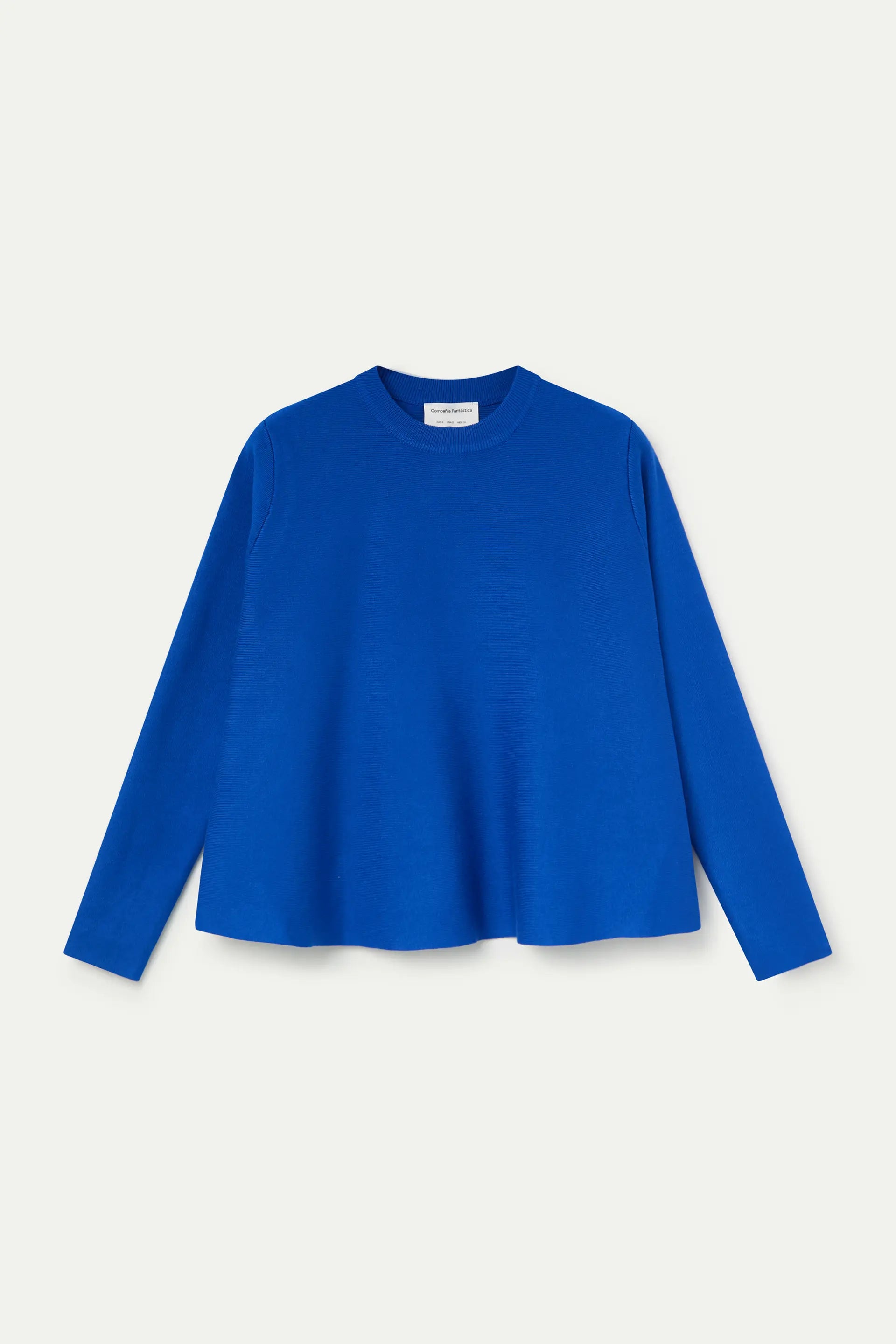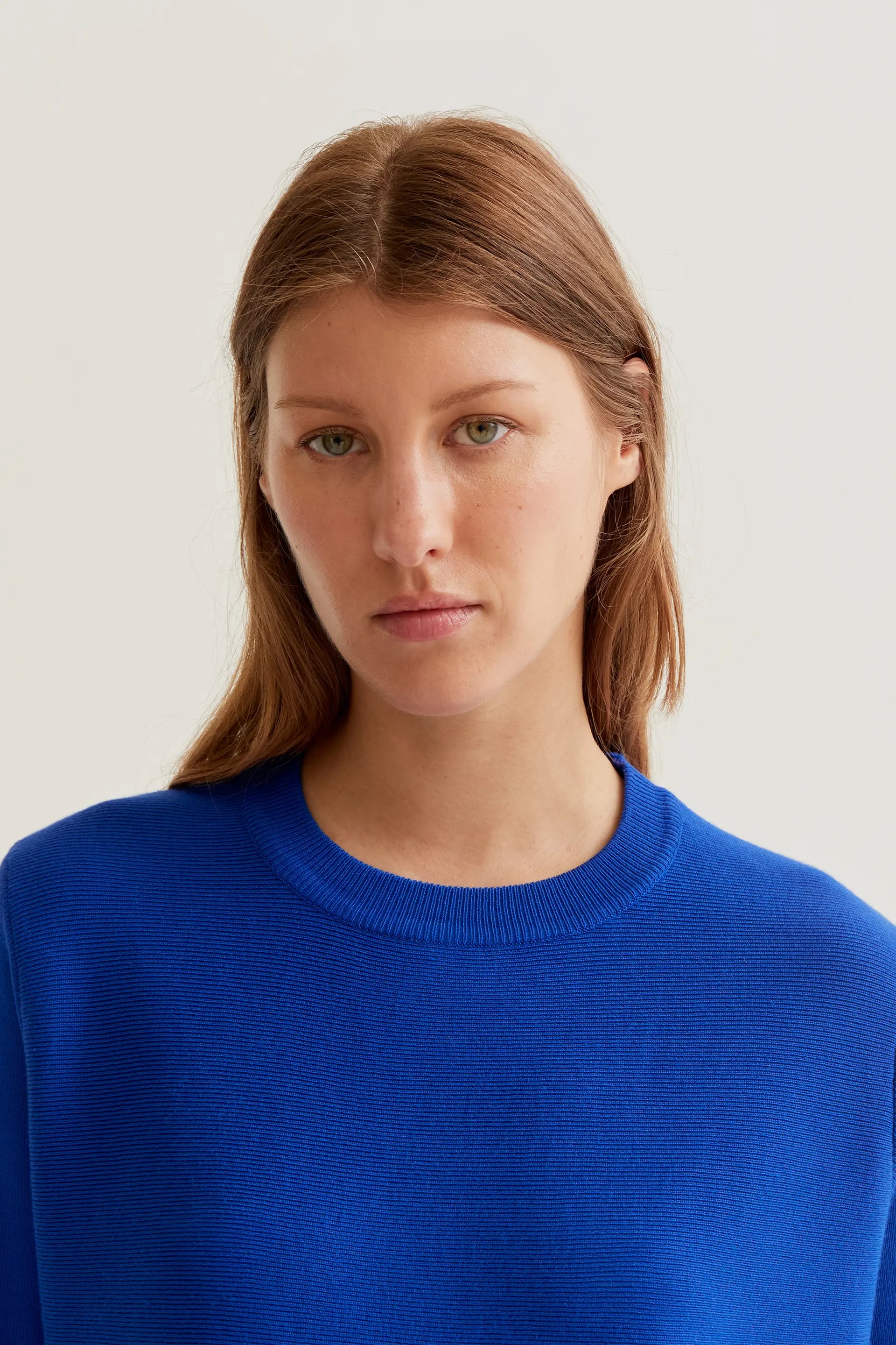 Jersey de tejido punto de color azul. Cuello redondo y manga larga. Detalles acabados en rib. La modelo mide 177 cm y lleva la talla S.