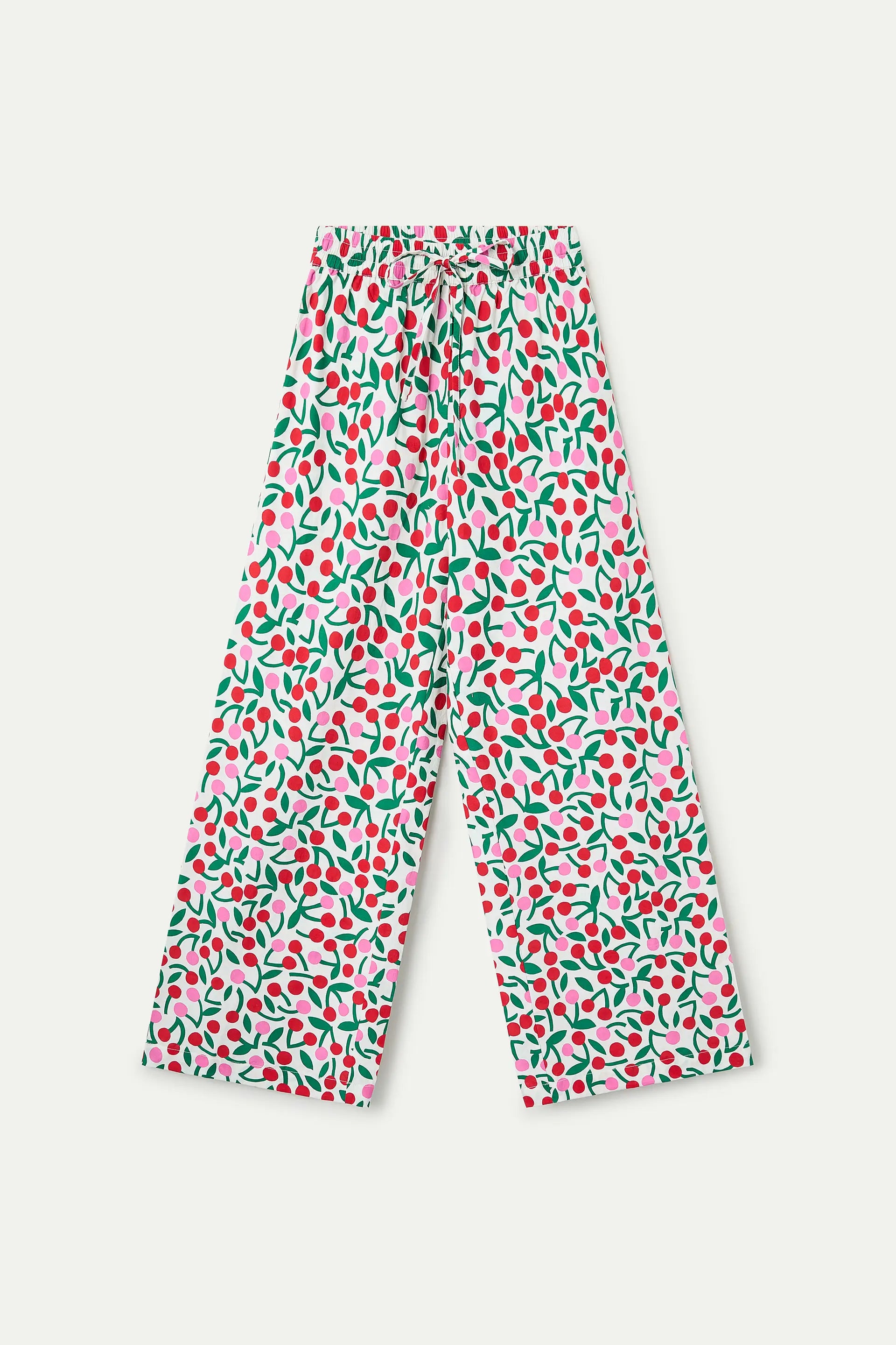 Pantalón de tejido 100% algodón con estampado guinda. Cintura elástica de tiro alto ajustable con cordones. Pernera recta amplia. La modelo mide 175 cm y lleva la talla S.