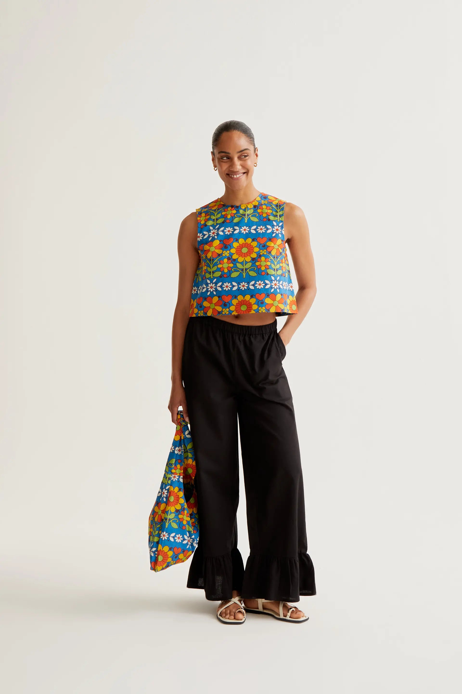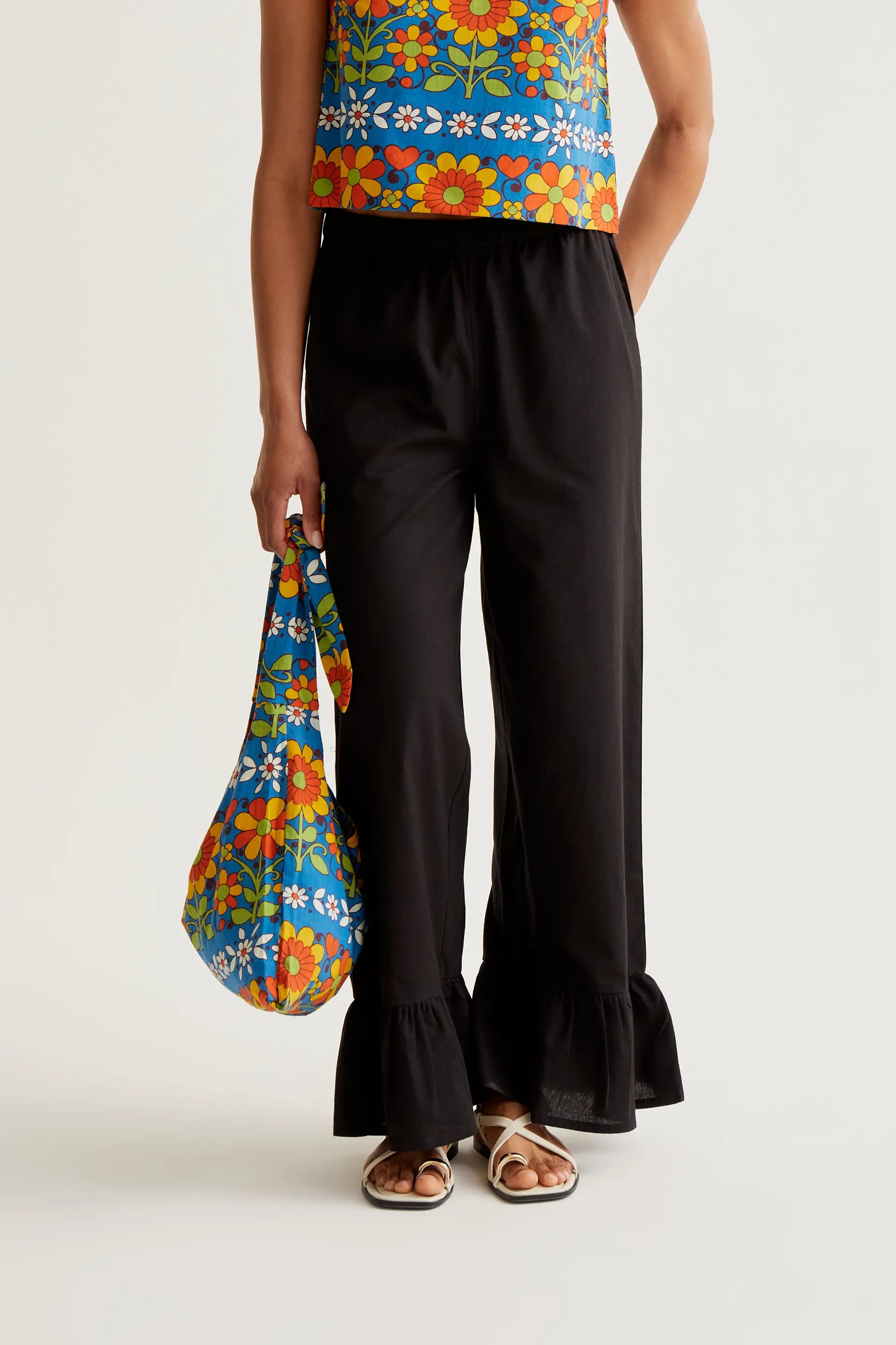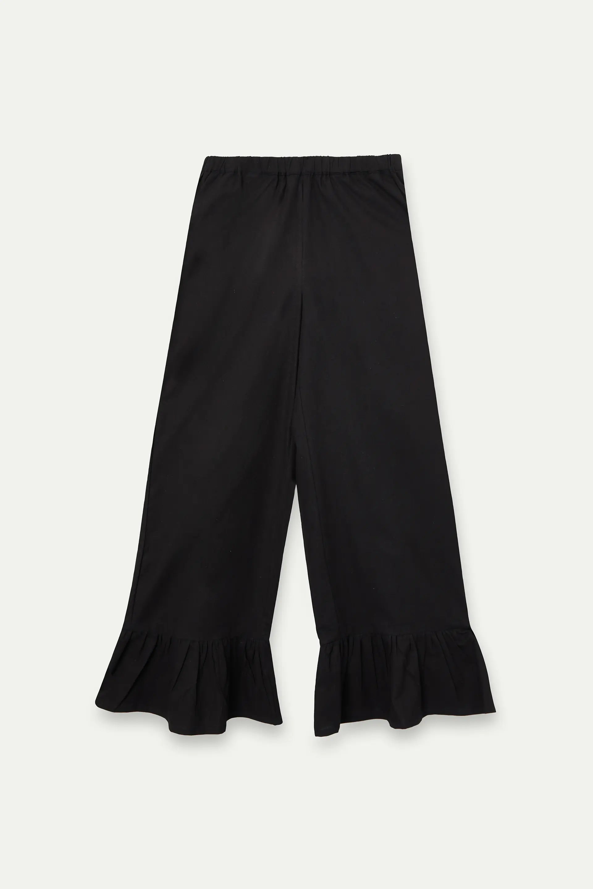 Pantalón de tejido 100% algodón de color negro. Cintura elástica de tiro alto. Pernera recta. Detalle acampanado con volantes. La modelo mide 173 cm y lleva la talla S.