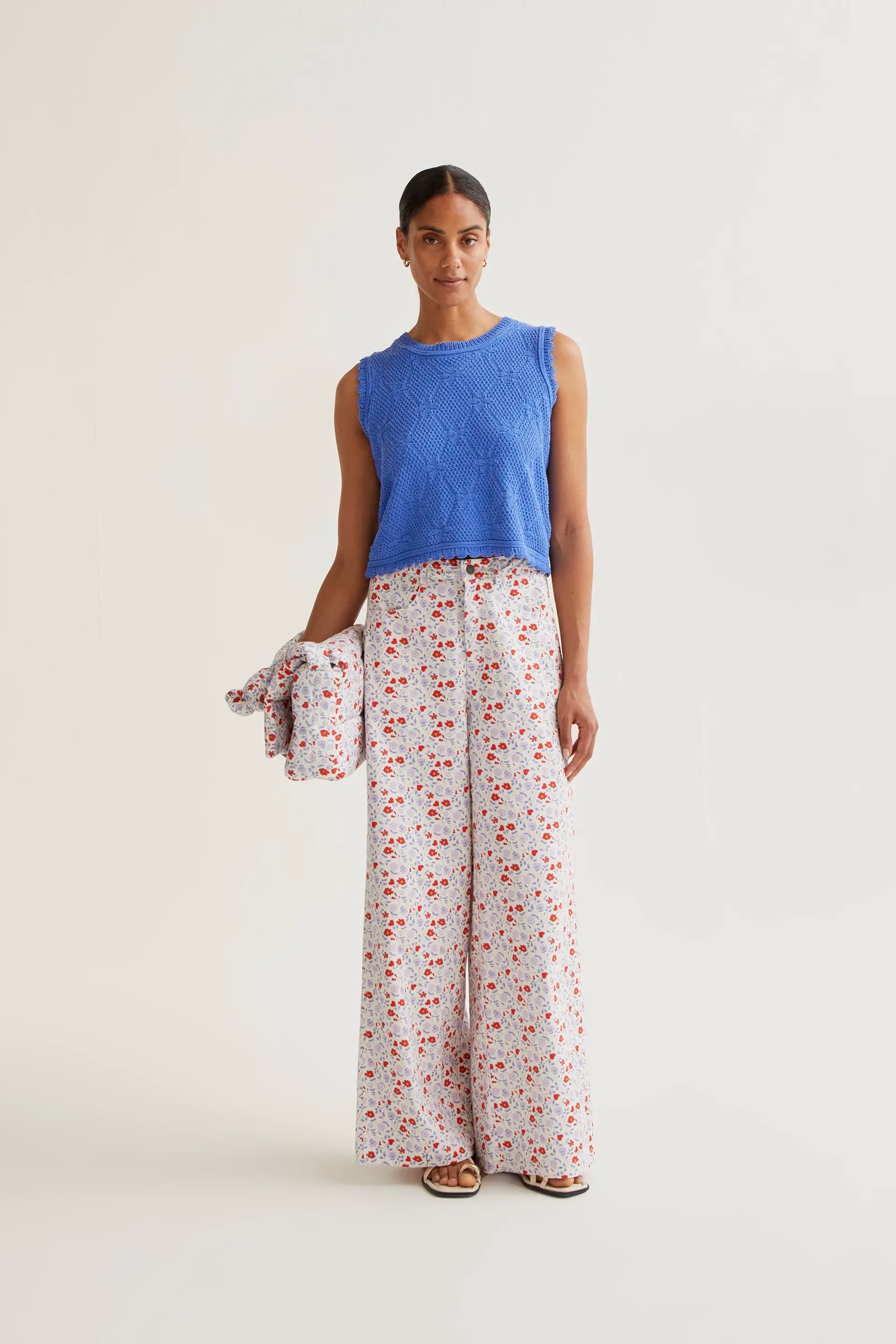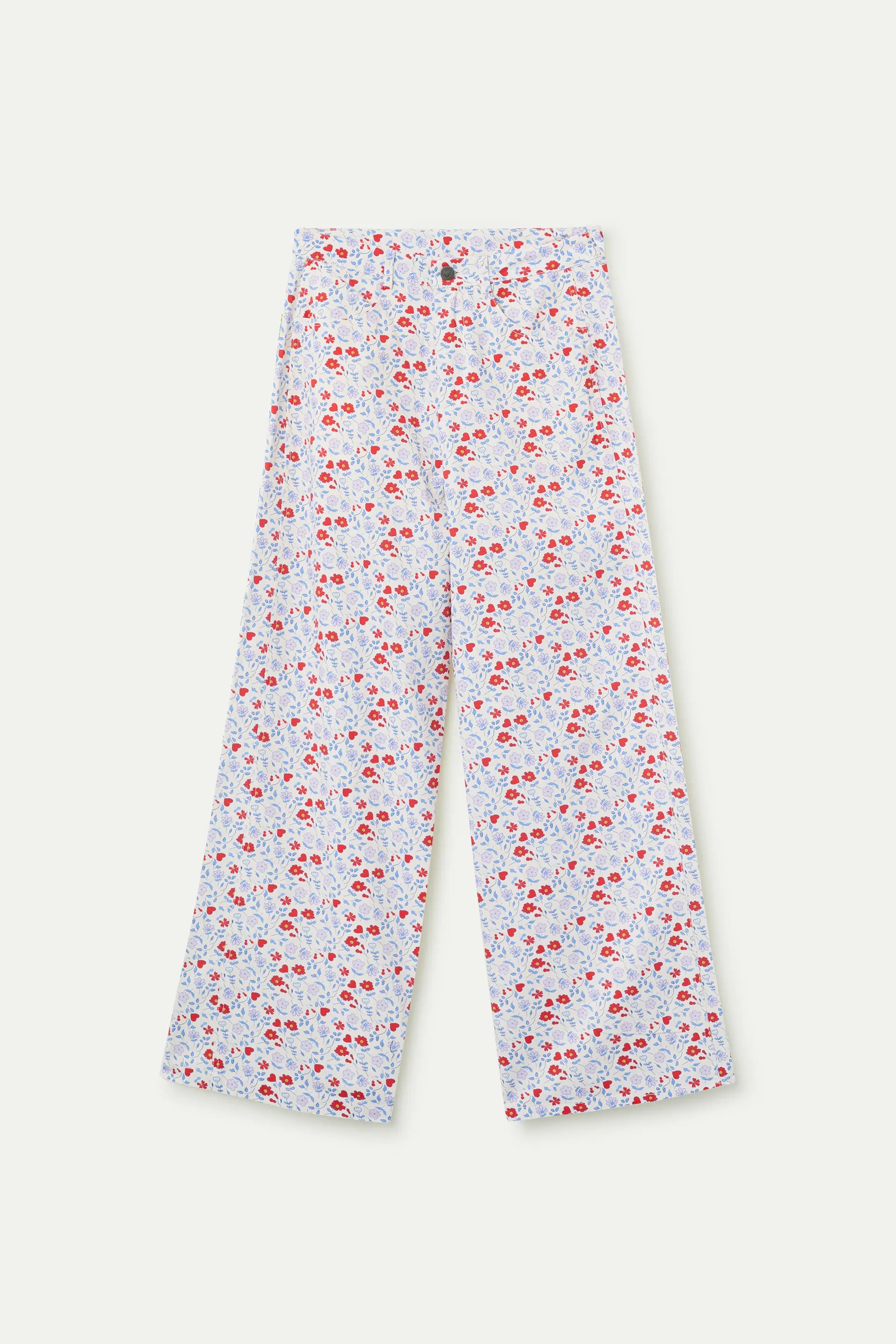 Pantalón de tejido 100% algodón con estampado cute. Cintura fija de tiro alto. Cierre frontal con cremallera y botón.Pernera recta amplia. Bolsillos laterales y posteriores. La modelo mide 173 cm y lleva la talla S.