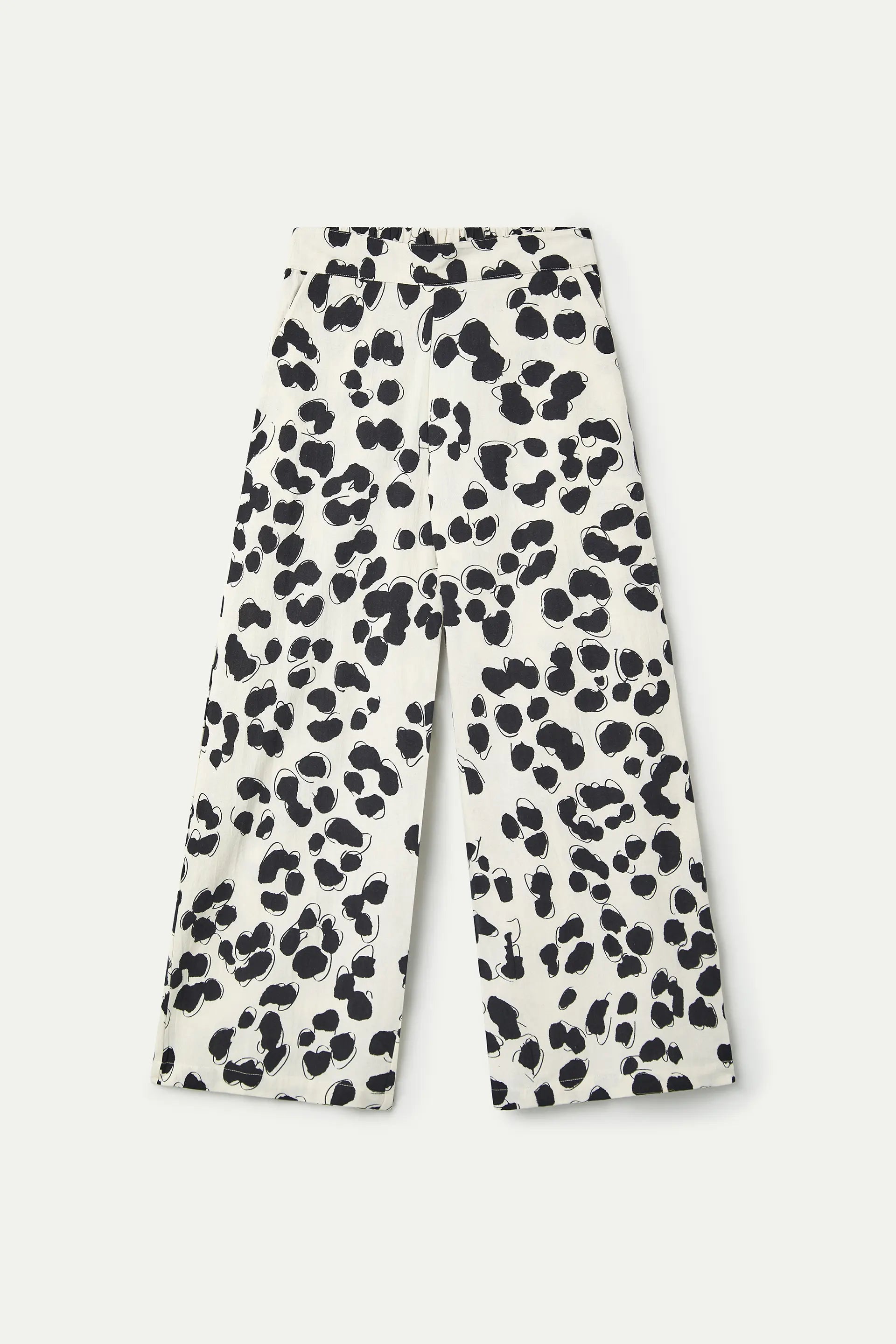 Pantalón de tejido 100% algodón con estampado dalmatian. Cintura fija elástica de tiro medio. Pernera recta. Bolsillos laterales. La modelo mide 177 cm y lleva la talla S.