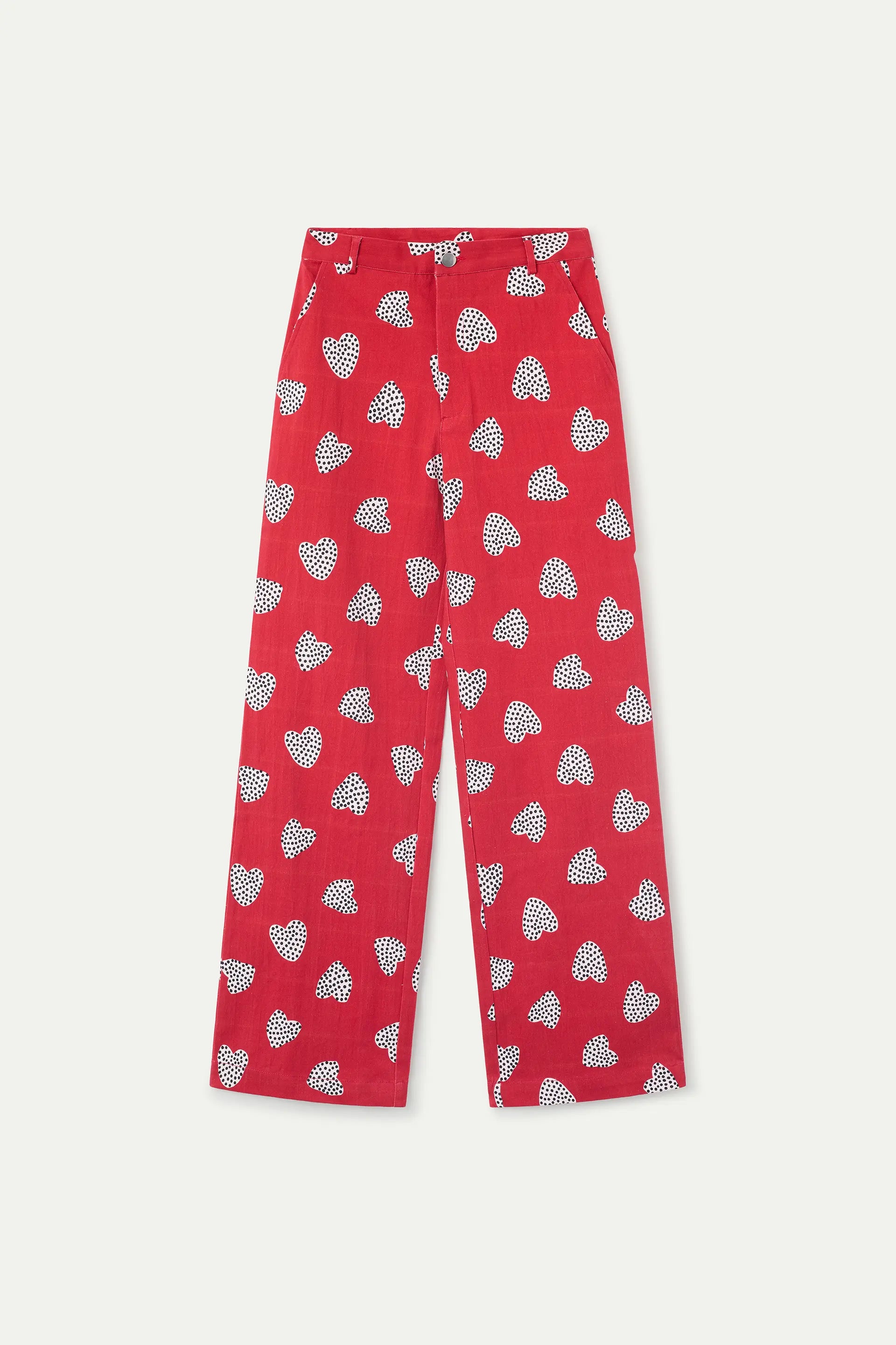 Pantalón de tejido 98% algodón con estampado harmony red. Cintura fija de tiro medio y pernera recta.Cierre frontal con cremallera y botón. Bolsillos laterales. La modelo mide 177 cm y lleva la talla S.