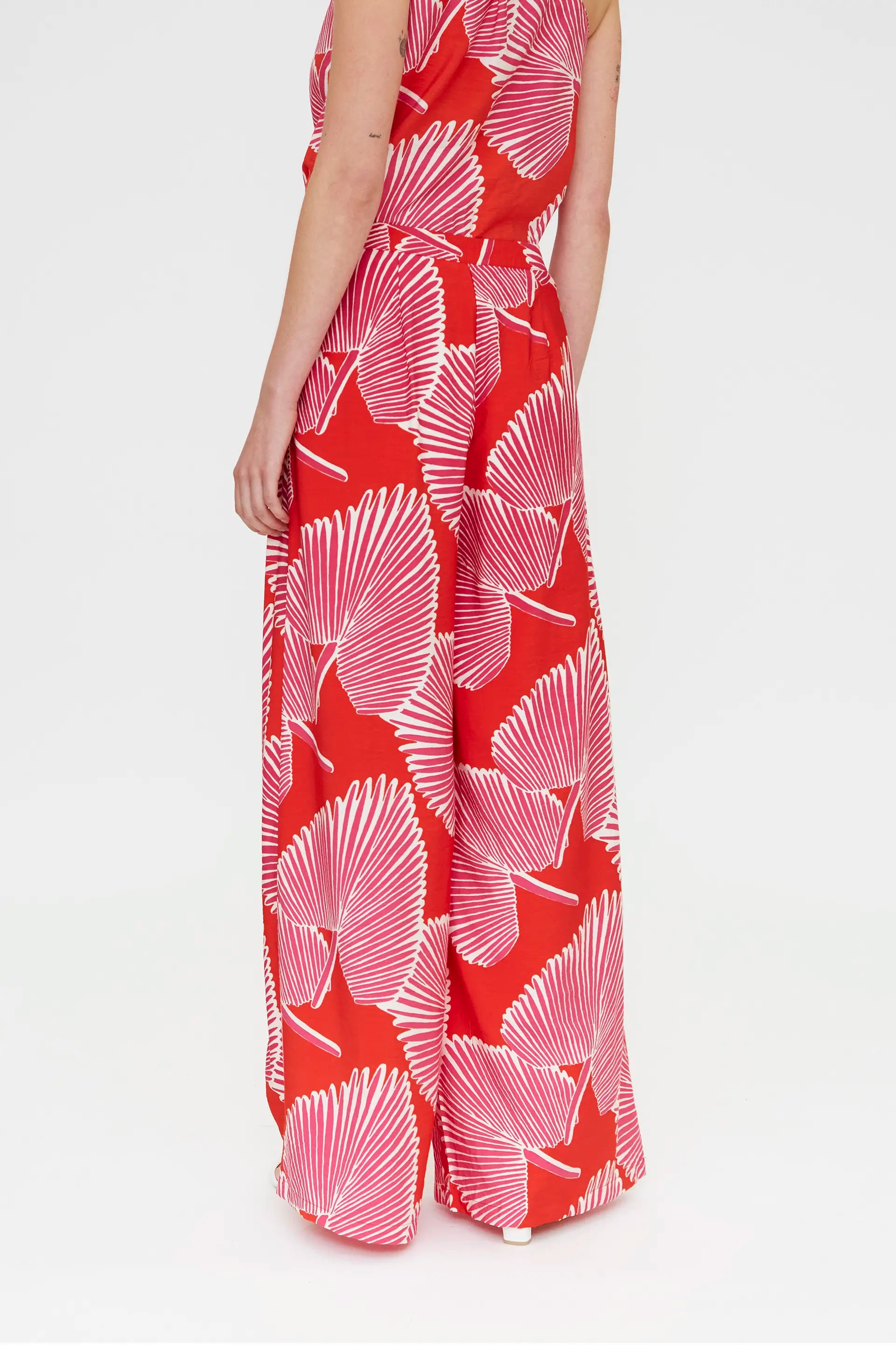 Pantalón de tejido crepé con estampado palmito. Cintura fija de tiro alto y pernera recta amplia. Cierre oculto con cremallera. La modelo mide 177 cm y lleva la talla S.