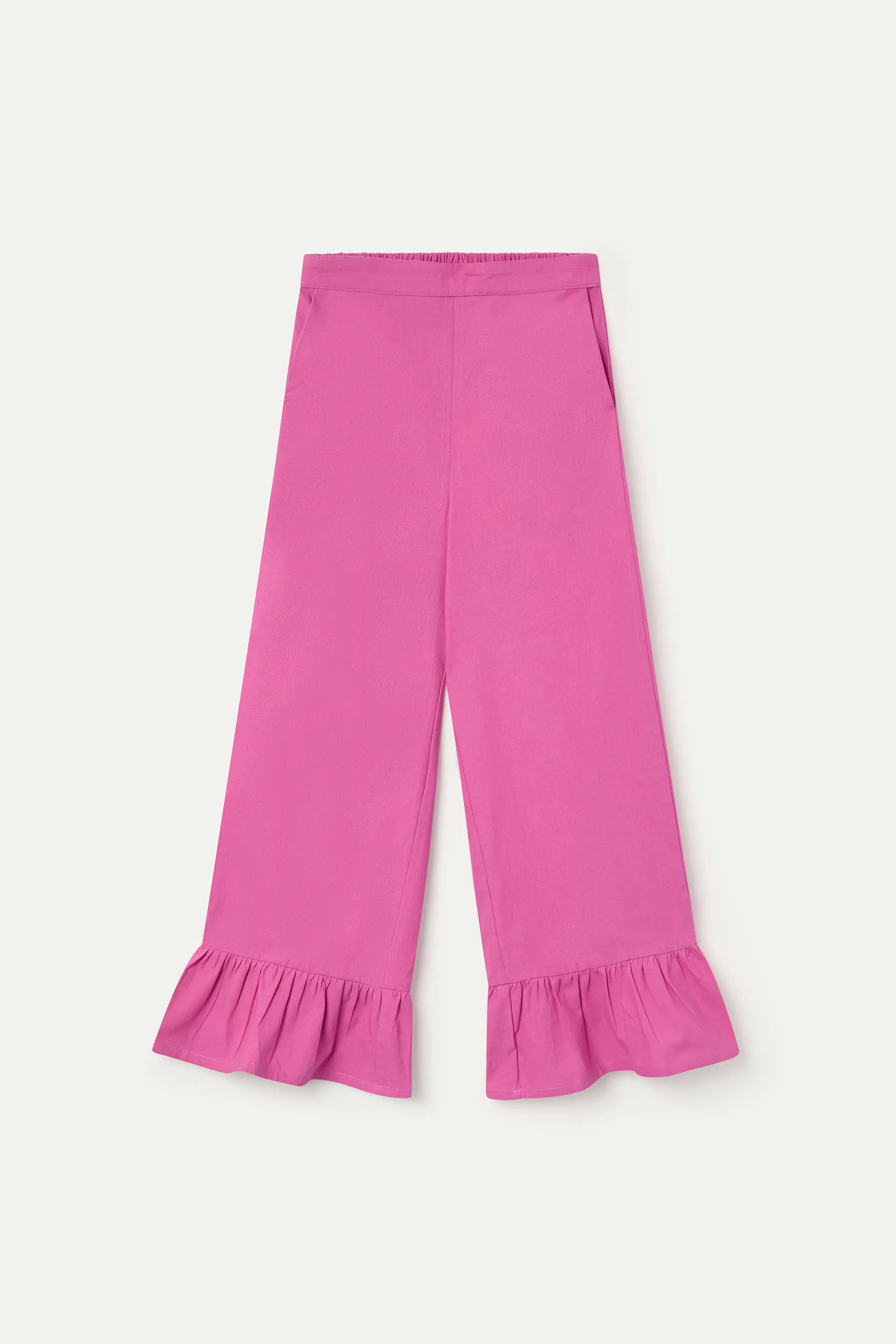 Pantalón de niña con tejido 100% algodón de color rosa. Cintura elástica de tiro alto. Pernera recta. Detalle de volantes. La modelo mide 136 cm y lleva la talla 8-9 años.