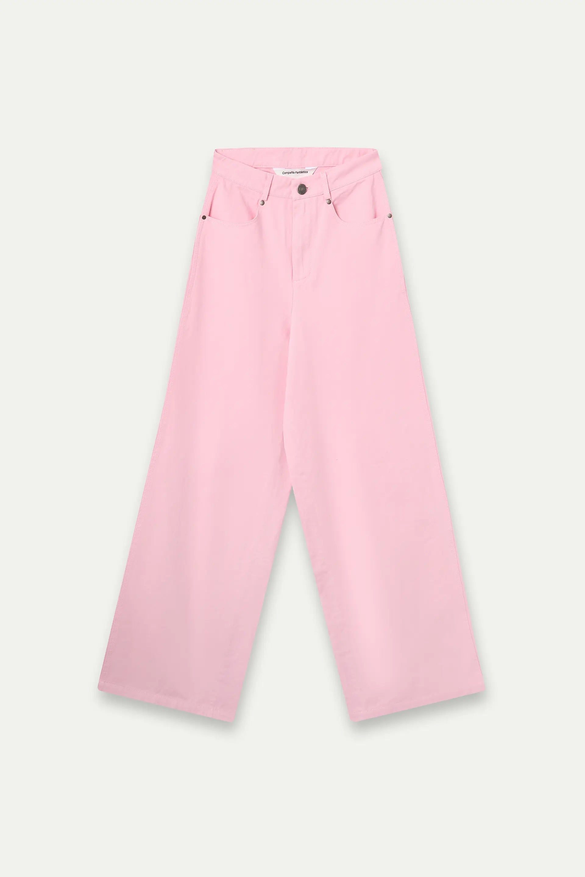 Pantalón con tejido 100% algodón de color rosa. Cintura fija de tiro alto y pernera amplia. Cierre frontal con cremallera y botón. Bolsillos laterales y posterior. La modelo mide 177 cm y lleva la talla S.
