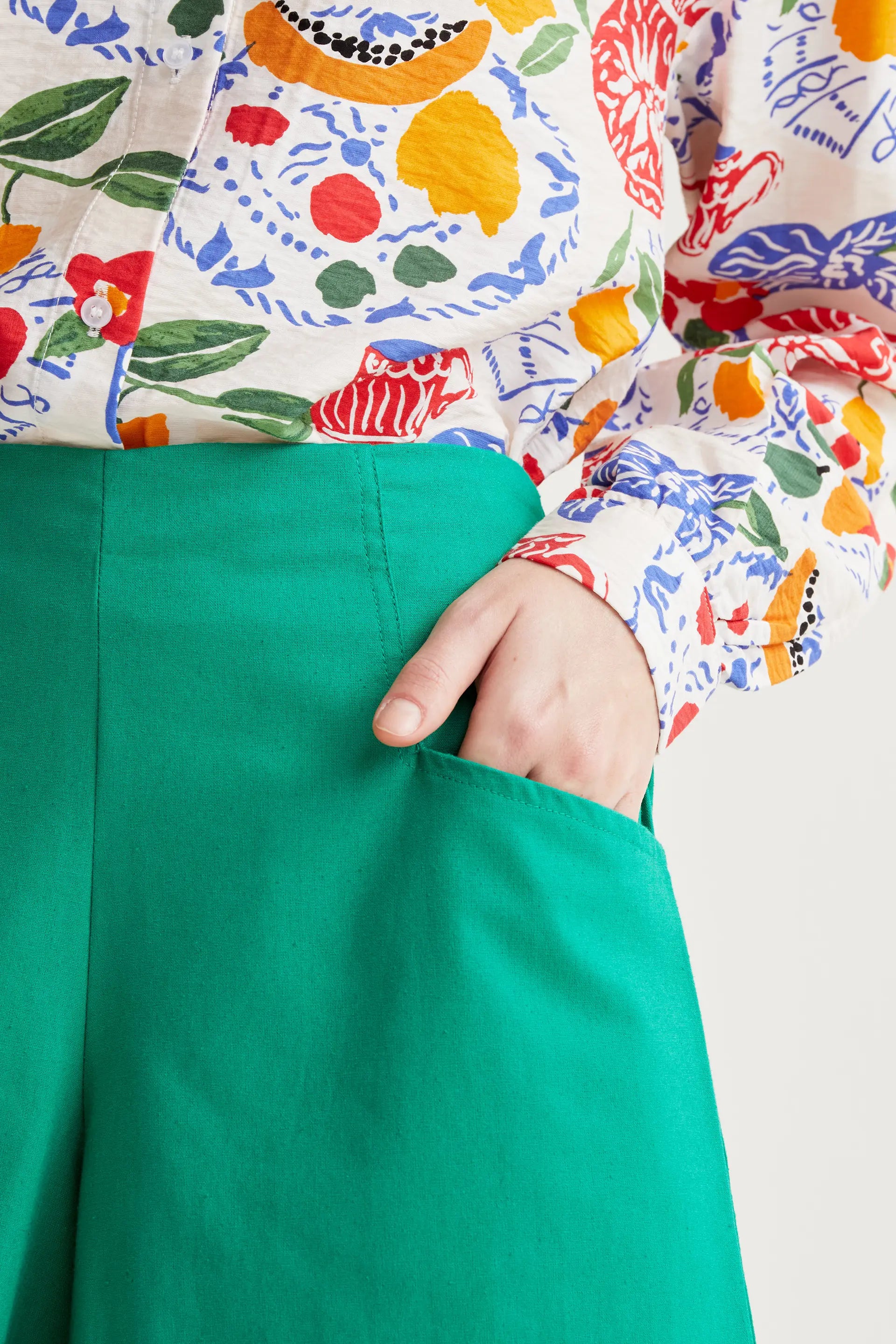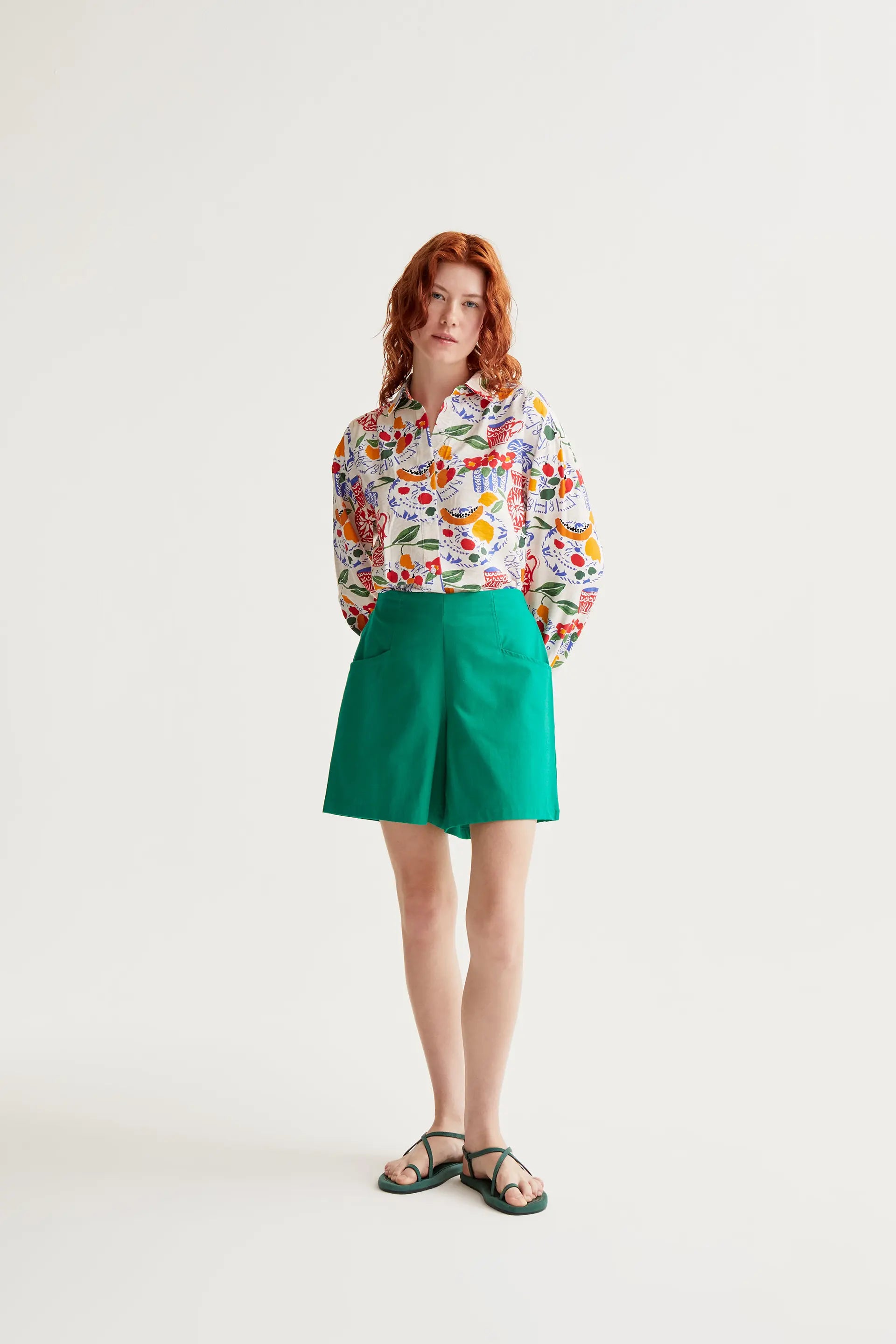 Shorts de tejido 100% algodón de color verde. Cintura elástica de tiro alto. Bolsillo lateral. La modelo mide 175 cm y lleva la talla S.
