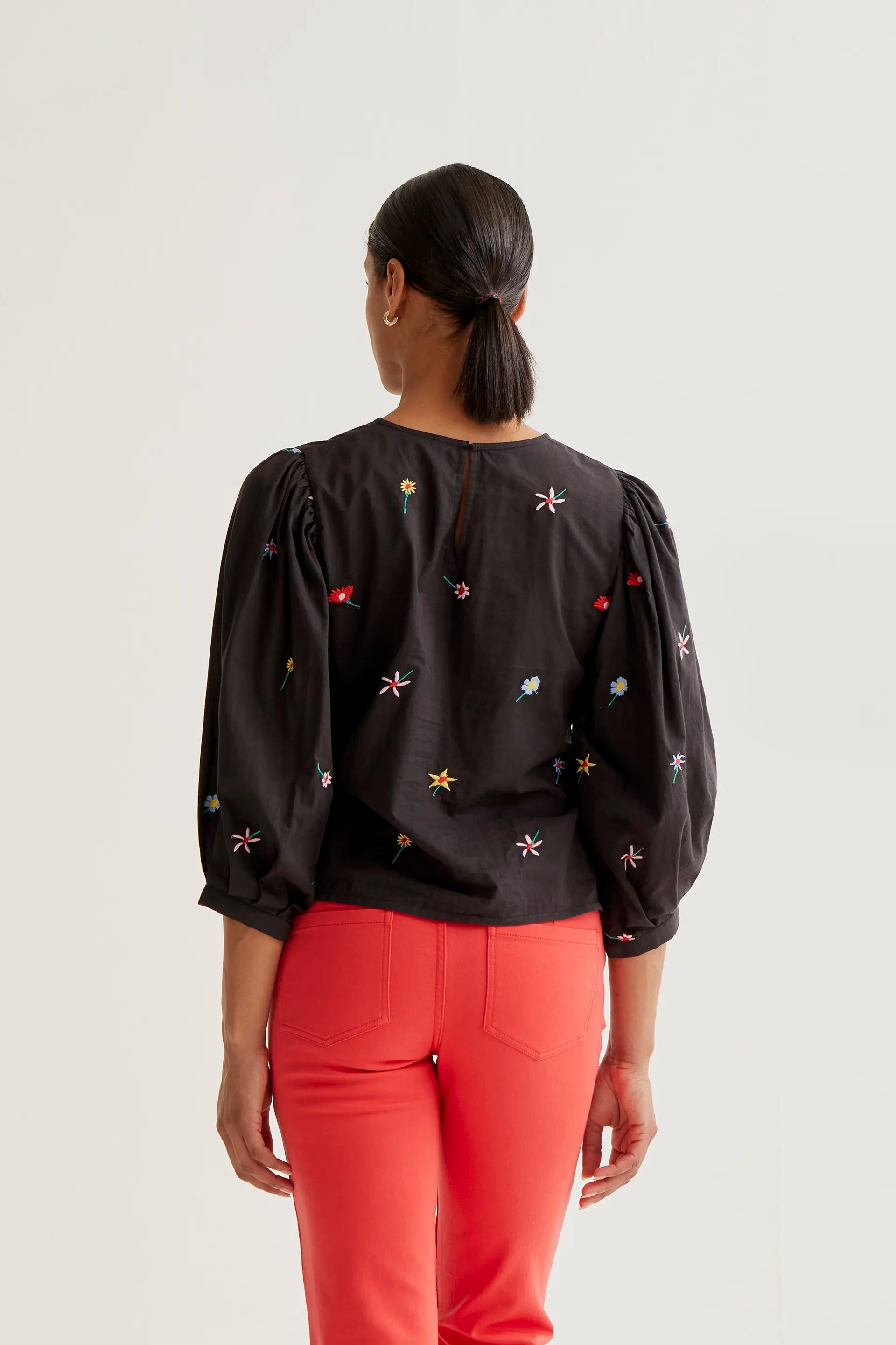 Top con estampado black gardener flowers. Cuello redondo y manga ligeramente abullonada. Cierre posterior con botón oculto. La modelo mide 173 cm y lleva la talla S.
