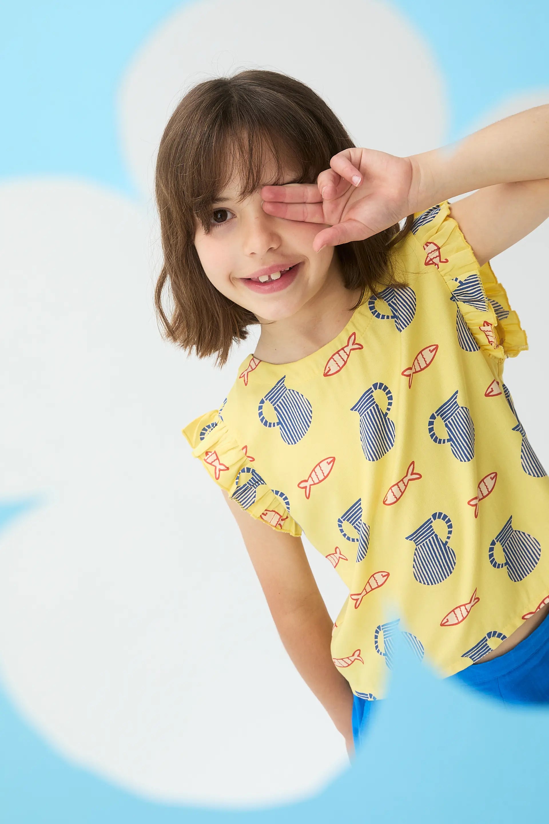Top de niña con tejido estampado brava. Cuello redondo y sin mangas con detalles en volantes. La modelo mide 127 cm y lleva la talla 8-9 años.