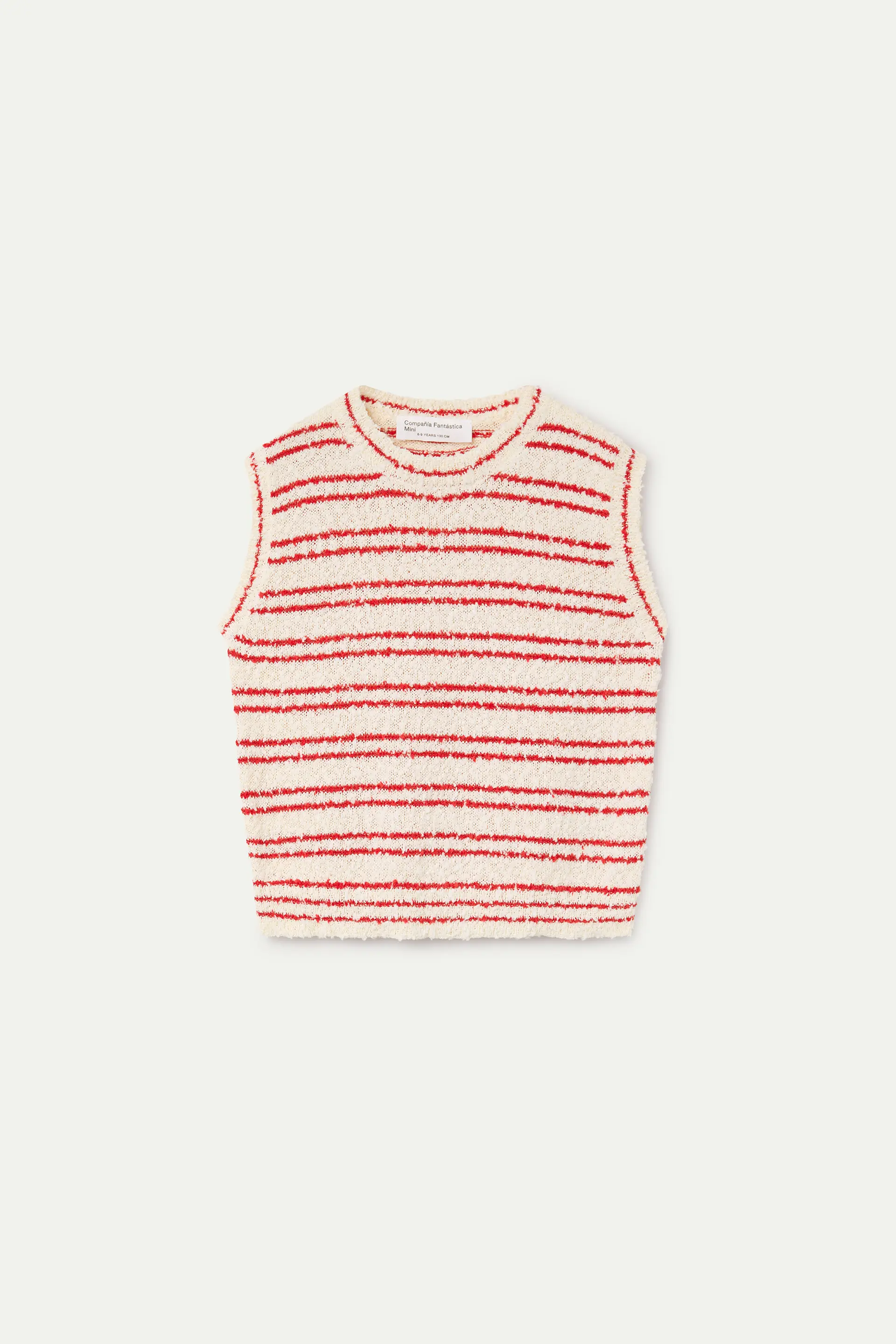 Top de niña con tejido punto estampado de rayas de color blanco y rojo. Cuello redondo y sin mangas. La modelo mide 136 cm y lleva la talla 8-9 años.