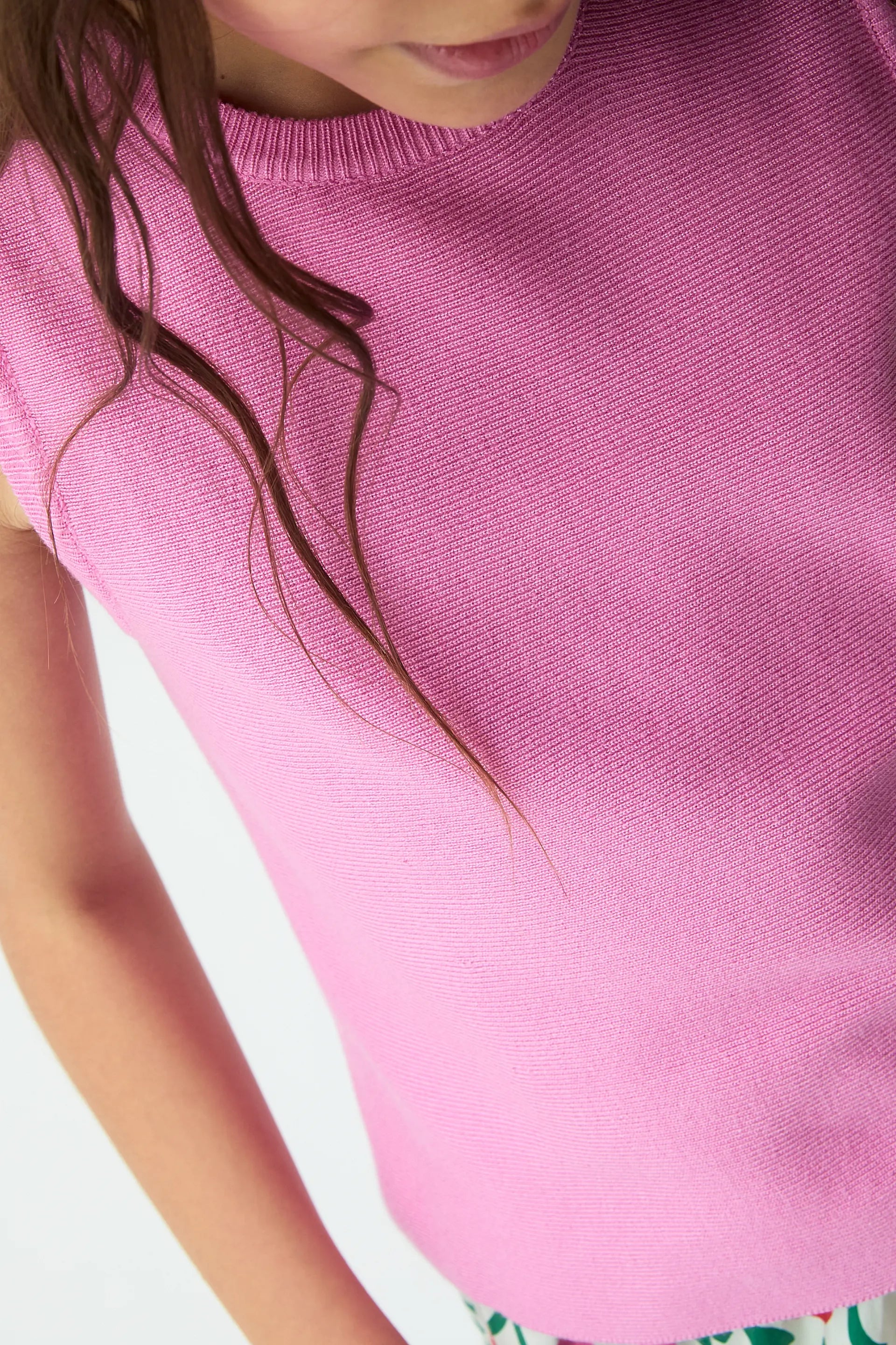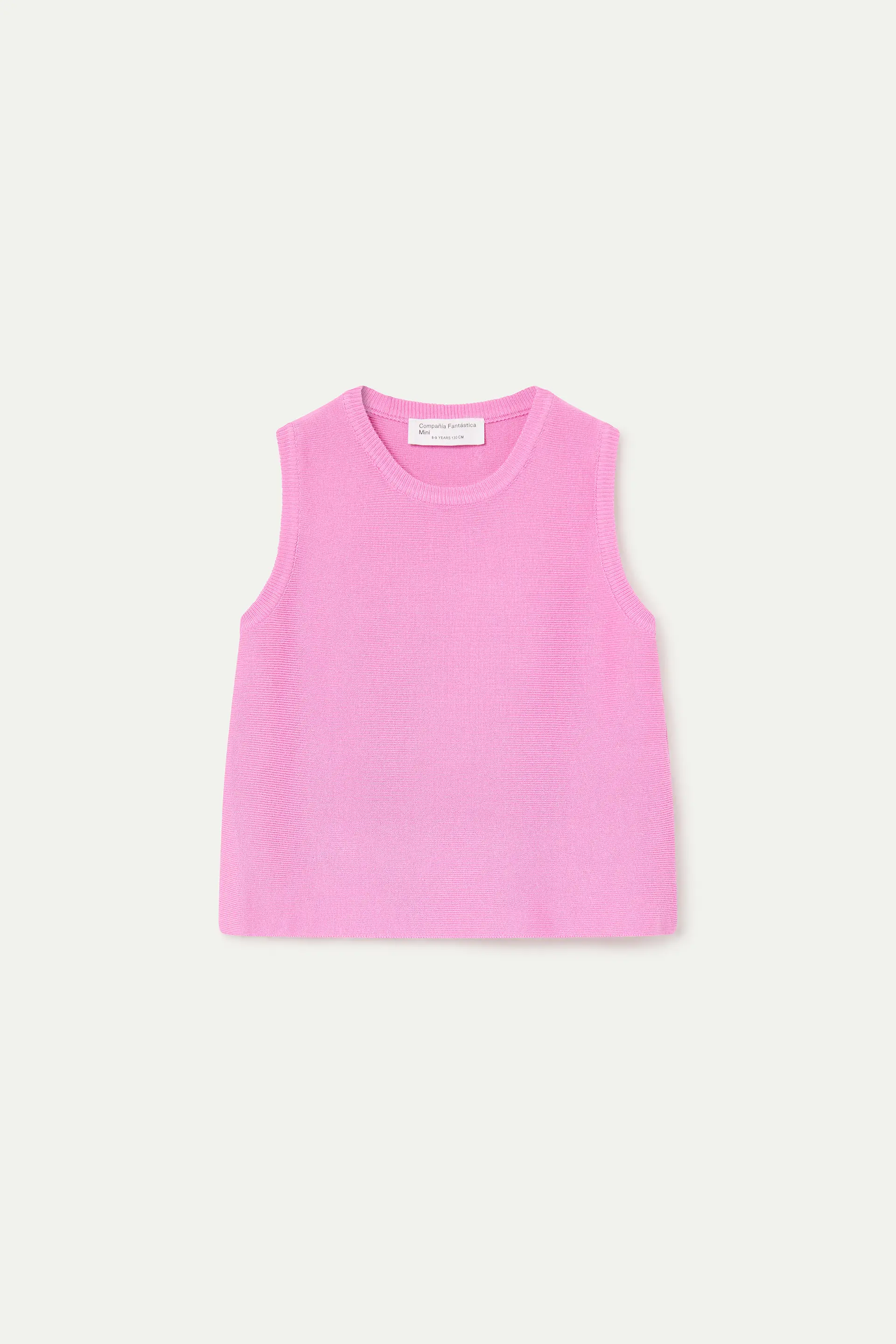 Top de niña con tejido de punto de color rosado. Cuello redondo y sin mangas. Detalles acabados en rib. La modelo mide 136 cm y lleva la talla 8-9 años.