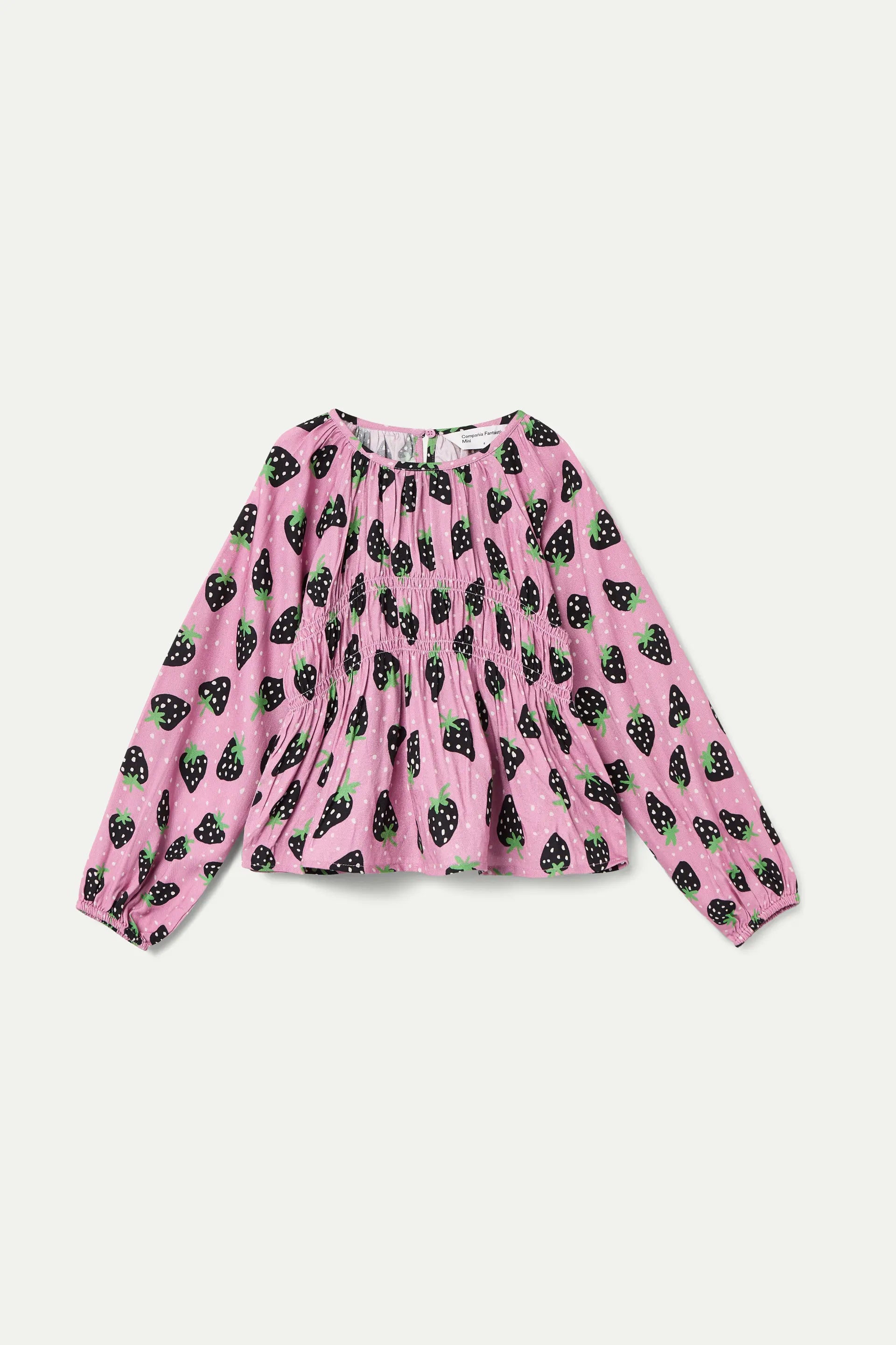 Top de niña de manga larga con estampado de fresas negras sobre fondo rosa Morango. Cuello redondo, frunces en la parte frontal y mangas largas con puños elásticos fruncidos.