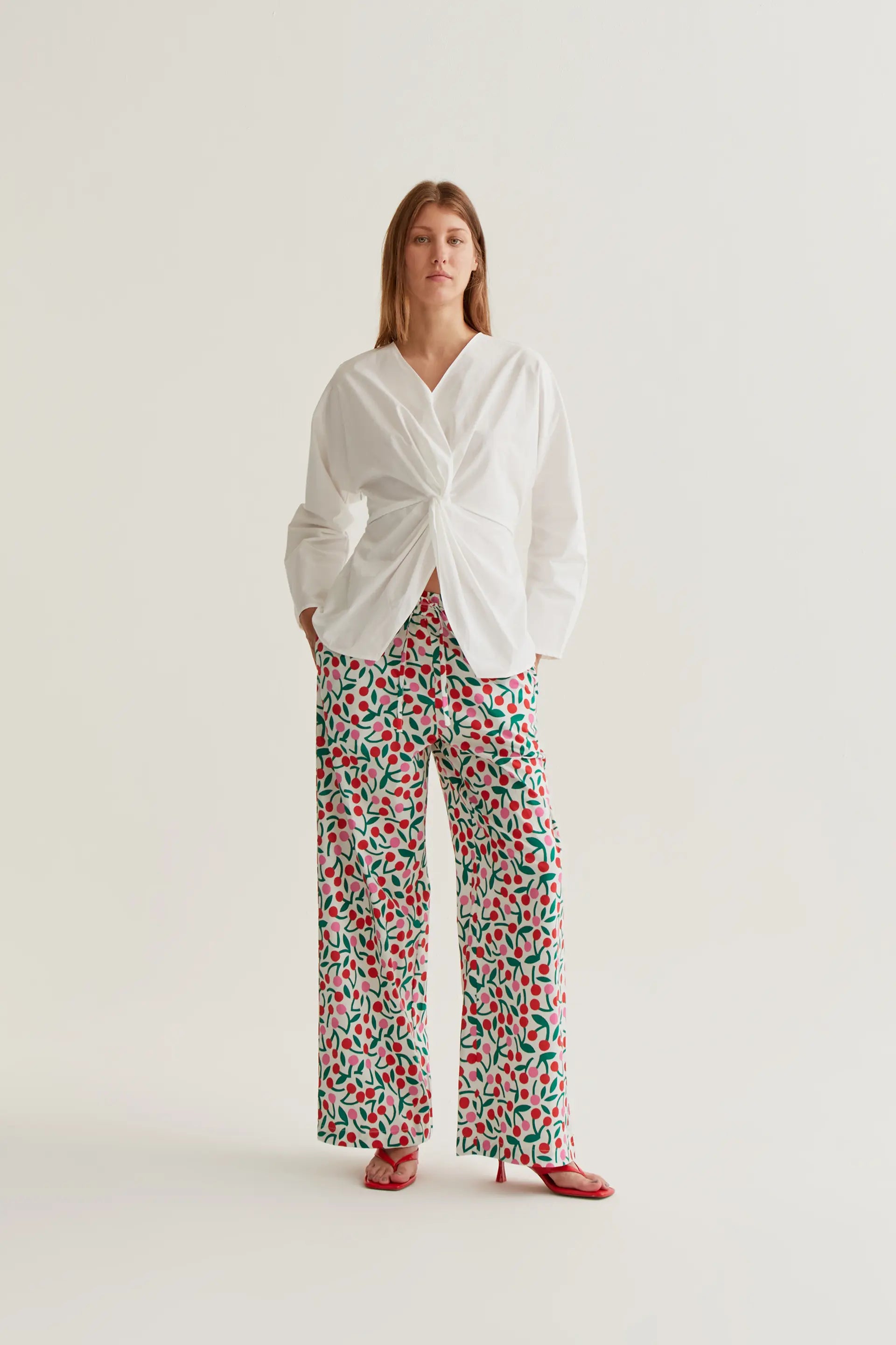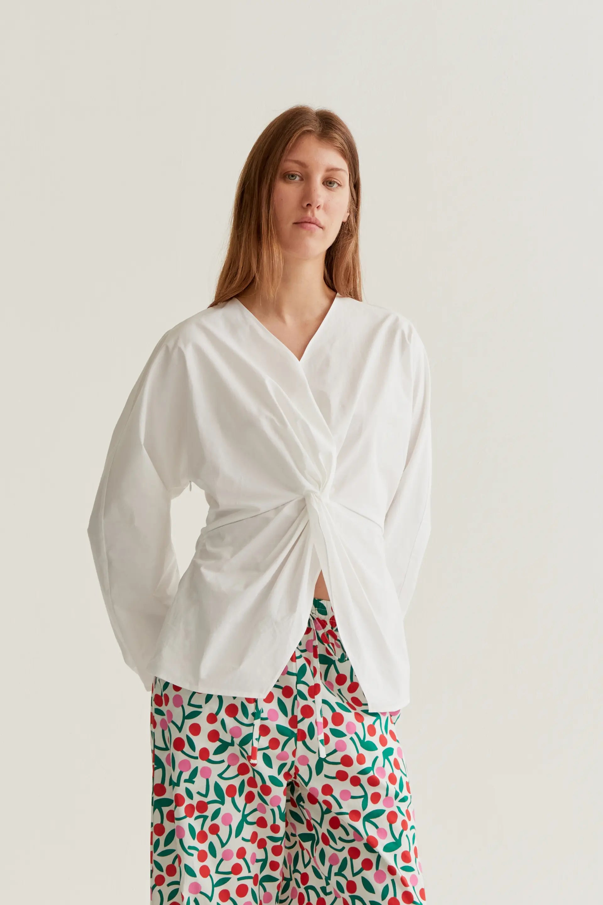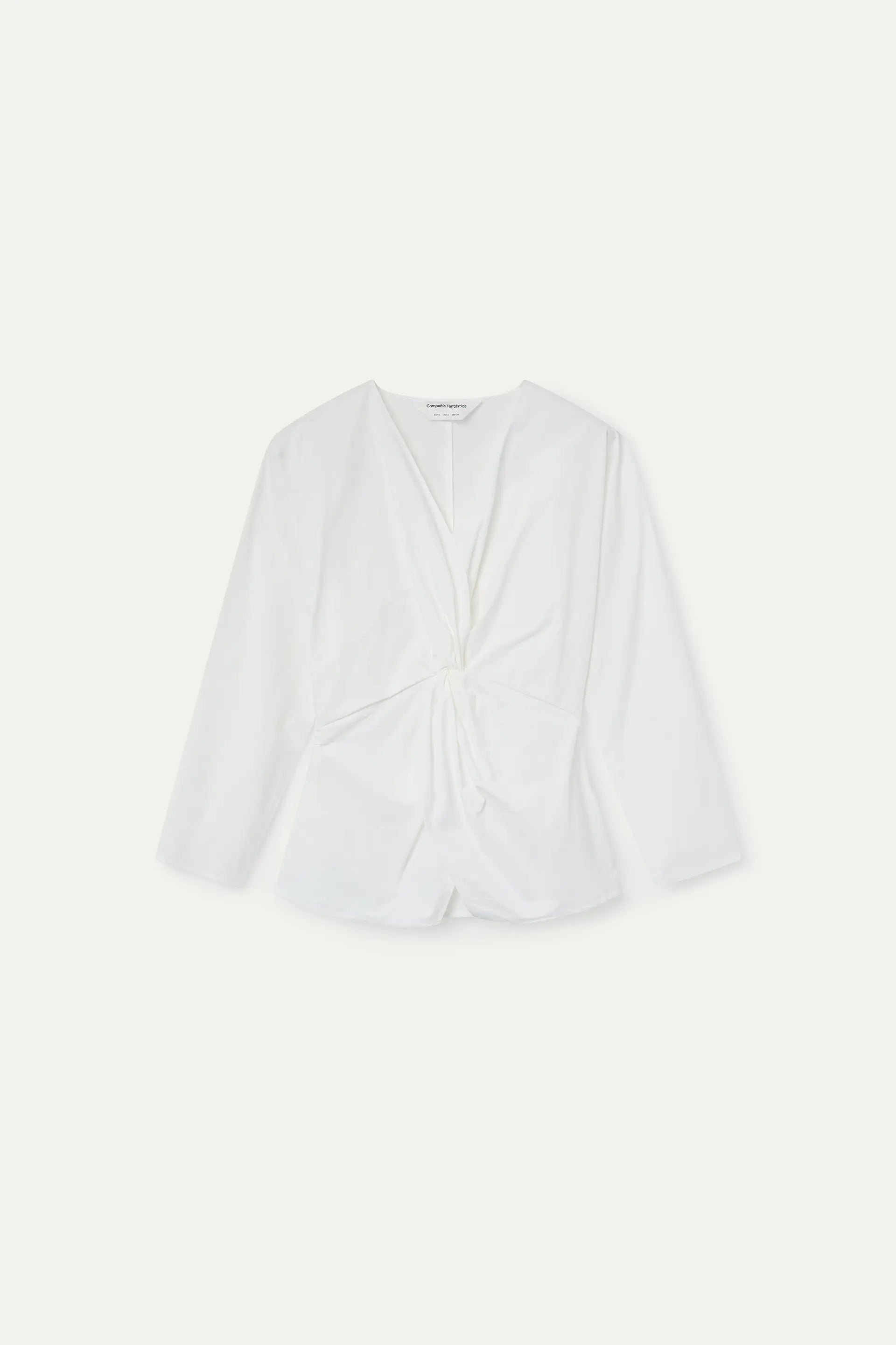 Top de tejido 100% algodón de color blanco. Escote pico y manga larga. Detalle drapeado central. La modelo mide 177 cm y lleva la talla S.