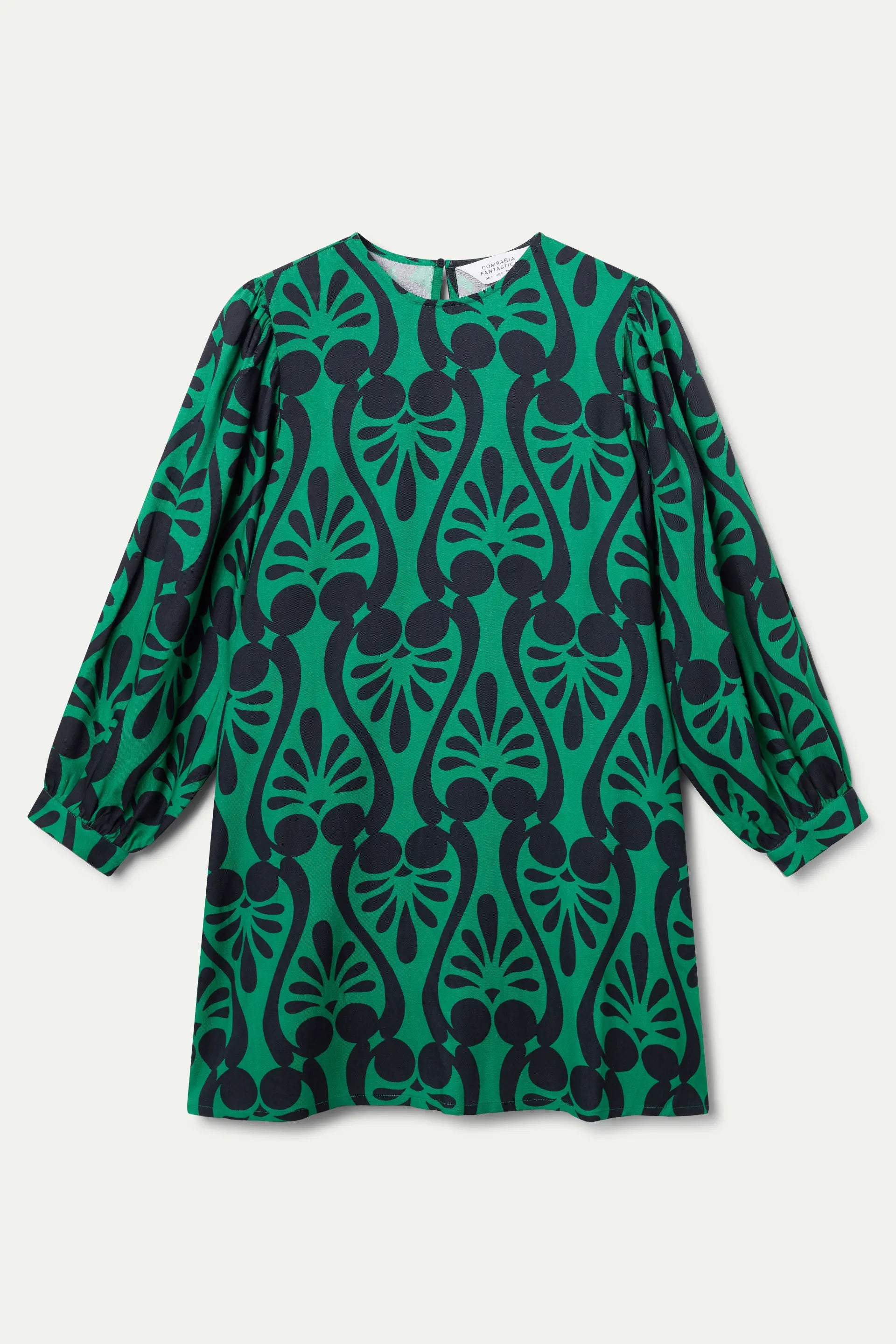 Vestido corto con estampado Baroque. Con cuello redondo y manga larga francesa. Cierre trasero con botón. La modelo mide 179 cm y lleva la talla S.
