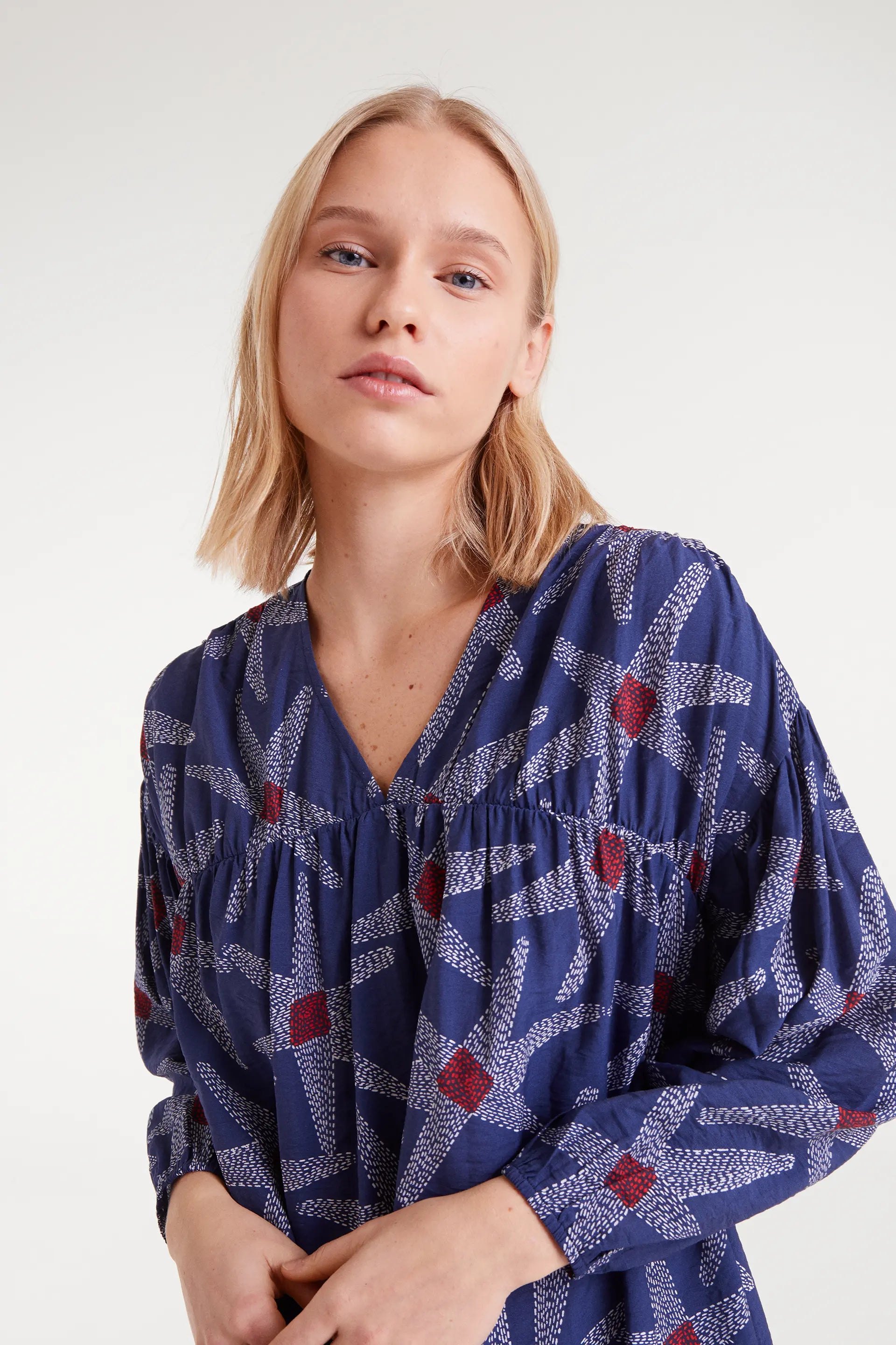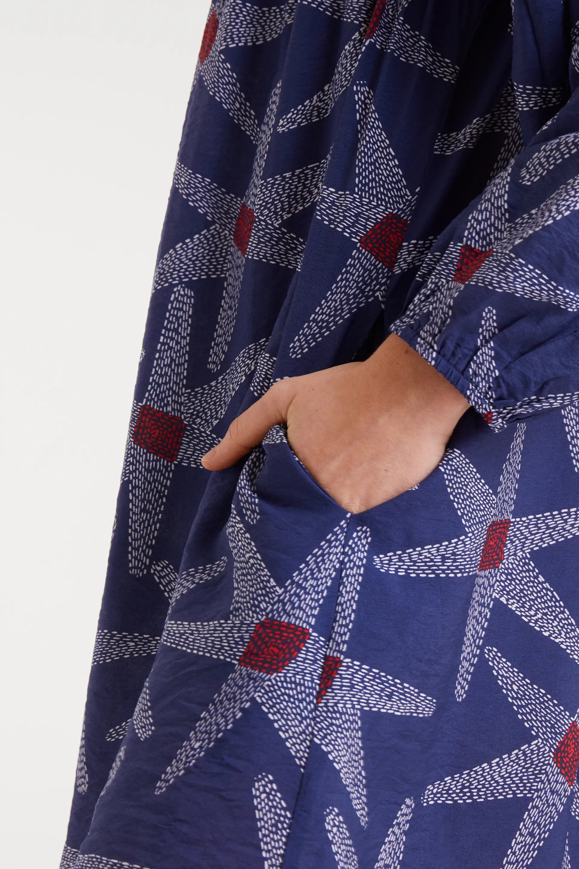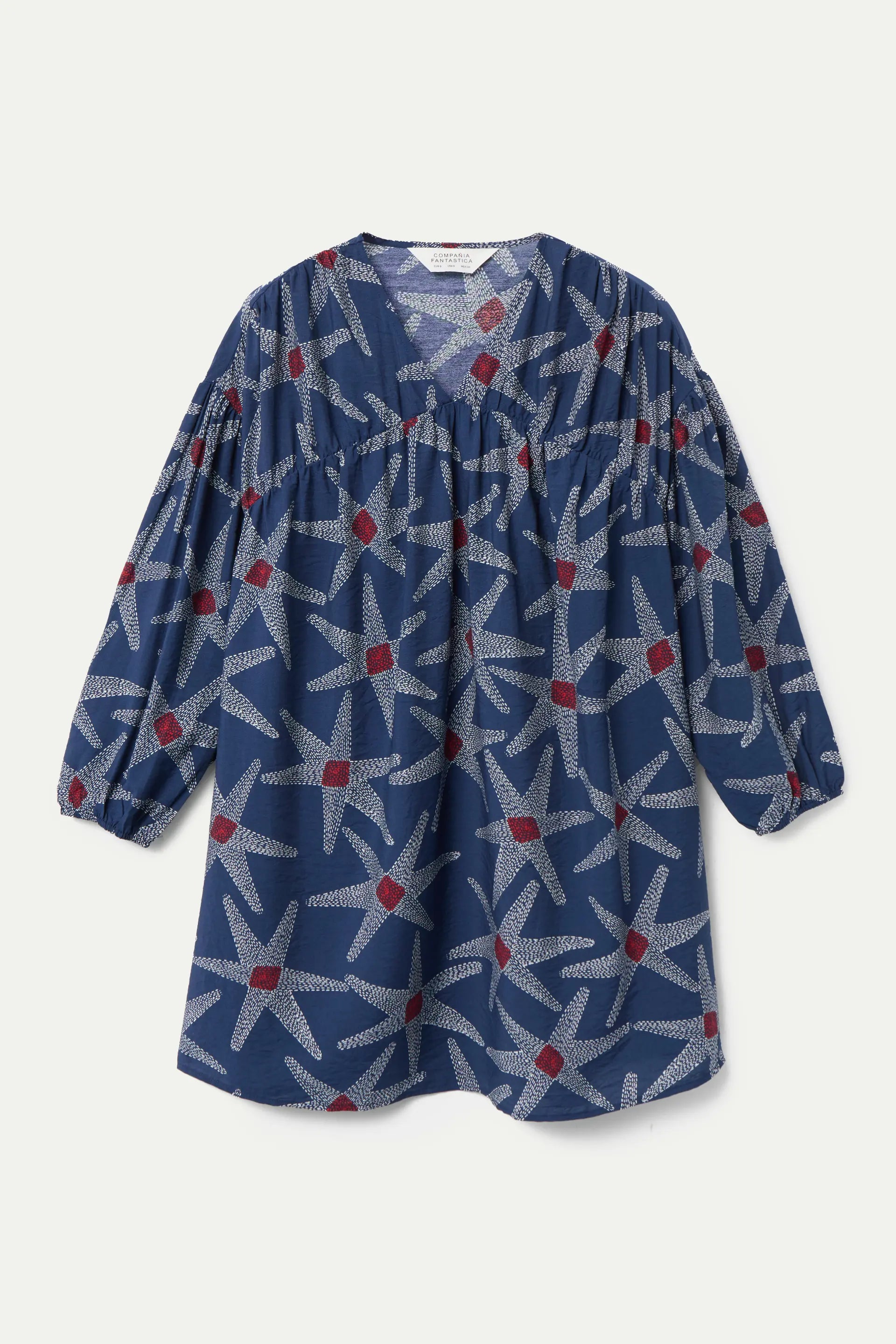Vestido corto de tejido crepé ligero con estampado satarships. Escote pico y manga larga con puño elástico. Bolsillos laterales.