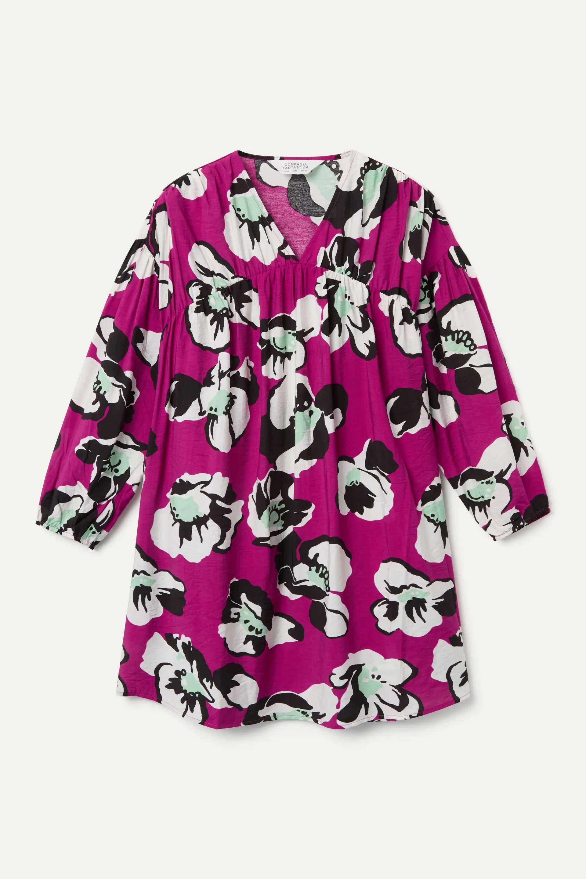 Vestido corto de tejido crepé ligero con estampado vivid viola. Escote pico y manga larga con puño con goma elástica. Bolsillos laterales.