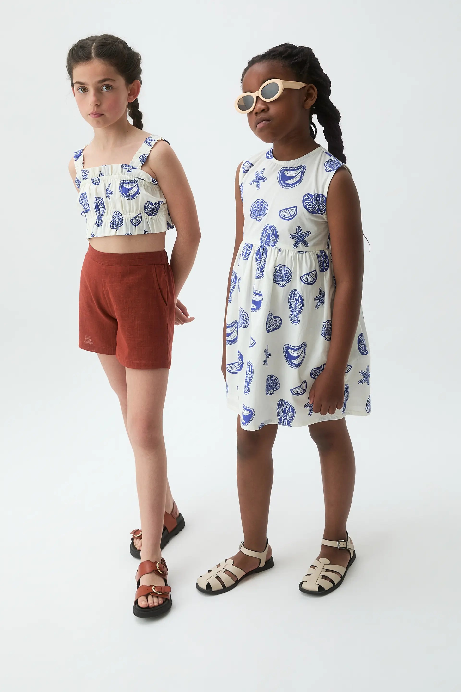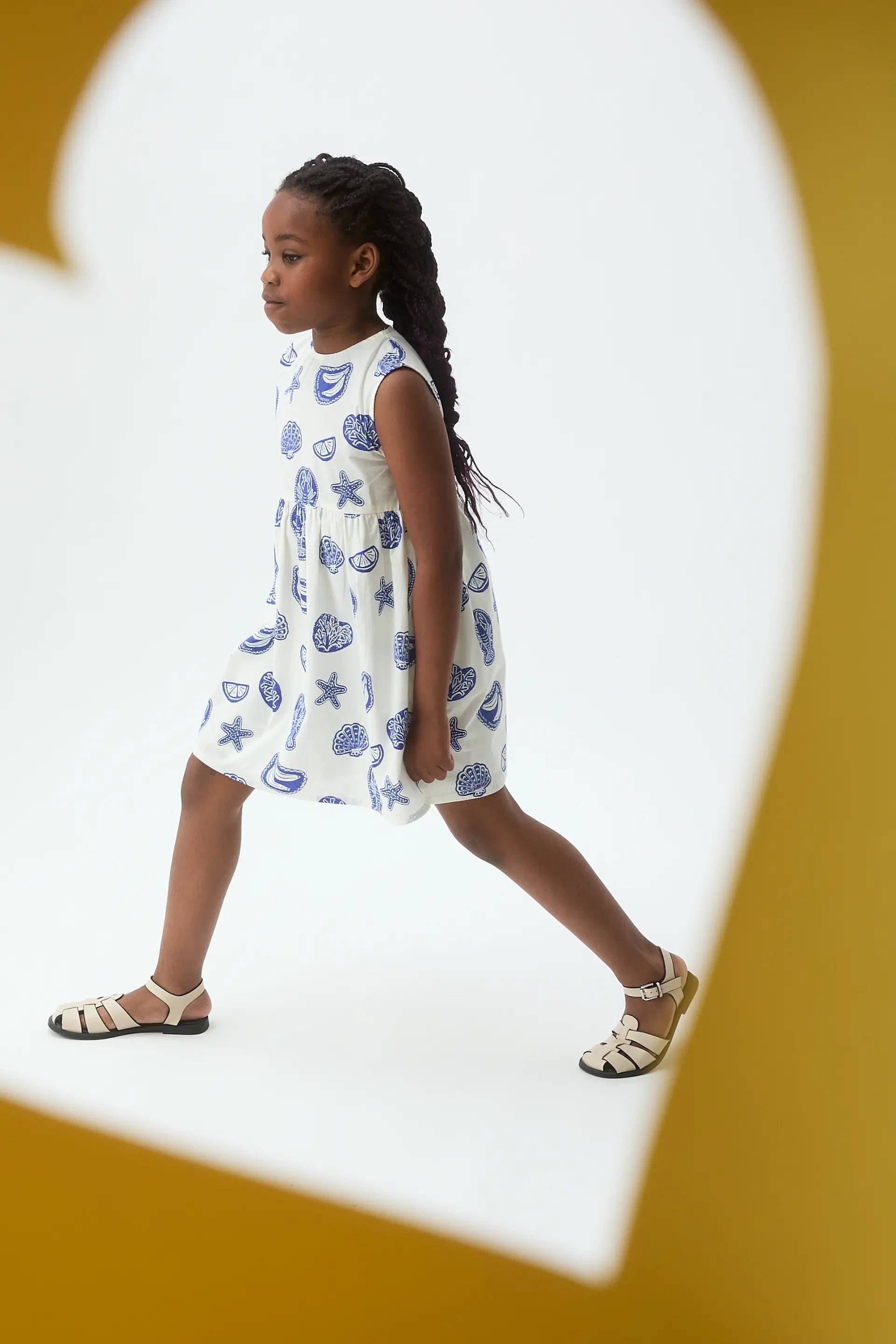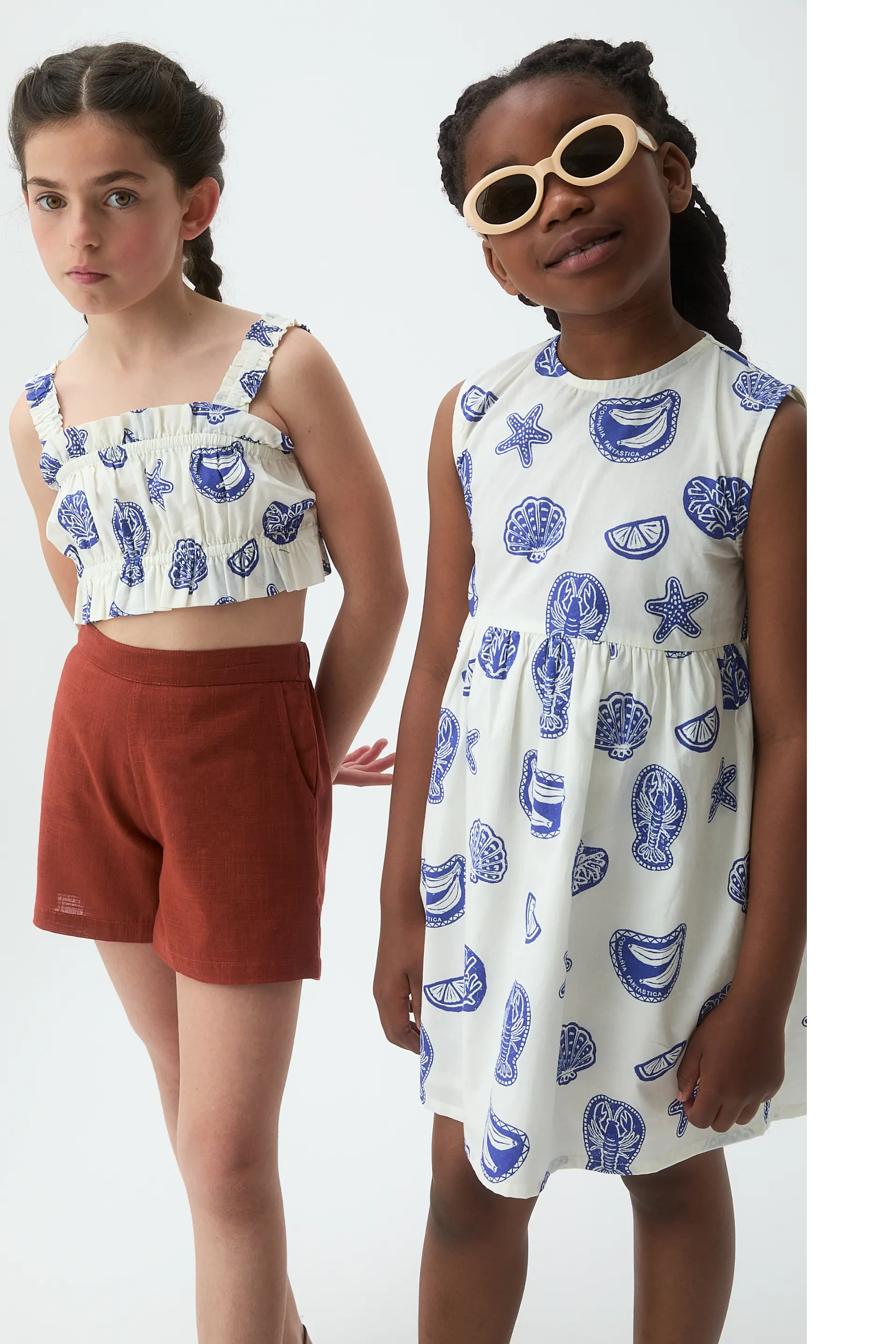 Vestido corto de niña con tejido 100% algodón de estampado lobster. Cuello redondo y sin mangas. Cintura elástica. Forro interior. La modelo mide 133 cm y lleva la talla 8-9 años.