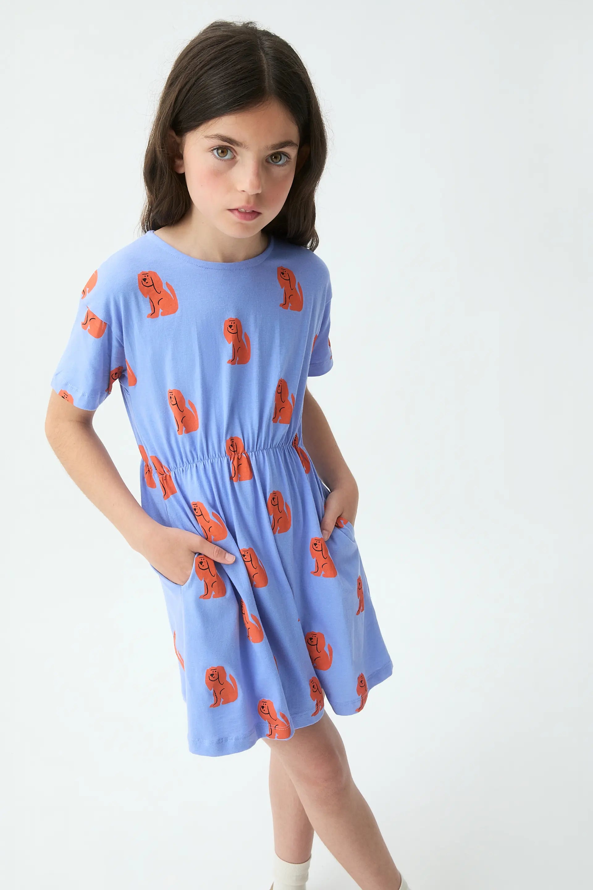 Vestido corto de niña de tejido 100% algodón de color azul con estampado de perrito. Cuello redondo y manga corta. Cintura elástica ajustable. La modelo mide 135 cm y lleva la talla 8-9 años.