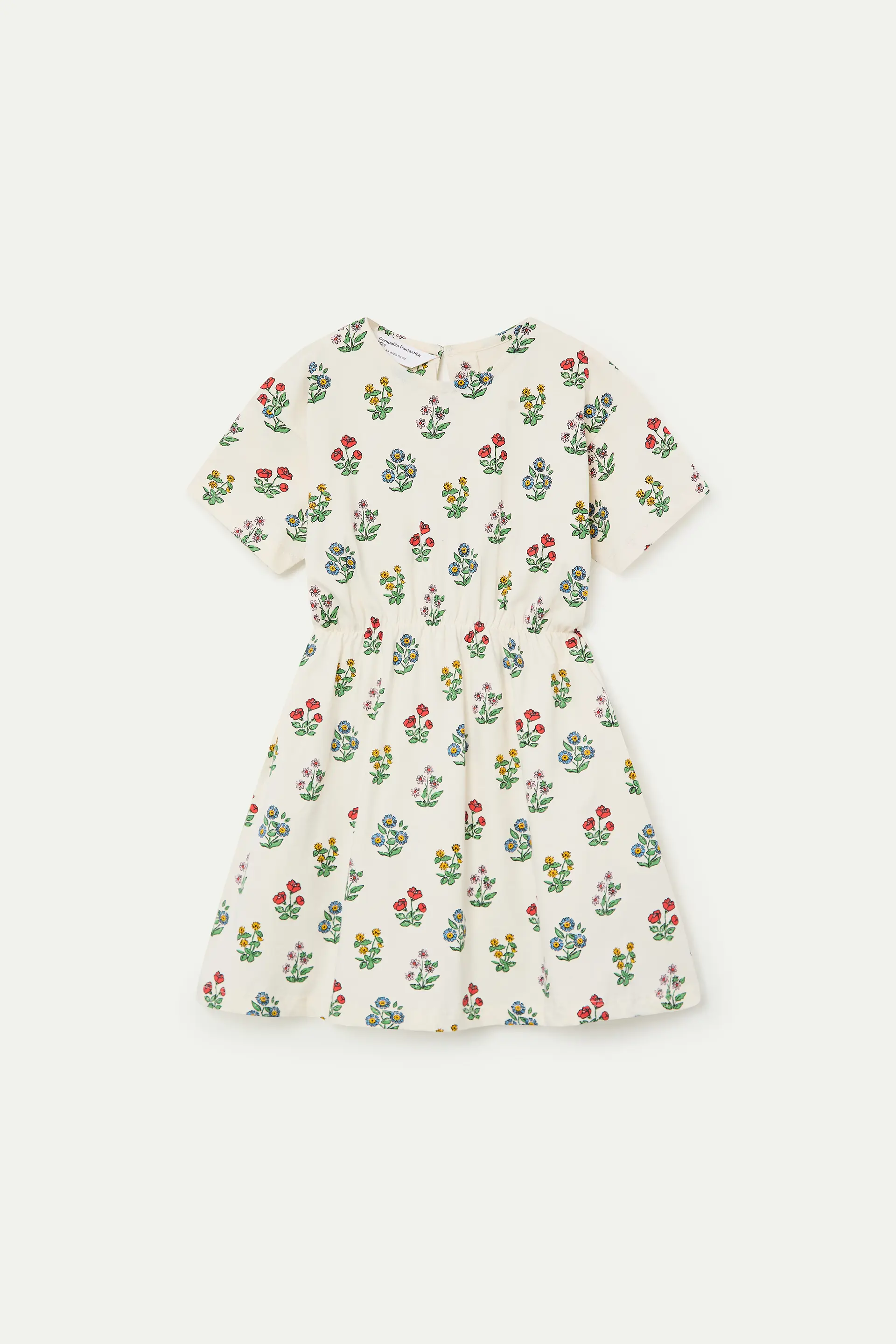 Vestido corto de niña de tejido 100% algodón con estampado gardener. Cuello redondo y manga corta. Cintura elástica. Bolsillos laterales. La modelo mide 135 cm y lleva la talla 8-9 años.
