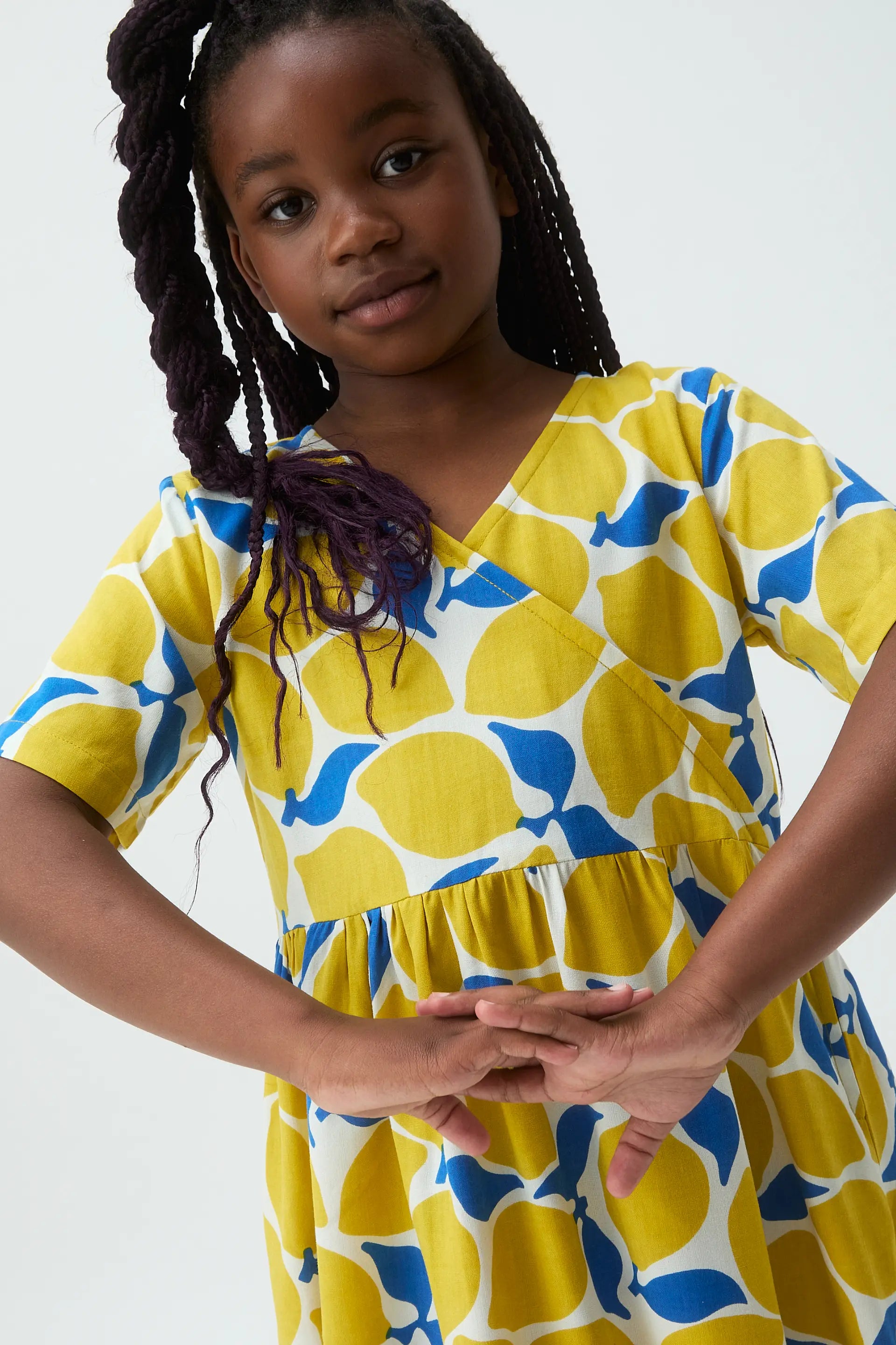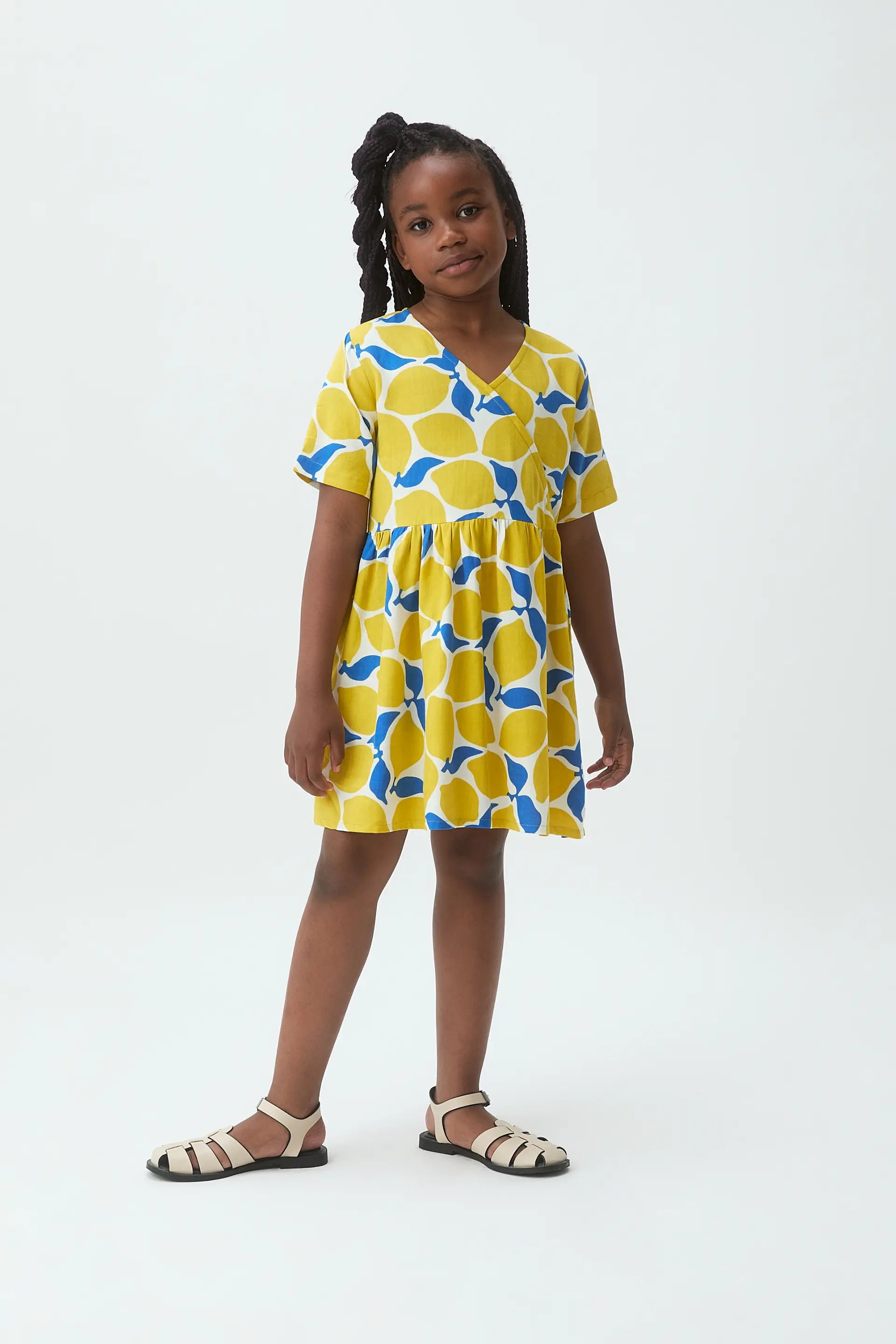 Vestido corto de niña con estampado limoncello. Con escote cruzado y manga corta. Cintura fija elástica. La modelo mide 133 cm y lleva la talla 8-9 años.