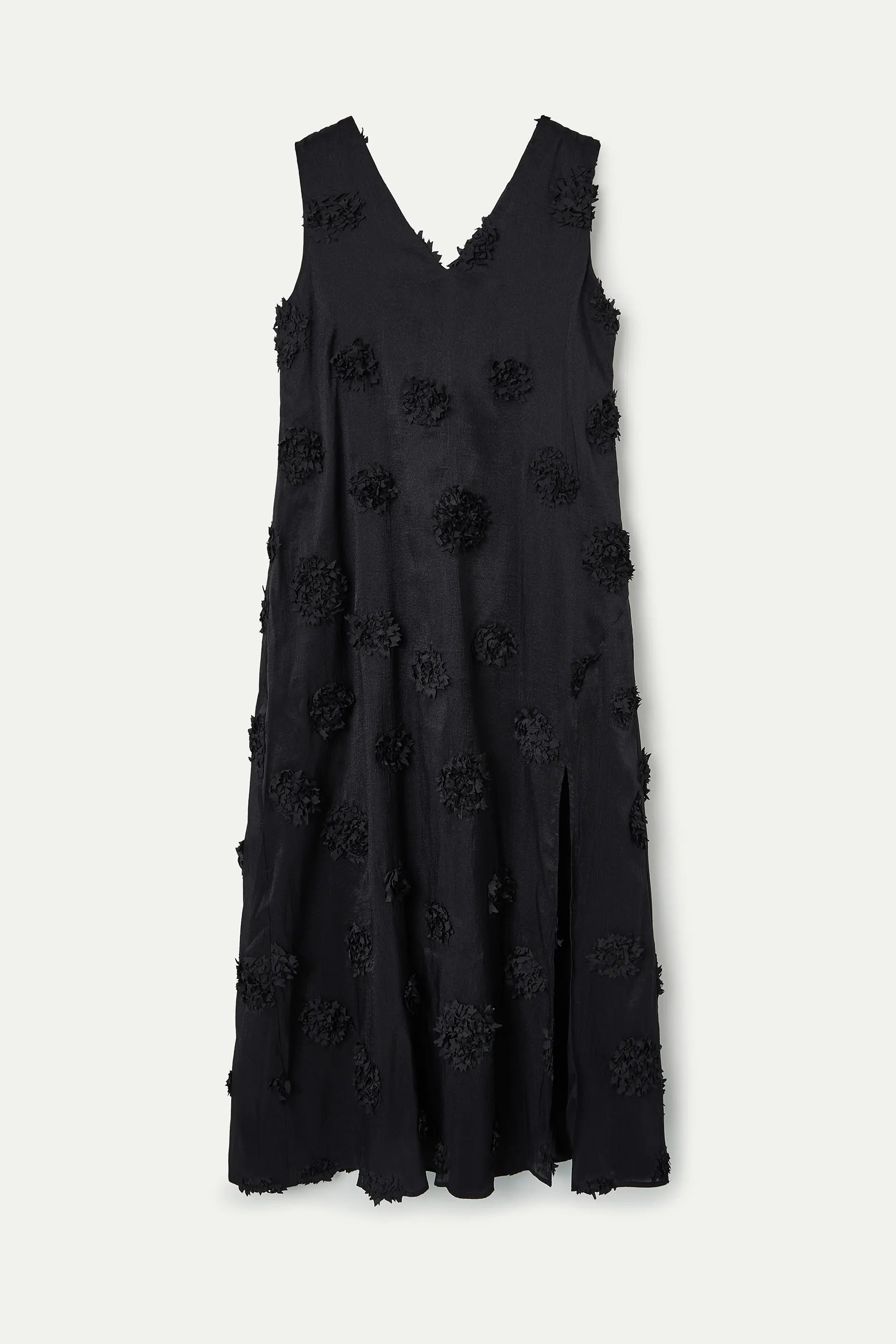 Vestido largo de tejido chifón de color negro. Escote de pico y sin mangas. Abertura lateral. Detalle floral en contraste color en negro. Forro interior. La modelo mide 177 cm y lleva la talla S.