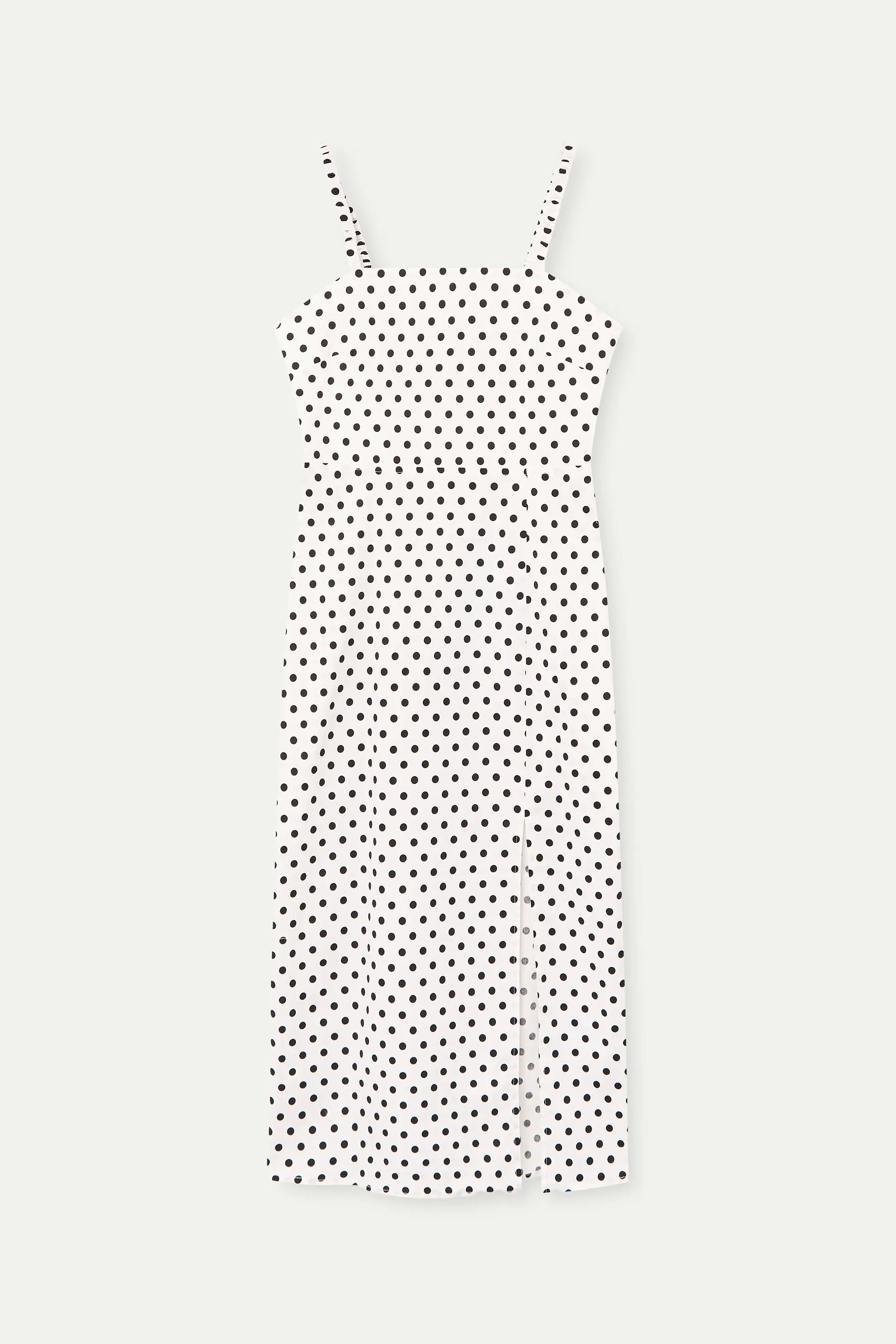 Vestido midi de tejido 95% algodón con estampado de puntos negros. Escote recto y tirantes. Abertura lateral. Cierre posterior con cremallera oculta. La modelo mide 175 cm y lleva la talla S.