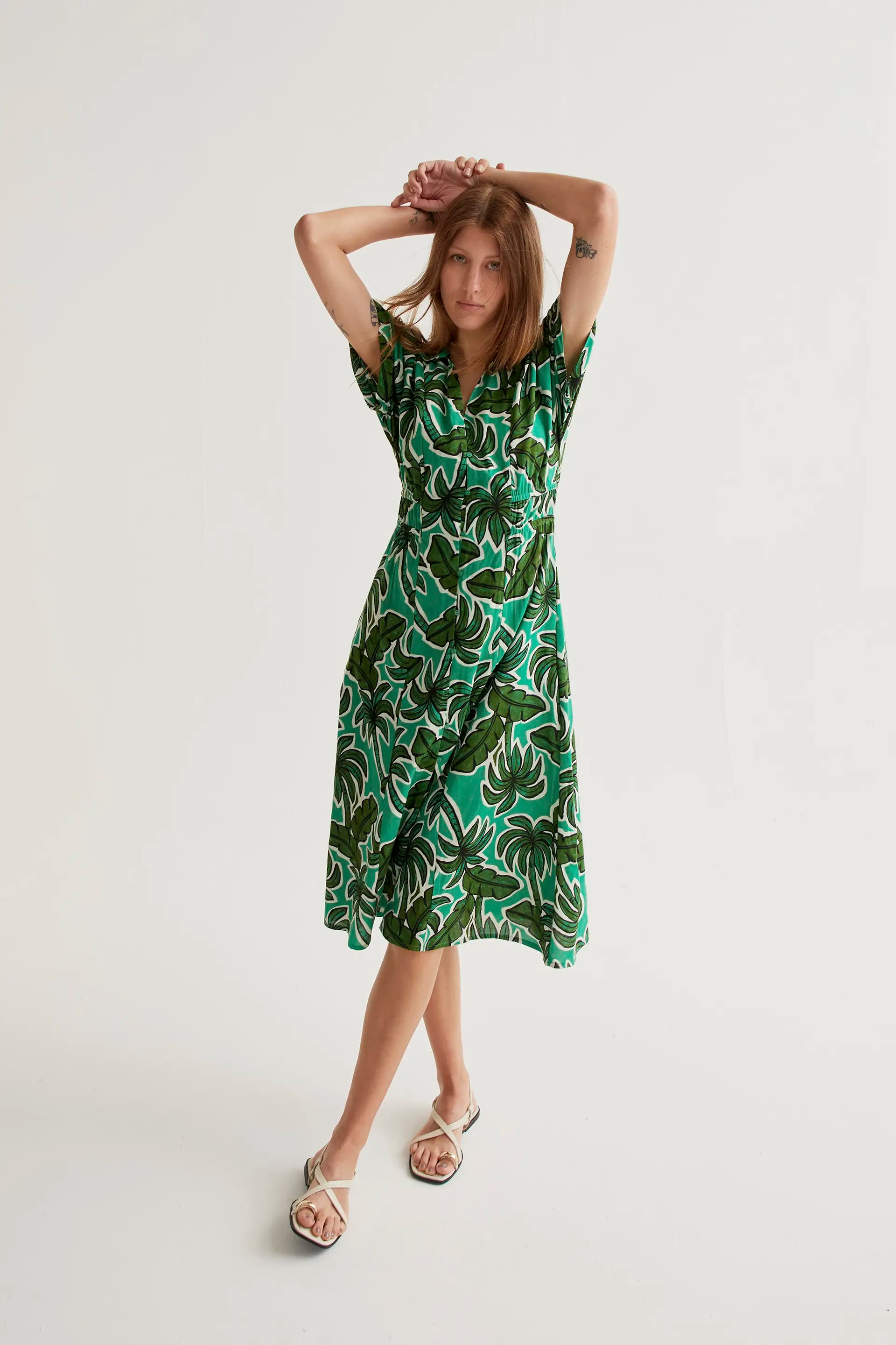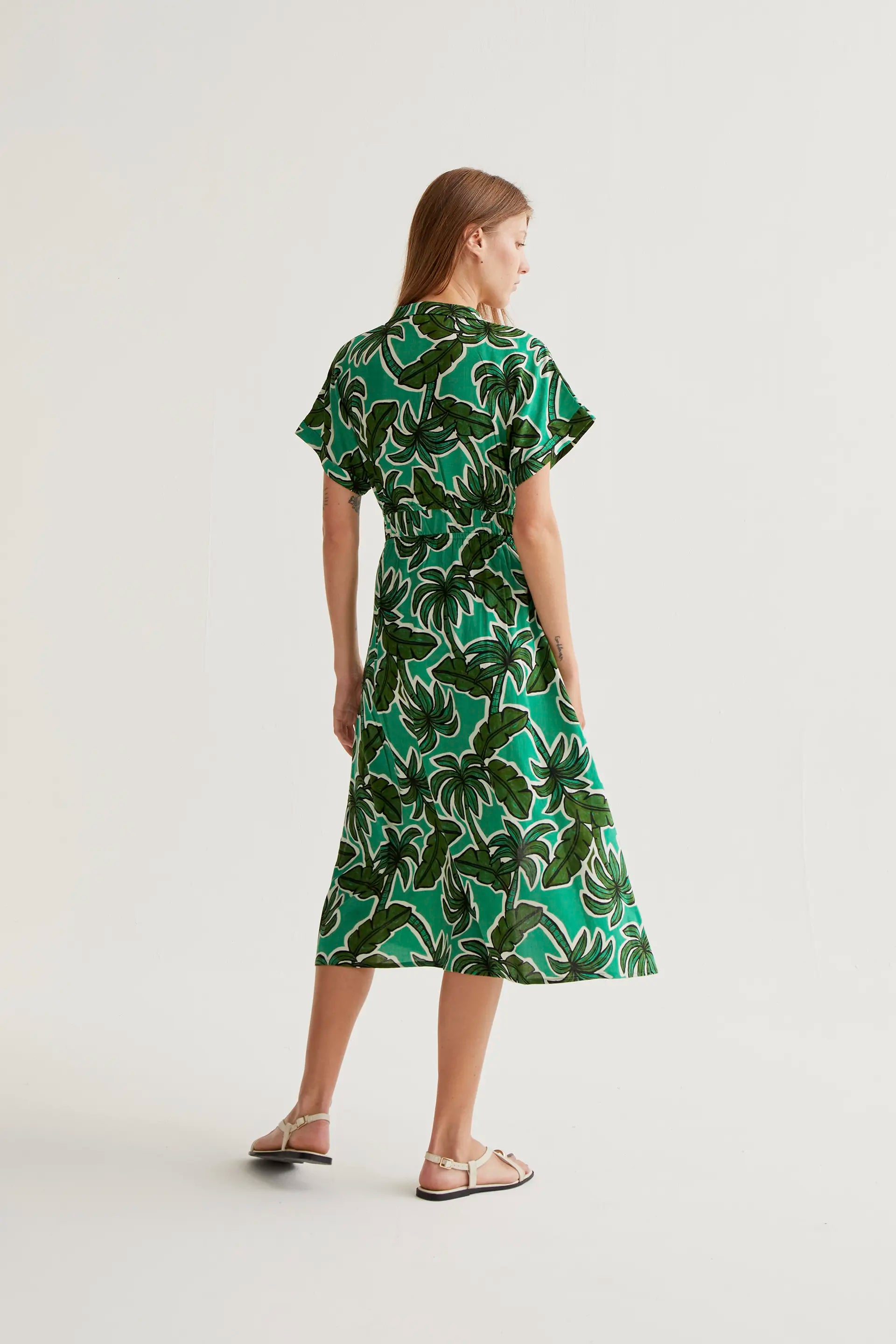 Vestido midi con estampado palm tree. Cuello solapa y escote pico. Manga corta y cierre frontal con botones de color verde. Detalle elástico en cintura. Bolsillos laterales. La modelo mide 177 cm y lleva la talla S.