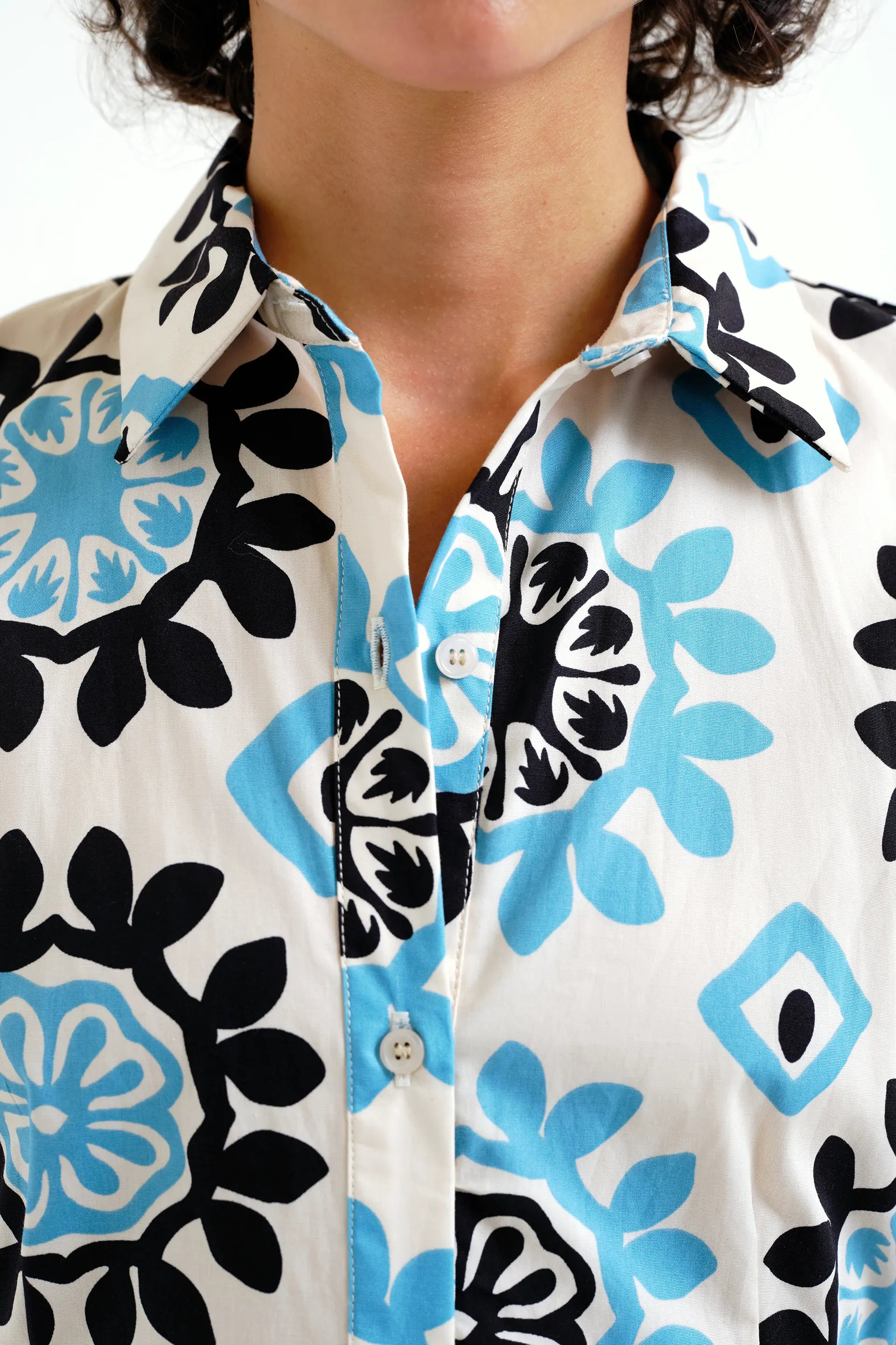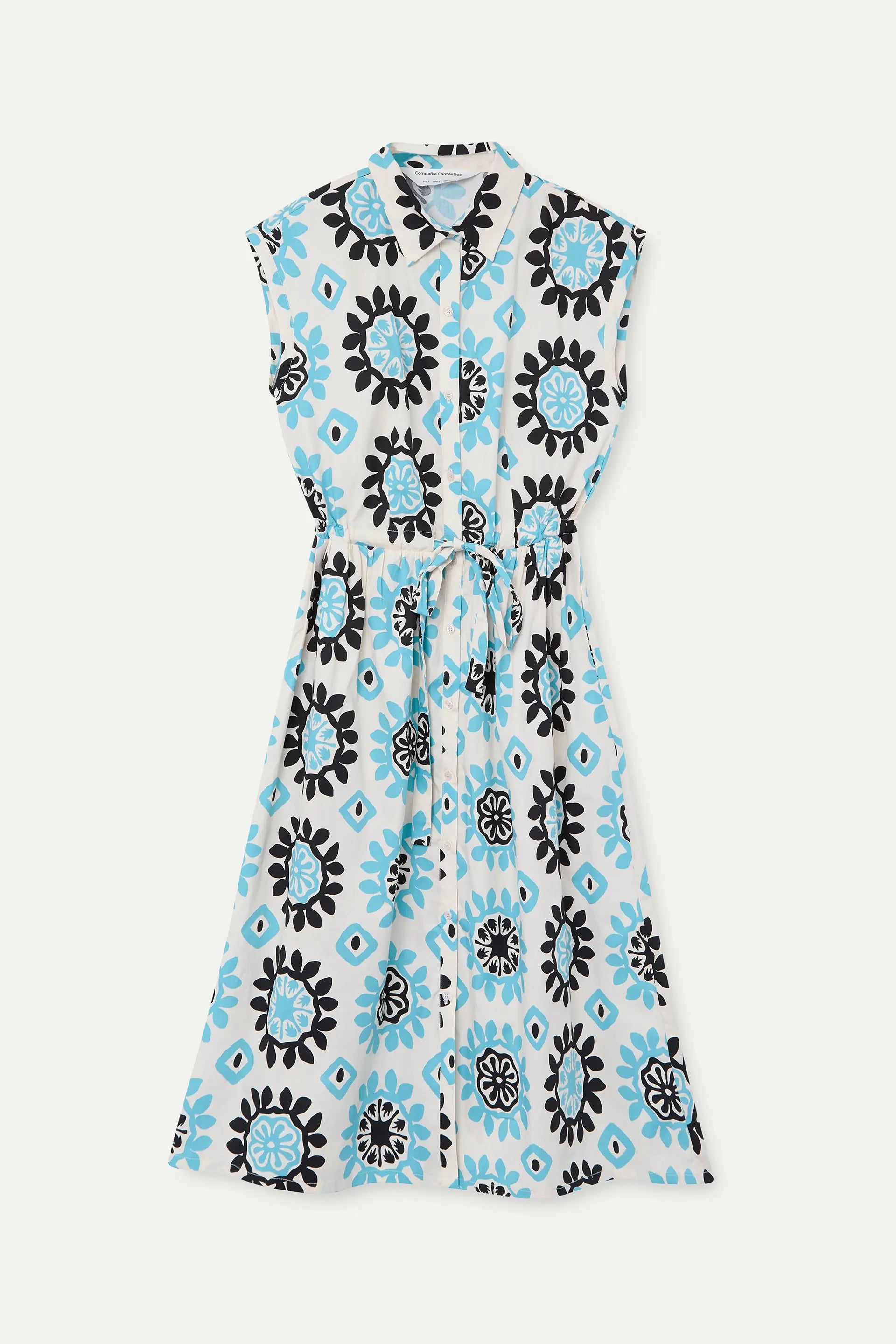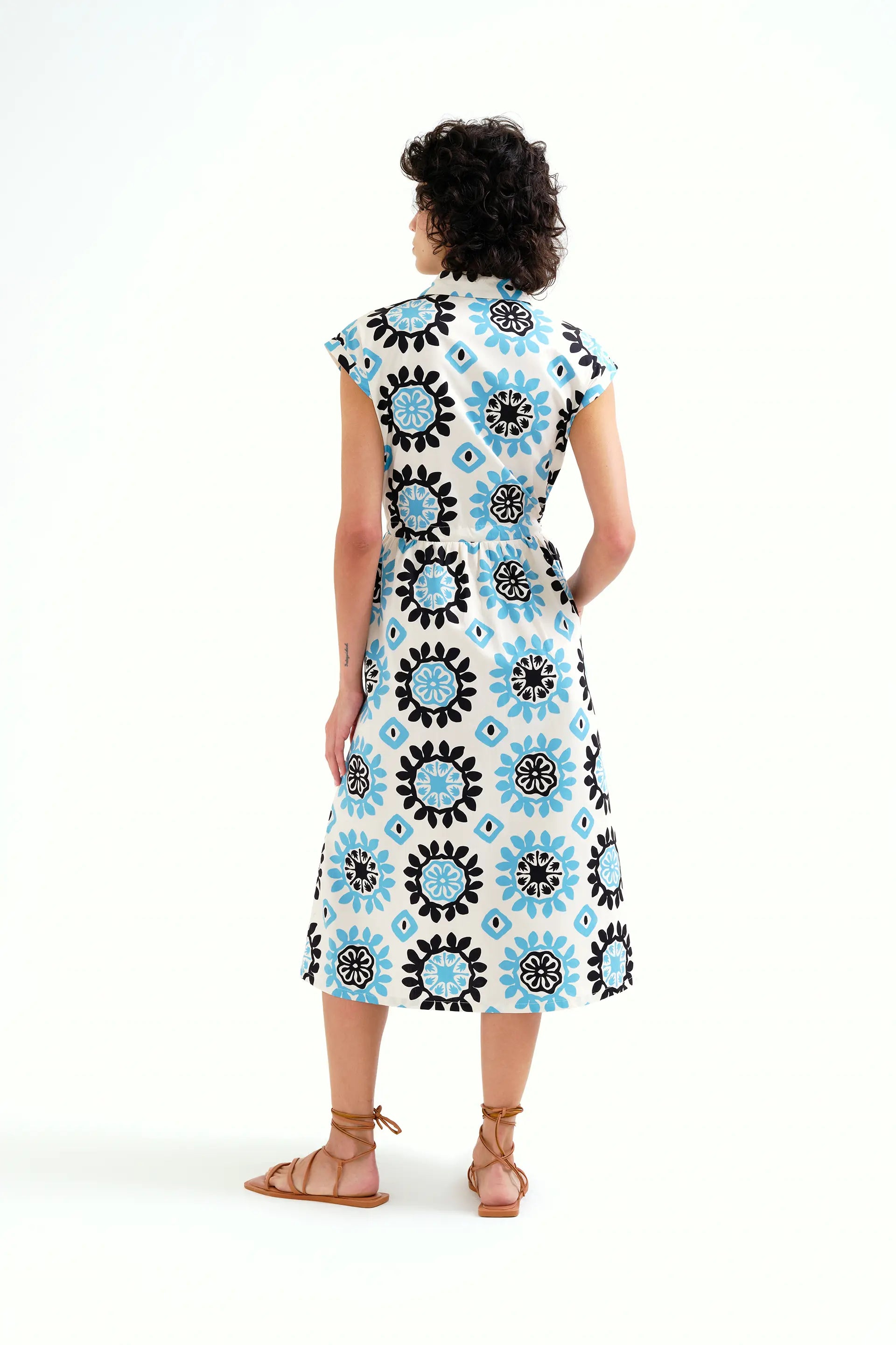Vestido midi de tejido 100% algodón con estampado waterfall. Cuello solapa y sin mangas. Cierre frontal con botones blancos. Ajuste en cintura con cordones. La modelo mide 175 cm y lleva la talla S.