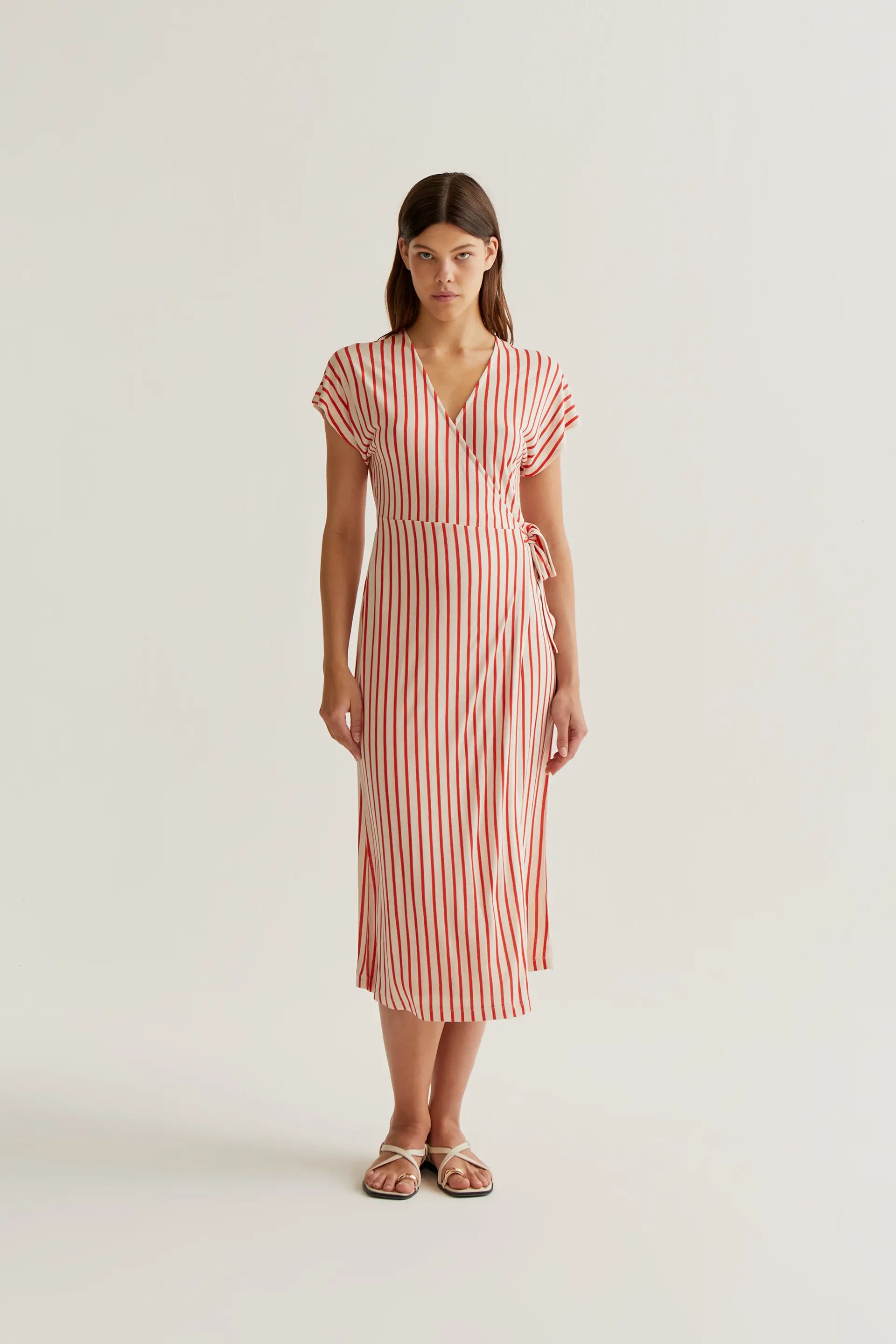 Vestido midi de tejido jersey con estampado de rayas de color rojo. Escote pico y manga corta. Cierre con detalle lazado en cintura. La modelo mide 177 cm y lleva la talla S.