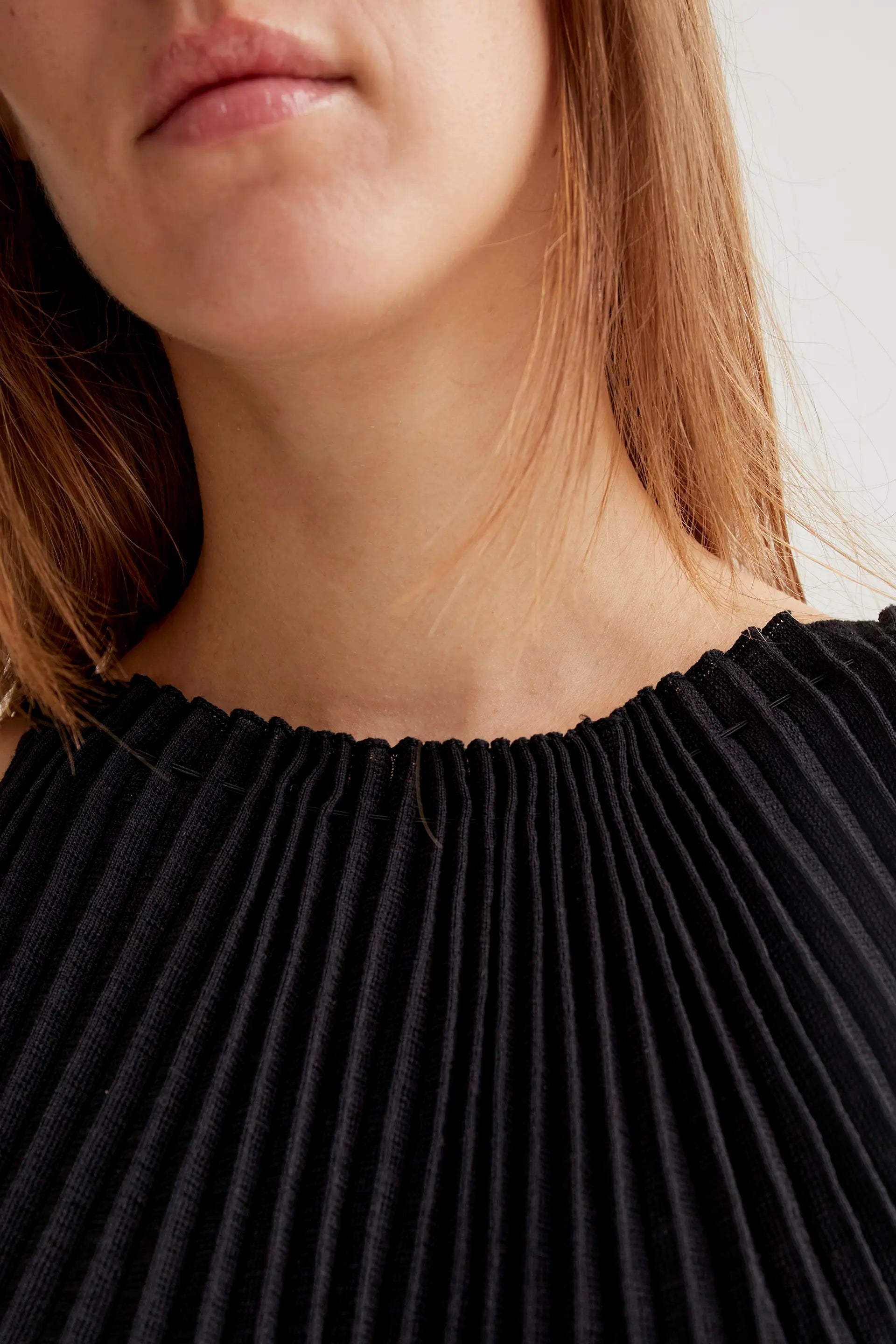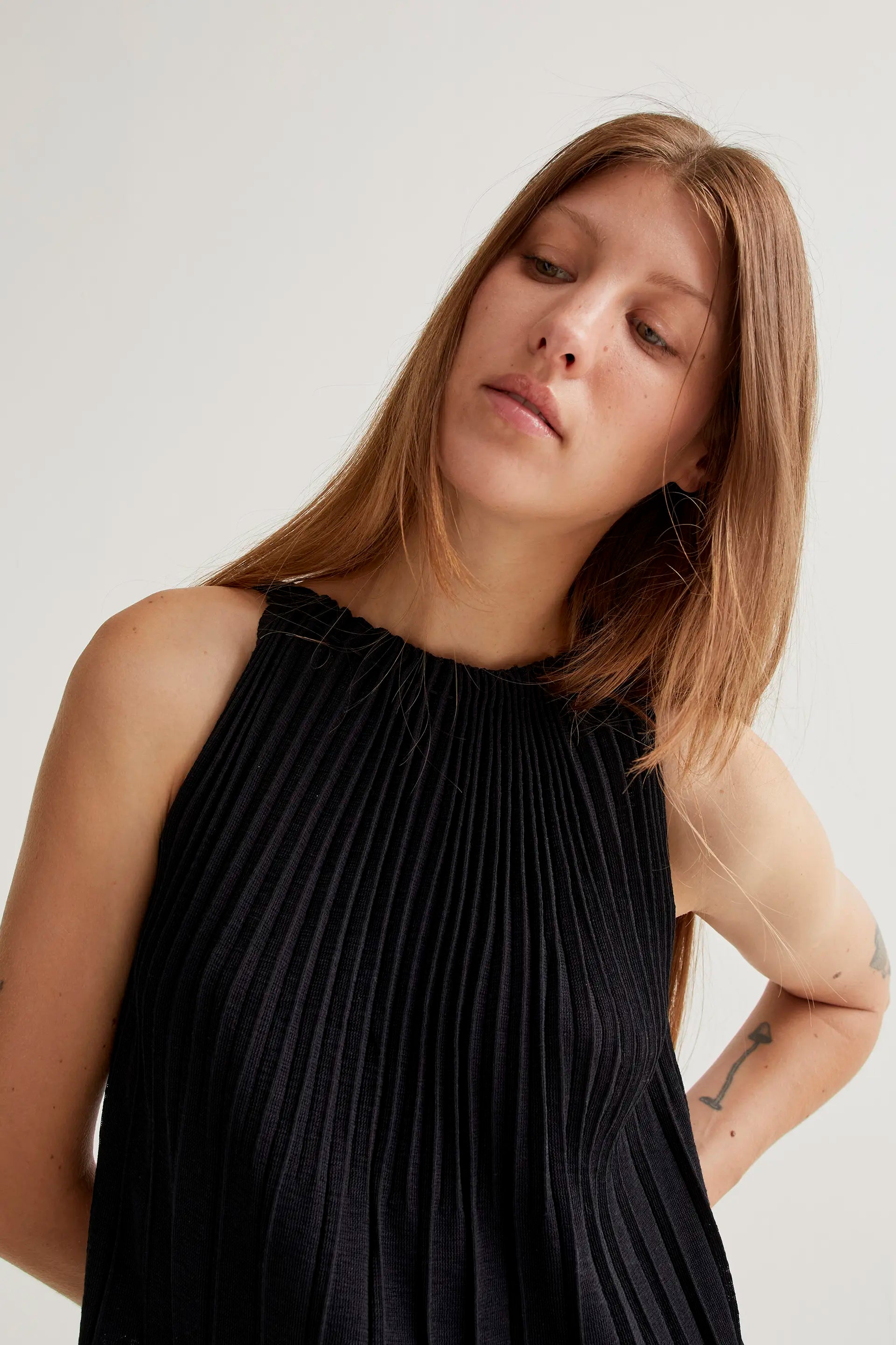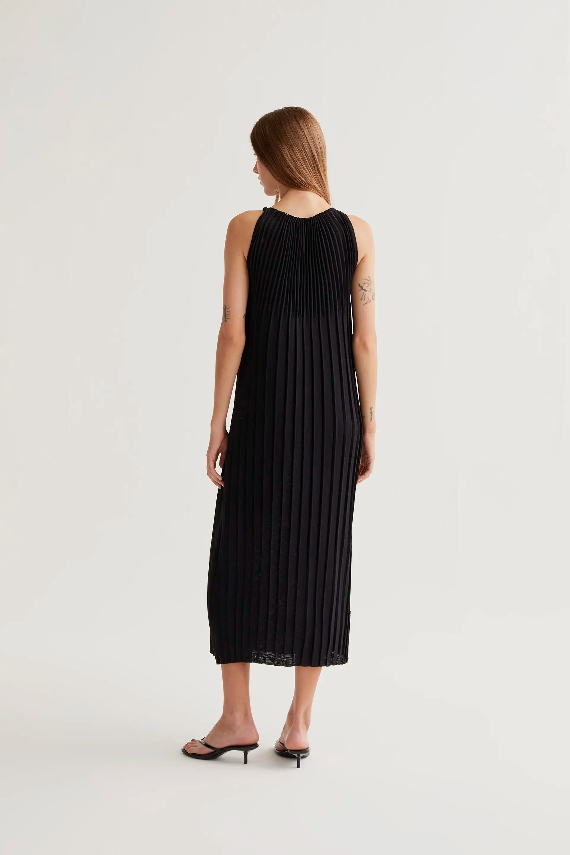 Vestido largo con tejido de punto plisado de color negro. Cuello halter y sin mangas. La modelo mide 177 cm y lleva la talla S.